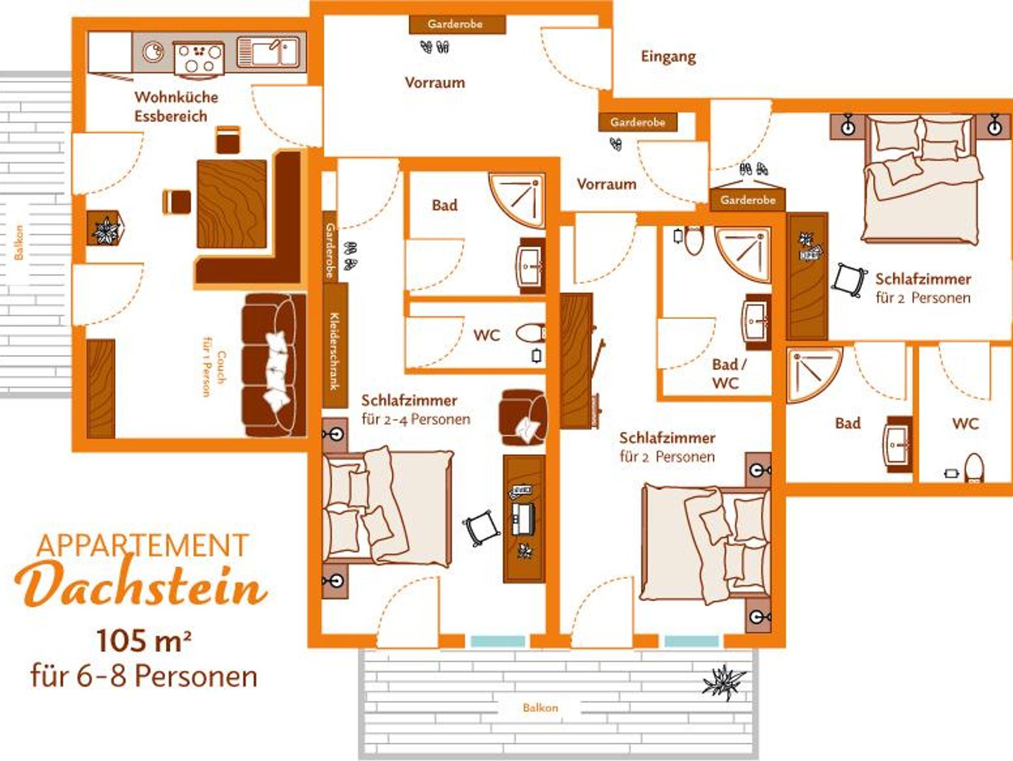 Appartement für 6-8/9 Pers. mit 105m² ( 1 Wohnküche / 3 Schlafzimmer / 3 Bäder )