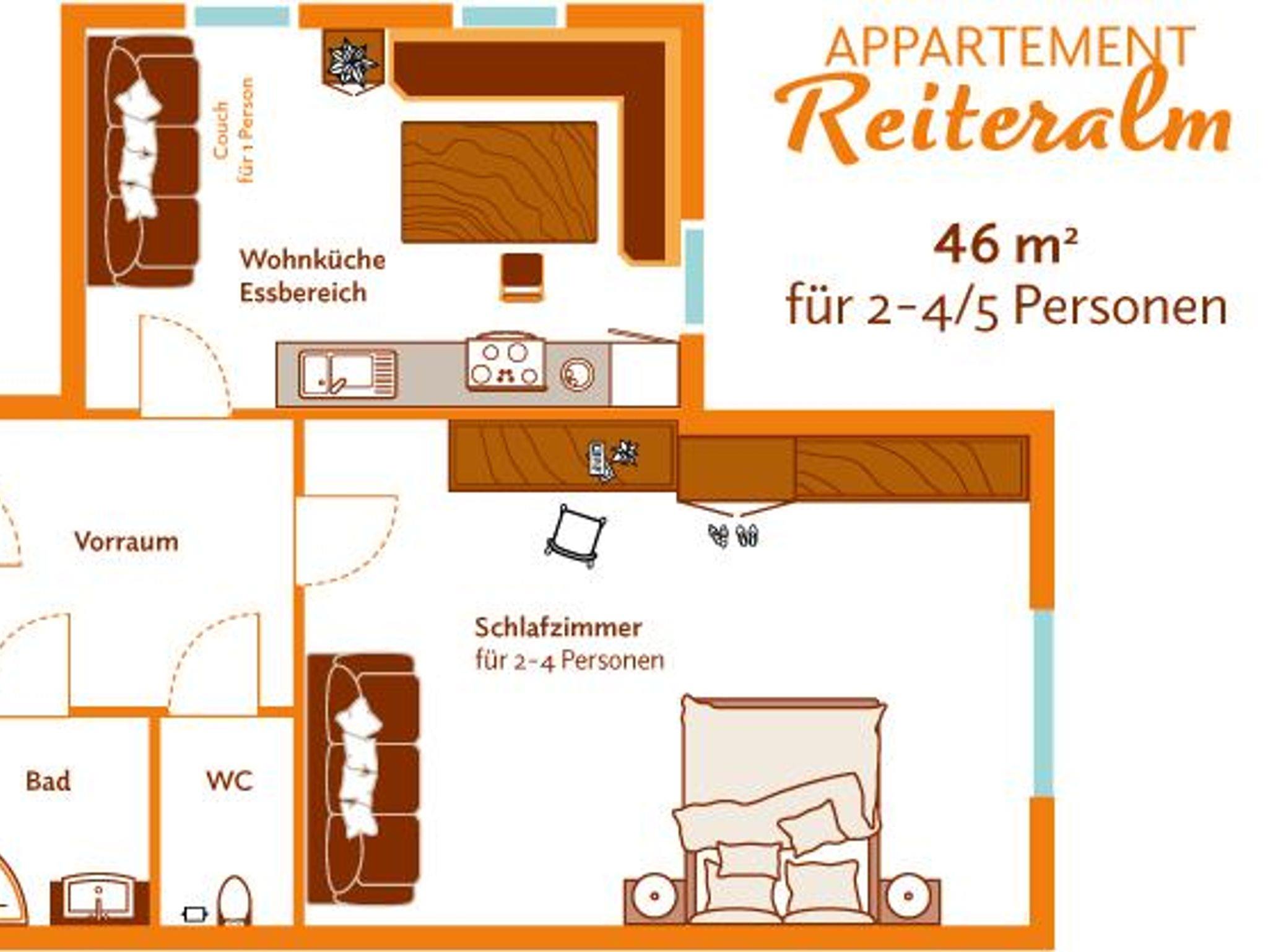 Appartement für 2-4/5 Pers. mit 46m² ( 1 Wohnküche / 1 Schlafzimmer / 1 Badezimmer)