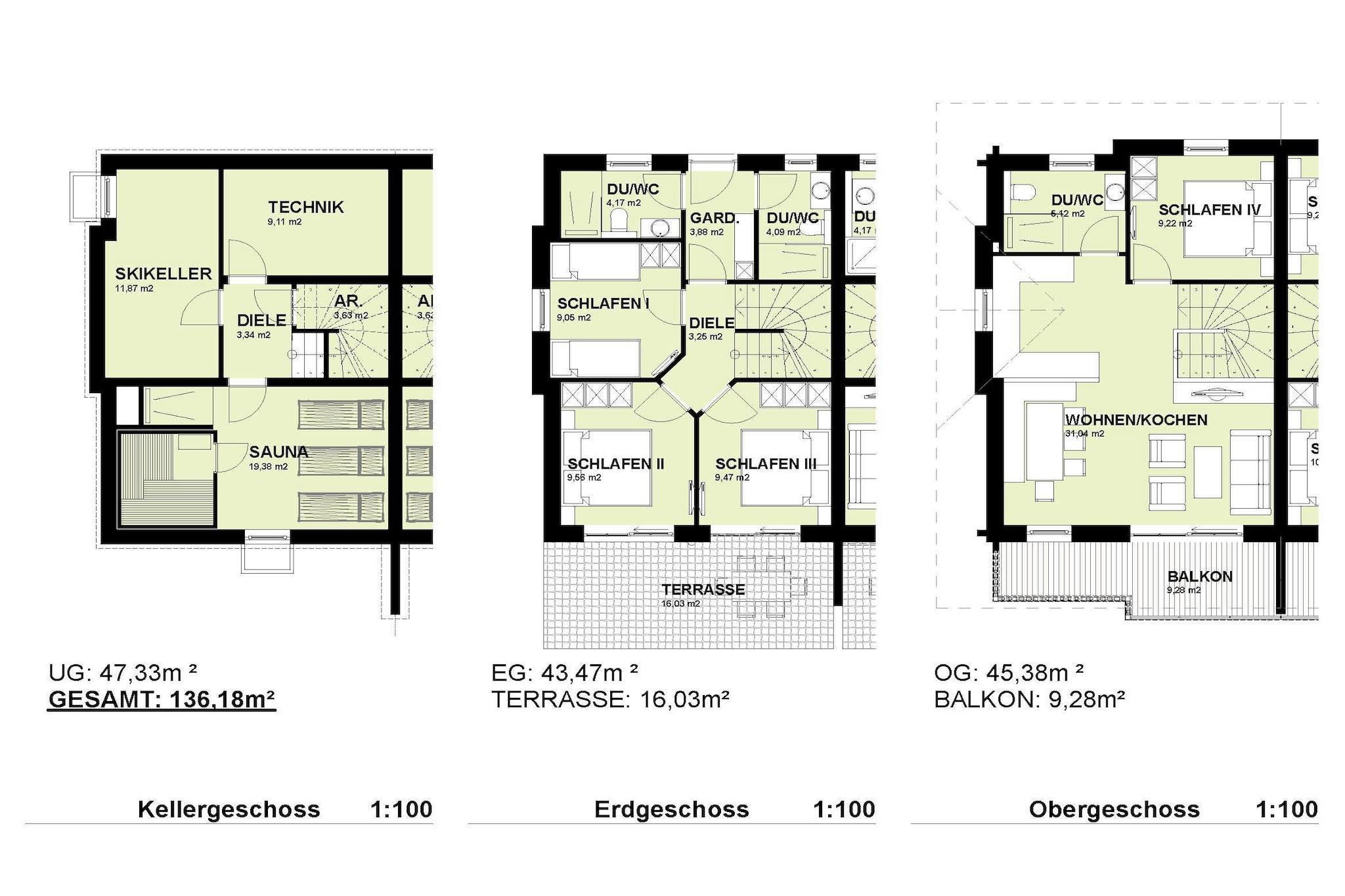 Parterre: (Schlafzimmer(Doppelbett, TV, Terrasse), Schlafzimmer(Doppelbett, TV, Terrasse), Schlafzimmer(Etagenbett, Etagenbett), Badezimmer(Dusche, Waschbecken, Toilette), Terrasse) In der 1. Etage: (Wohnzimmer(TV, Balkon), offene Küche(Kochherd, Spülmaschine, Tiefkühlschrank, Kühl-/Gefrierkombination), Schlafzimmer(Doppelbett, TV), Badezimmer(Dusche, Waschbecken, Toilette)) Keller: (Ruheraum(Sauna, Toilette, Liegestühle), Skikeller) Freizeitraum, Kaffeemaschine, Babybett, Waschmaschine, Skischuhheizung, Garten, Liegen, Parkplatz, Bügelbrett, Gesellschaftsspiele
