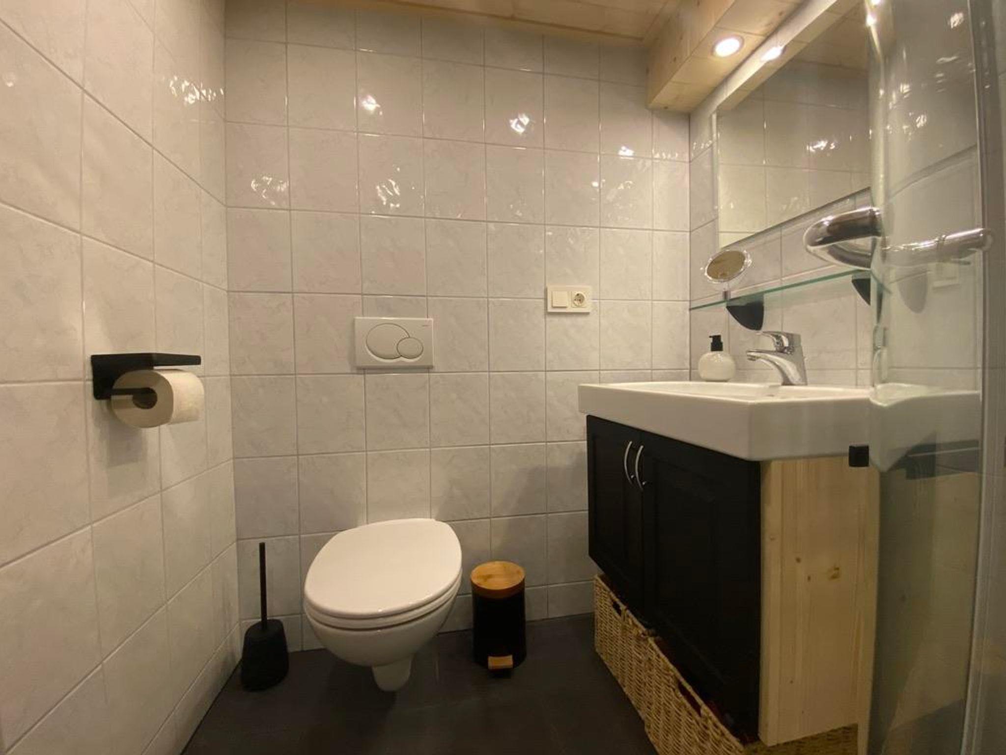 Badezimmer; das Badezimmer verfügt über eine Duschkabine, ein Waschbecken, ein Schrank, einen Haartrockner und eine Toilette. Badetücher sind inklusive.