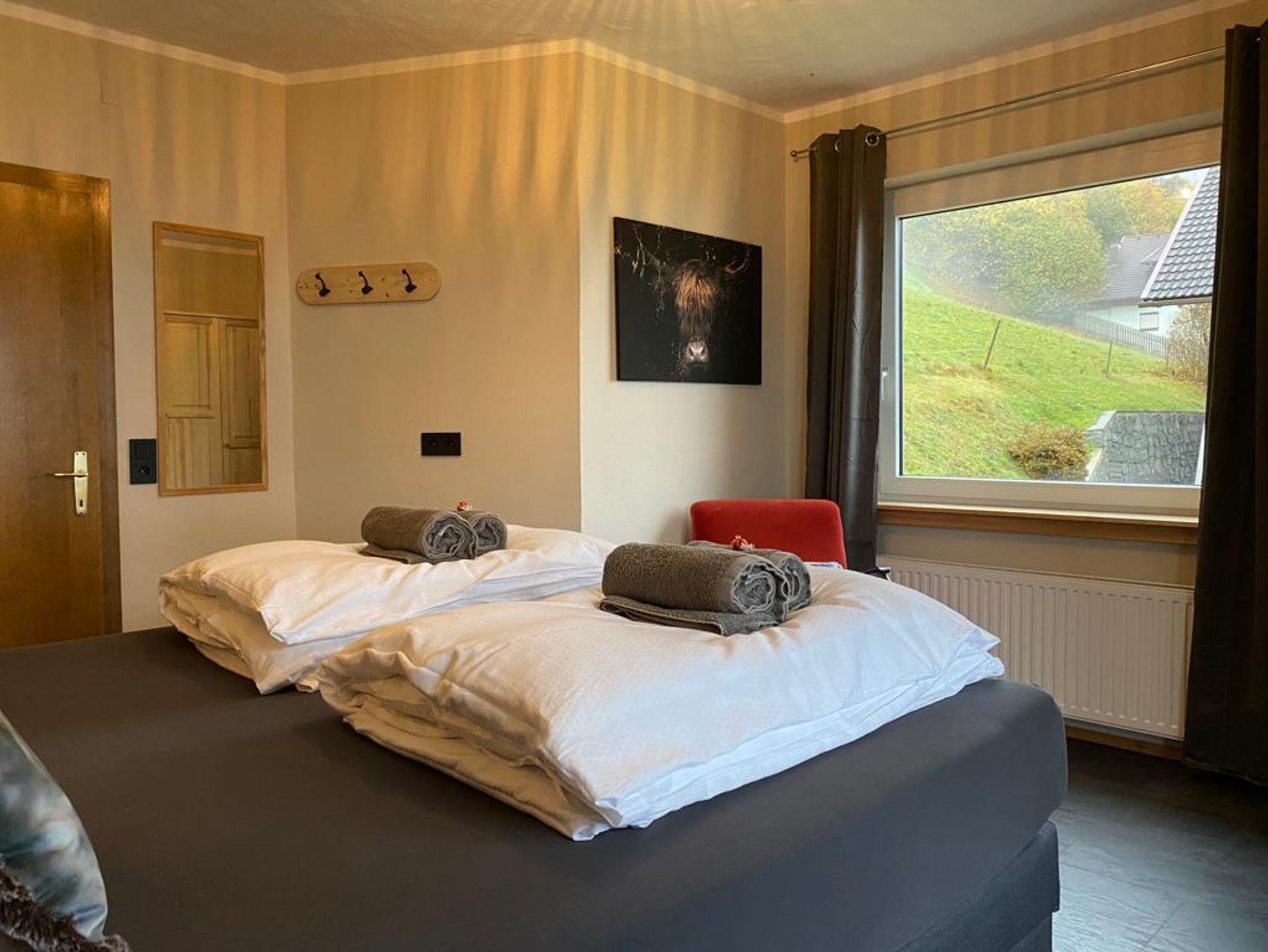 Schlafzimmer eins; im Schlafzimmer finden Sie ein King Size Boxspringbett (1,80 Meter breit) und ein Kleiderschrank. Vom Schlafzimmer aus haben Sie einen wunderschönen Blick über das Tal, den Brennsee und die Berge. Durch die Terrassentüren betreten Sie den großzügigen Sudbalkon. Bettwäsche ist inklusive.