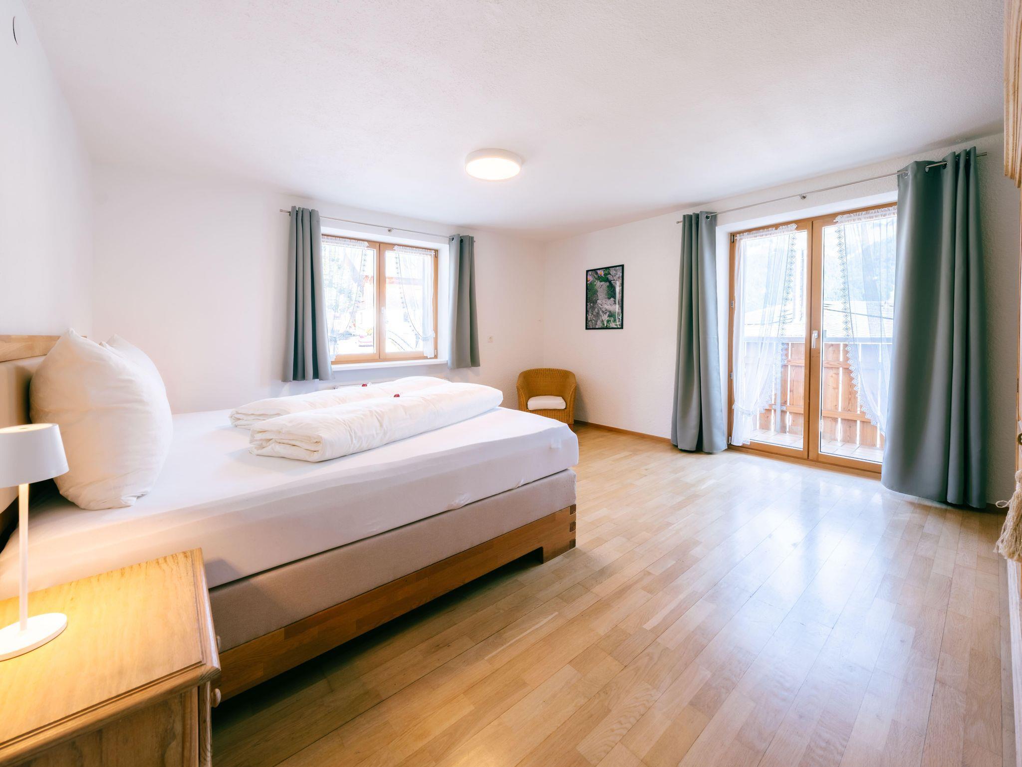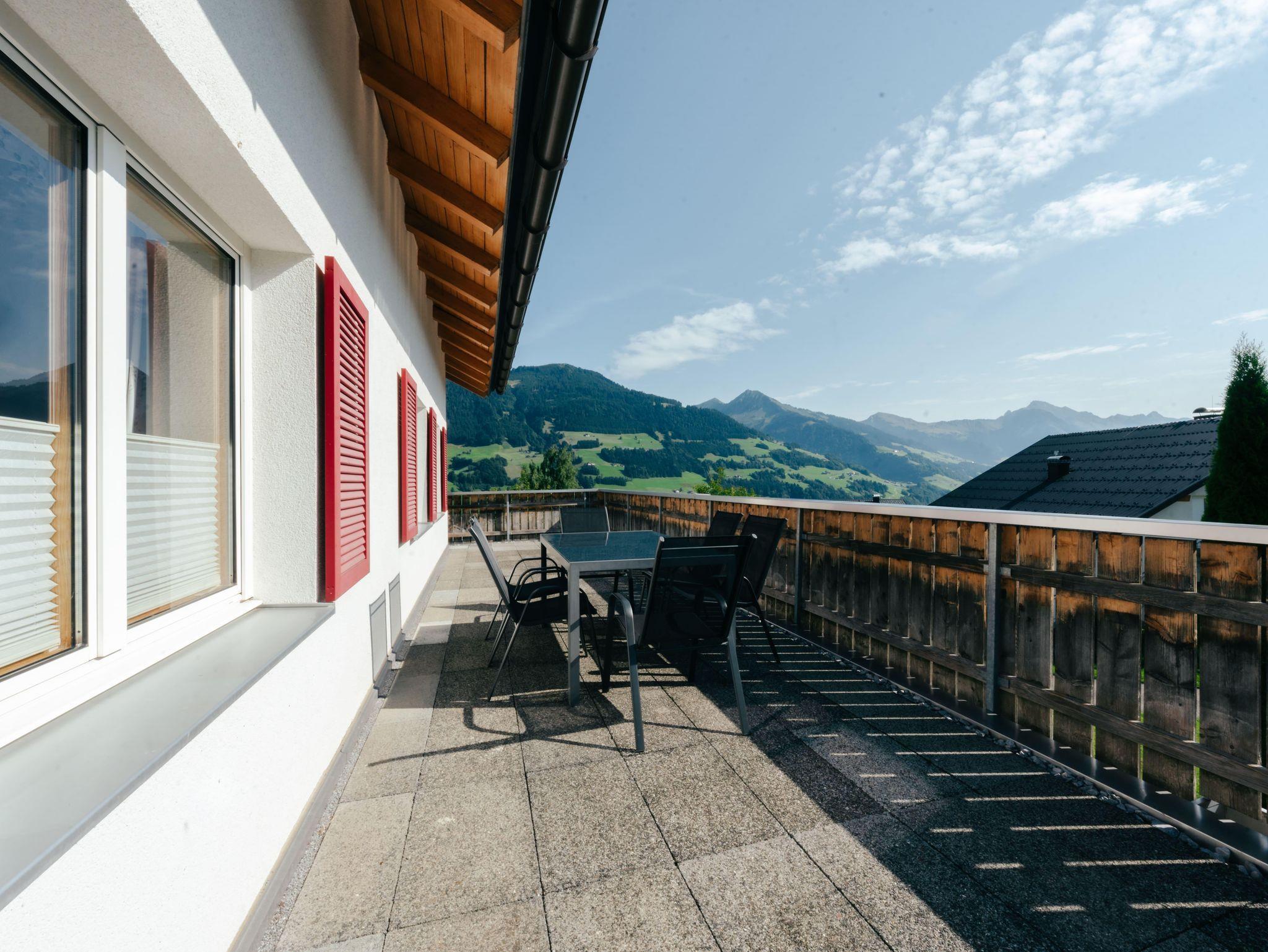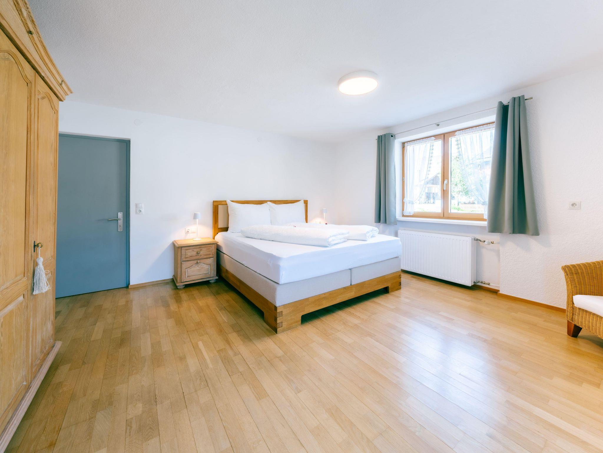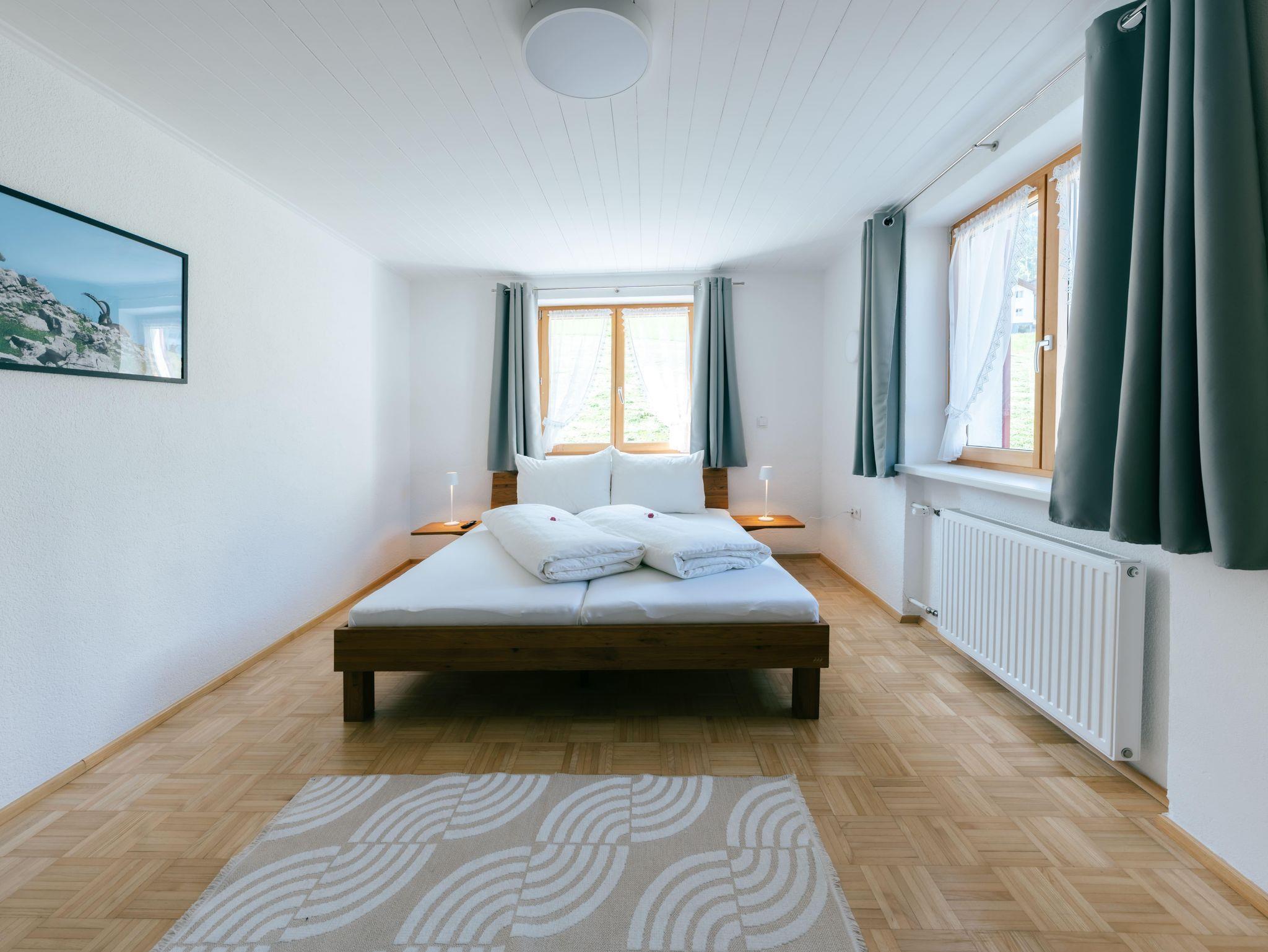 Die Wohnung verfügt über 5 gemütliche Schlafzimmer, ein einladendes Wohnzimmer sowie eine große Terrasse und Balkone, die sich über drei Hausseiten erstrecken. Genießen Sie hier die herrliche Ruhe, frische Bergluft und den Blick in die Natur.