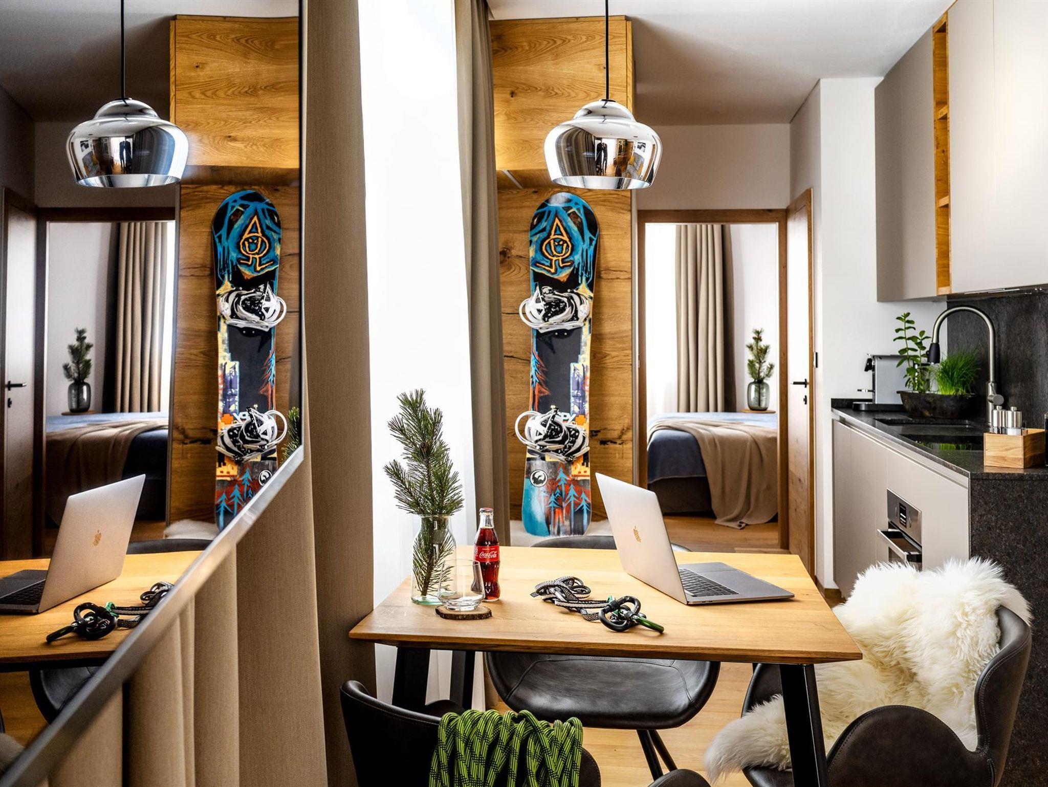 Die 11 Design Apartments im Alpine-Metropolitan Stil spiegeln unsere Liebe zum Detail wieder und strahlen alpine Gemütlichkeit aus. Alle Apartments sind mit privatem W-LAN, Smart-TV, voll ausgestatteter Küche, großem Balkon bzw Terrassen, Klimaanlage und gemütlichen Wohn- und Essbereich ausgestattet. Parkplätze stehen frei zur Verfügung.
