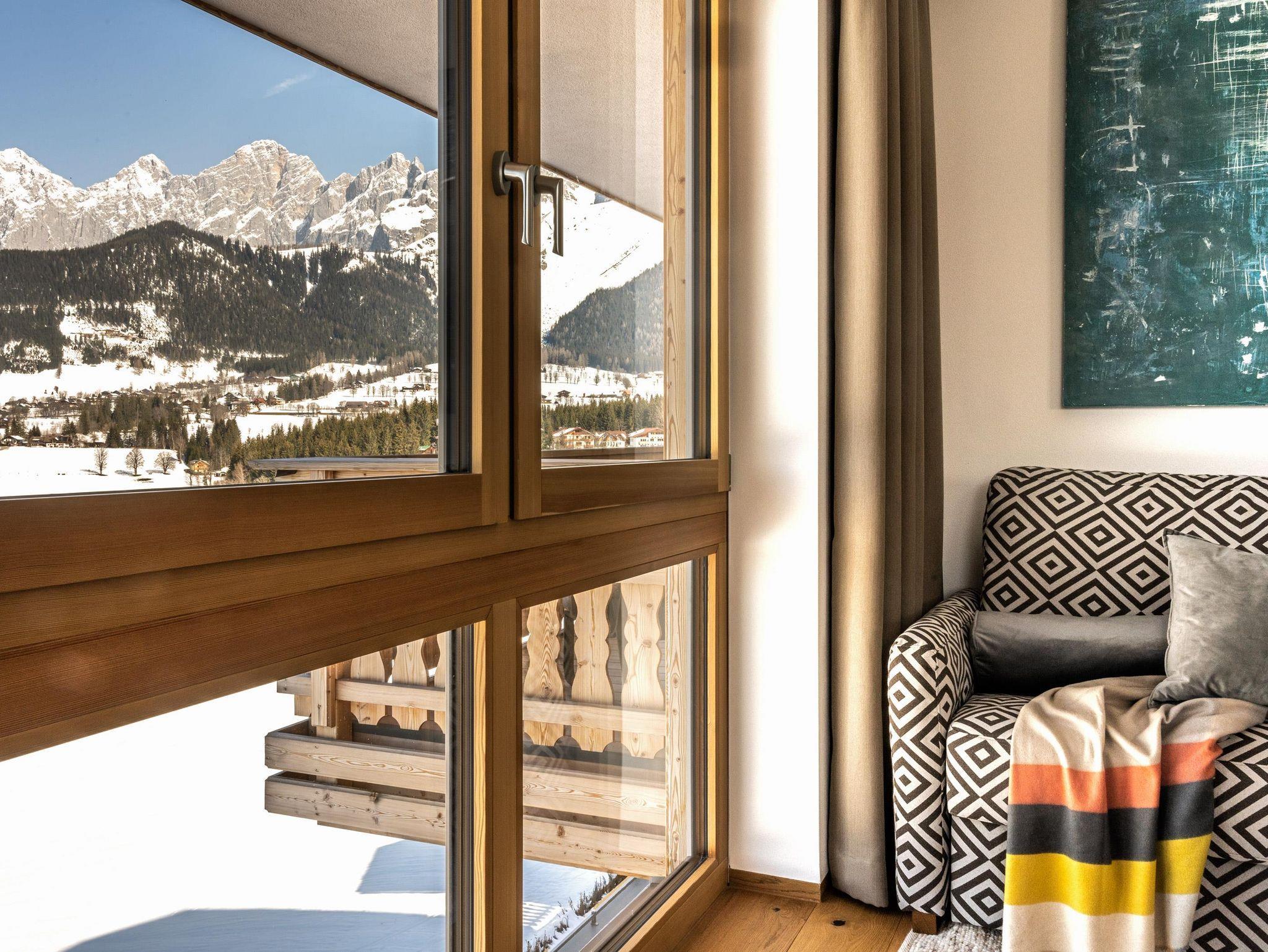 Hochwertigste Materialien treffen im Alpine-Cosmopolitan Design auf eine atemberaubende Aussicht auf die Niederen Tauern und das Dachsteinmassiv. Die Ost-Süd-West-Ausrichtung des Apartments bietet Sonnenschein von Sonnenaufgang bis –untergang.