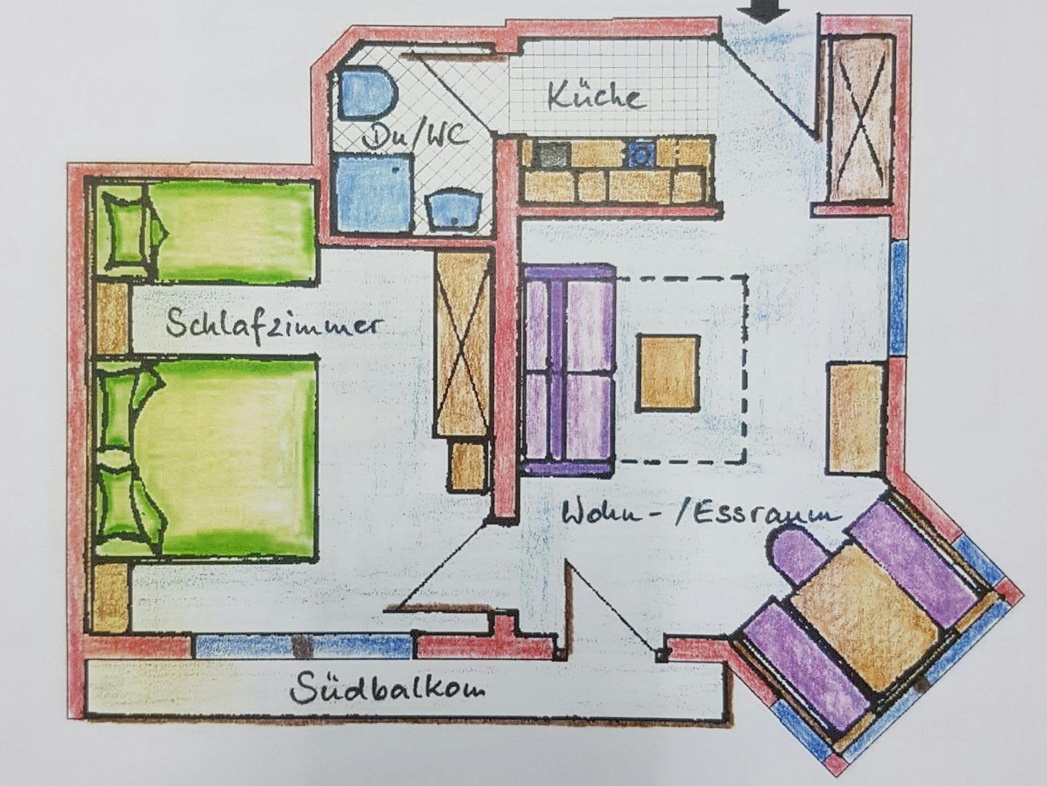 Schlafzimmer, Wohnraum, Küchenzeile, Dusche/WC, großer Südbalkon, Vorraum