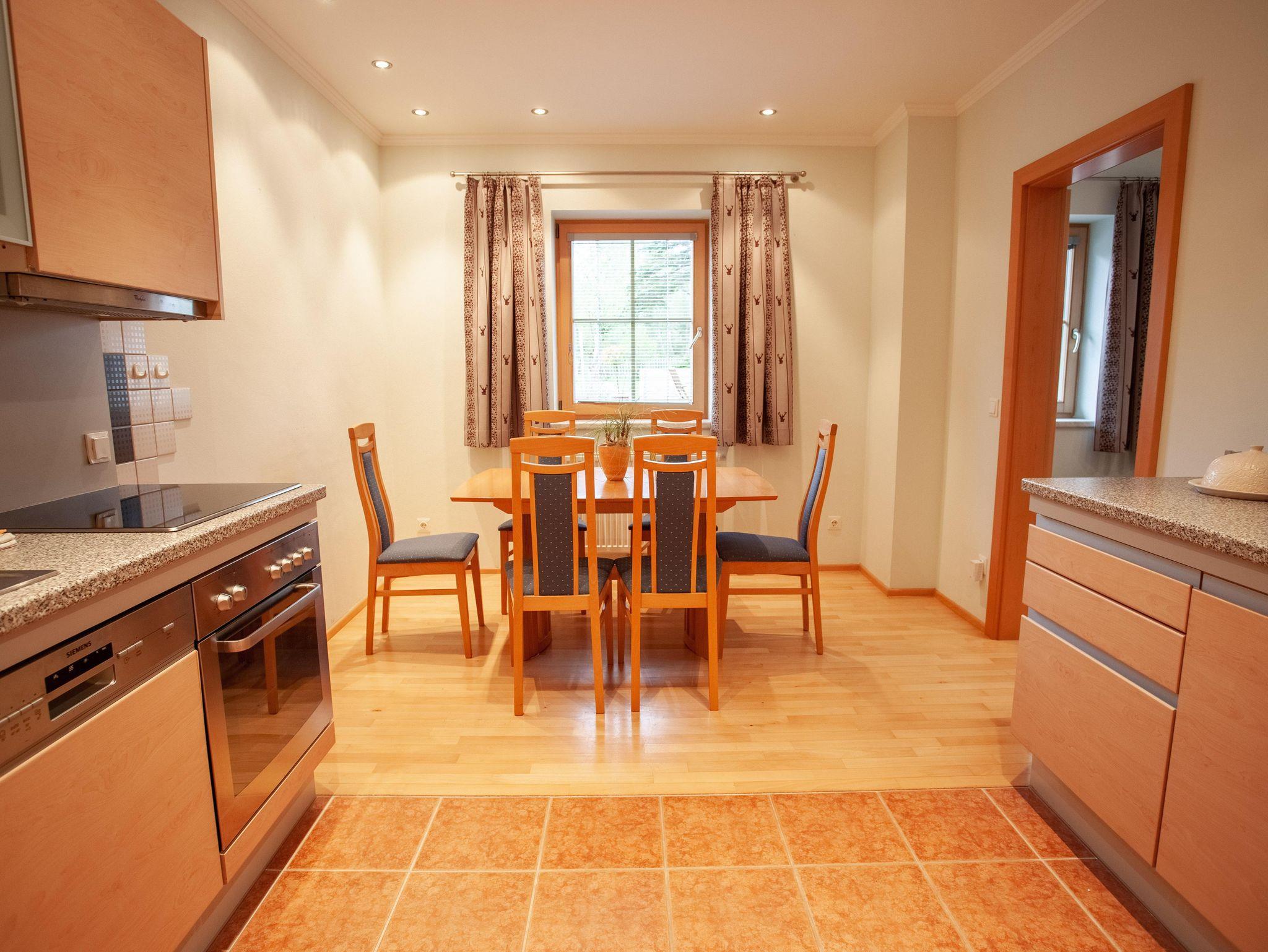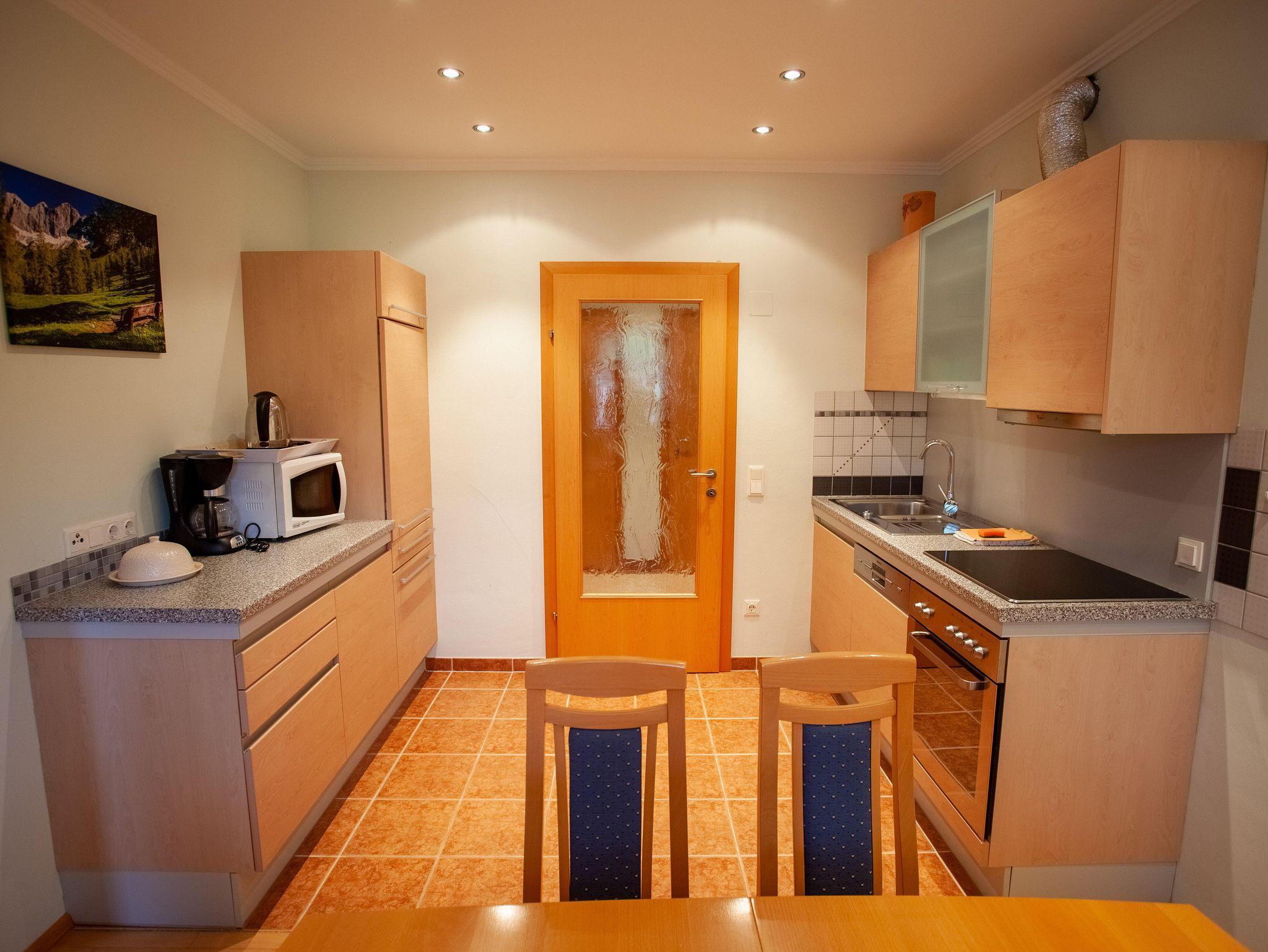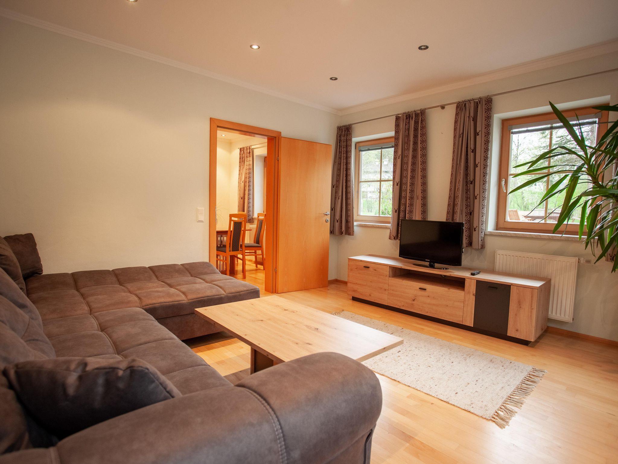 Genießen Sie Ihren Aufenthalt in unserem komfortablen Appartement, das ideal für erholsame Tage in den Bergen ausgestattet ist. Es erwartet Sie ein großzügiger Wohnbereich, der mit einem gemütlichen Sofa, einem Esstisch und ausreichend Platz zum Entspannen und Beisammensein gestaltet ist. Die abgetrennte Küche ist komplett ausgestattet und lädt dazu ein, Ihre Lieblingsgerichte zuzubereiten.