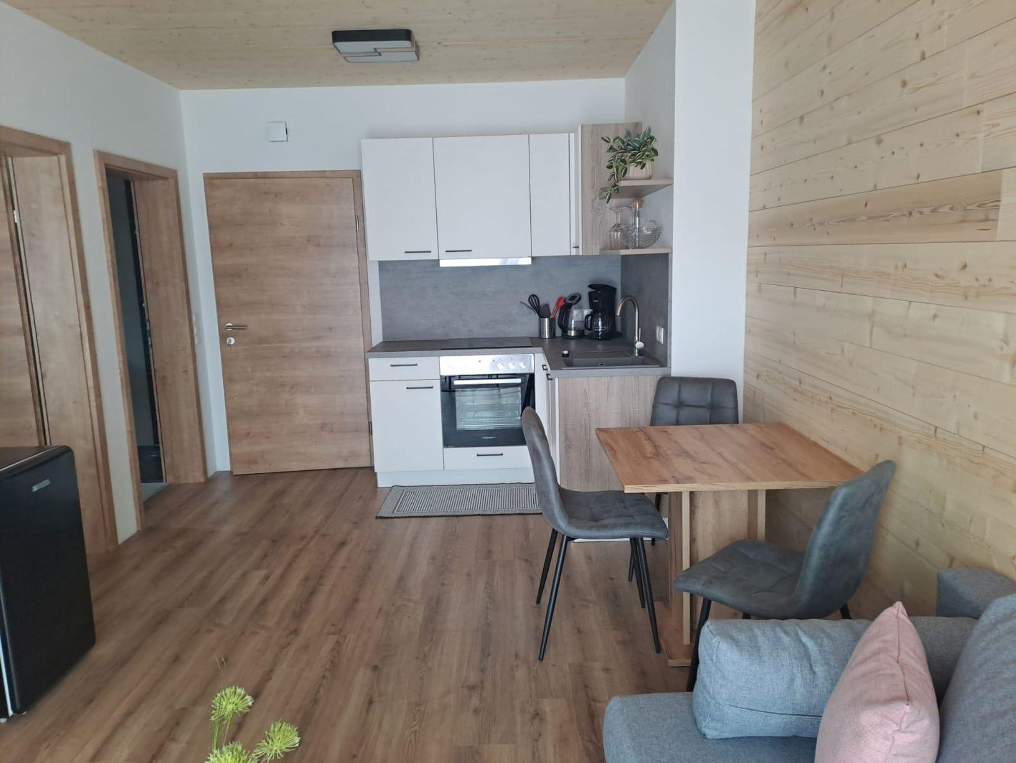 Das Appartement verfügt über eine Wohnküche, ausgestattet mit den wichtigsten Kochutensilien ein separates Schlafzimmer sowie ein großzügiges Badezimmer mit Dusche und WC.