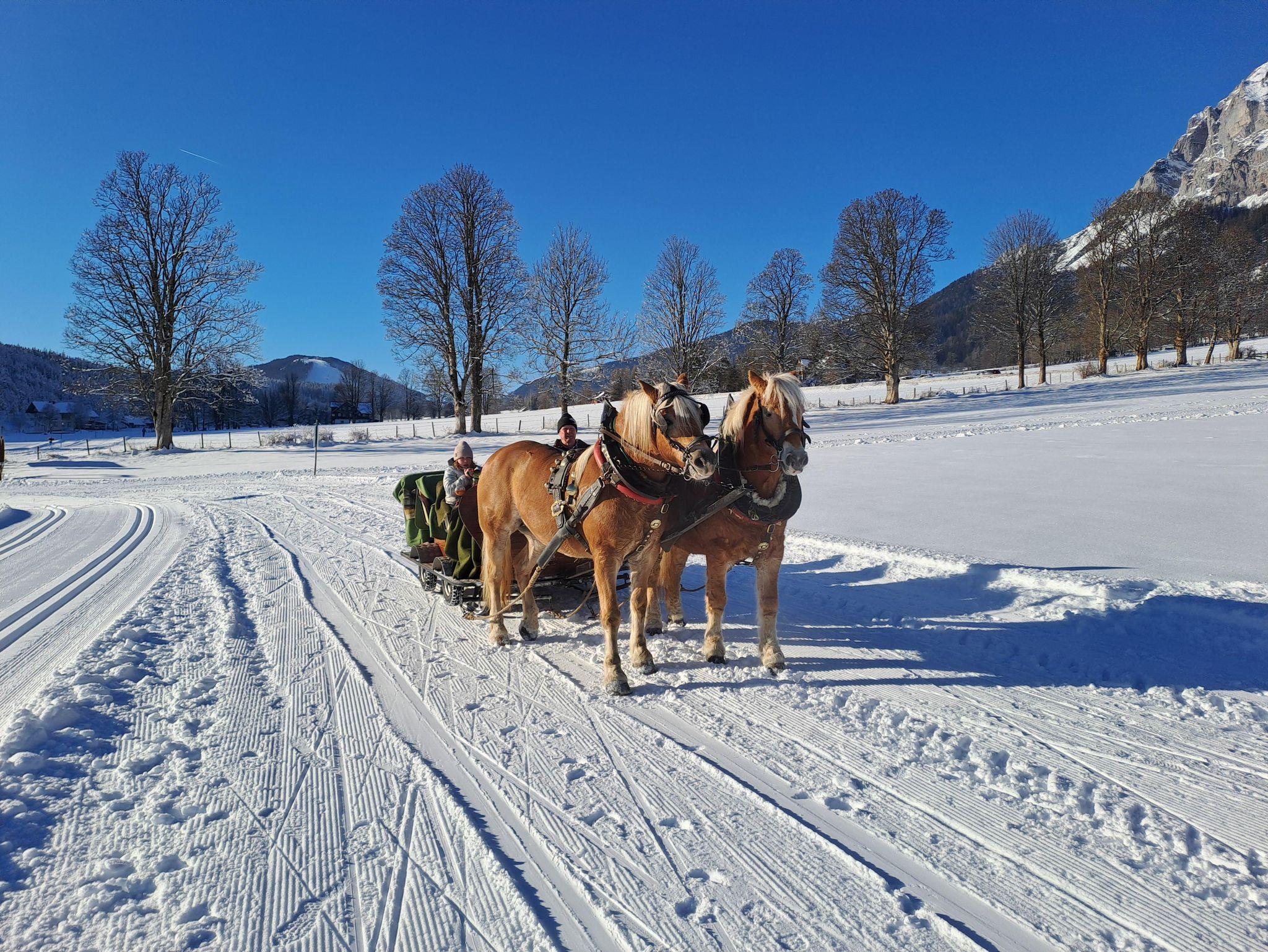 Im Winter liegt der Einstieg in das Loipen- und Winterwanderwegenetz direkt vor der Haustüre. Und auch die familienfreundlichen Skipisten der Ramsau sind nur einen Katzensprung entfernt. Im Herzen von Ski amadé gelegen, fahren Sie mit dem Auto oder Skibus in nur 15 Minuten zur 4-Berge Skischaukel Hauser Kaibling, Planai, Hochwurzen, Reiteralm und auf den Dachstein-Gletscher. Die schneesicheren Pisten in Ramsau und der Region Schladming-Dachstein werden Sie begeistern. Für alle, die es gemütlicher angehen möchten, organisieren wir eine romantische Pferdeschlittenfahrt mit unserem eigenen Gespann.