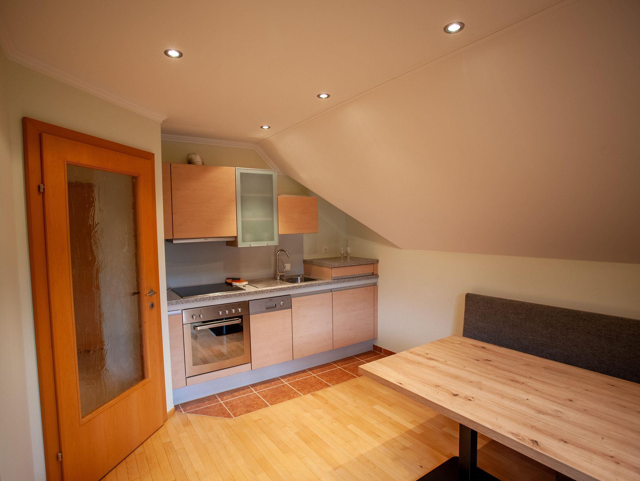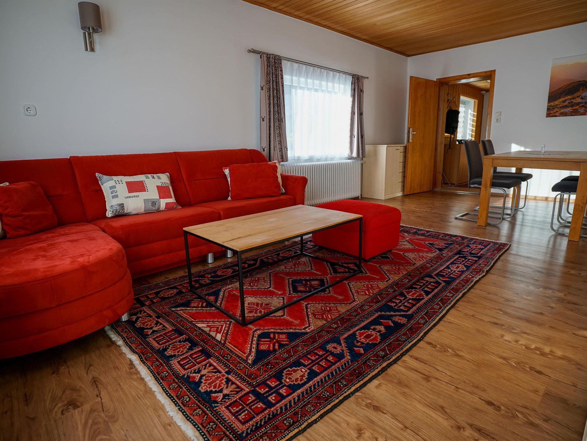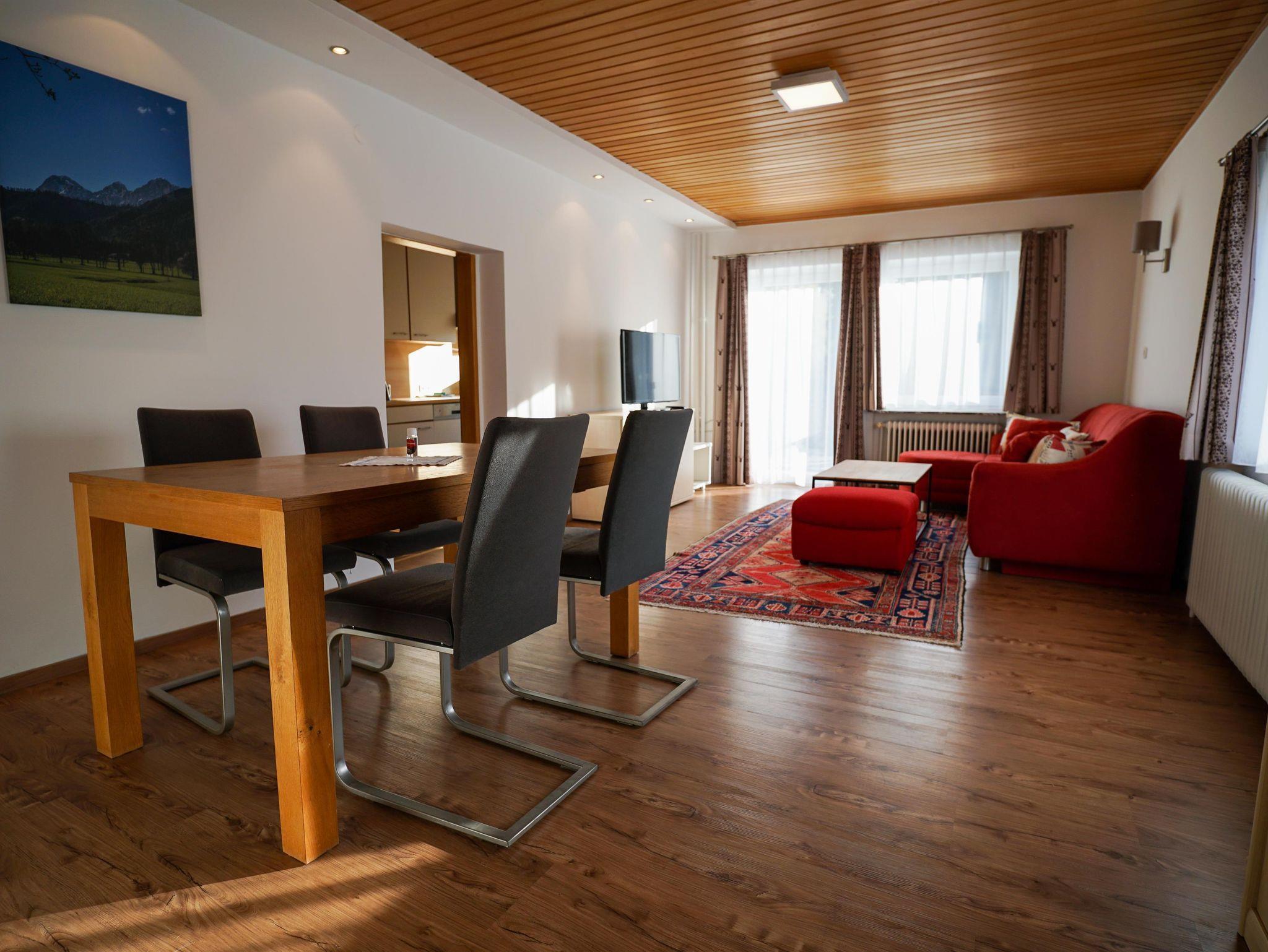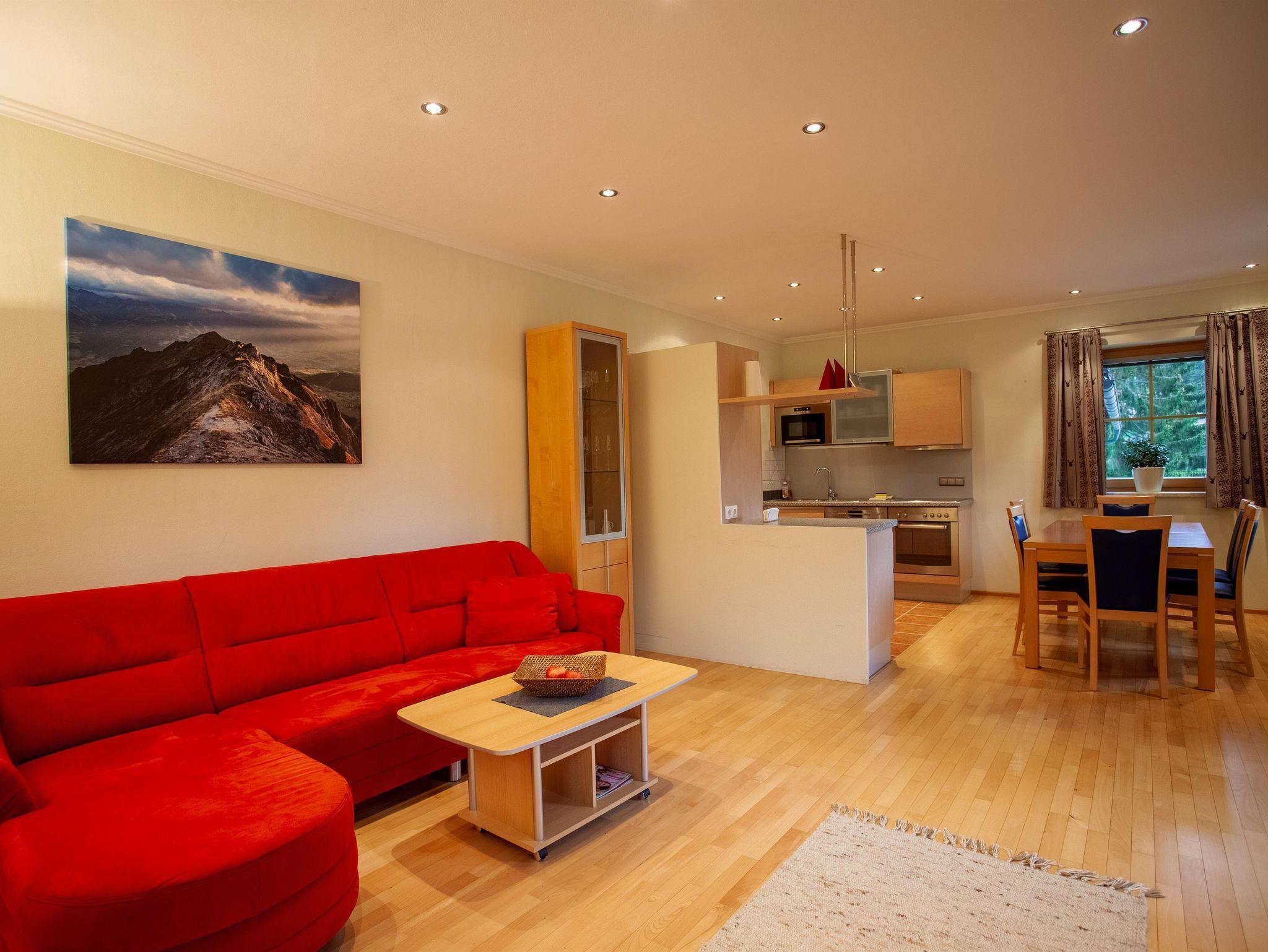 Genießen Sie Ihren Aufenthalt in unserem komfortablen Appartement, das ideal für erholsame Tage in den Bergen ausgestattet ist. Es erwartet Sie ein großzügiger Wohnbereich, der mit einem gemütlichen Sofa, einem Esstisch und ausreichend Platz zum Entspannen und Beisammensein gestaltet ist. Die abgetrennte Küche ist komplett ausgestattet und lädt dazu ein, Ihre Lieblingsgerichte zuzubereiten.