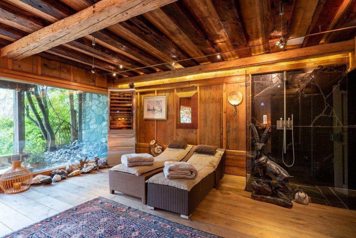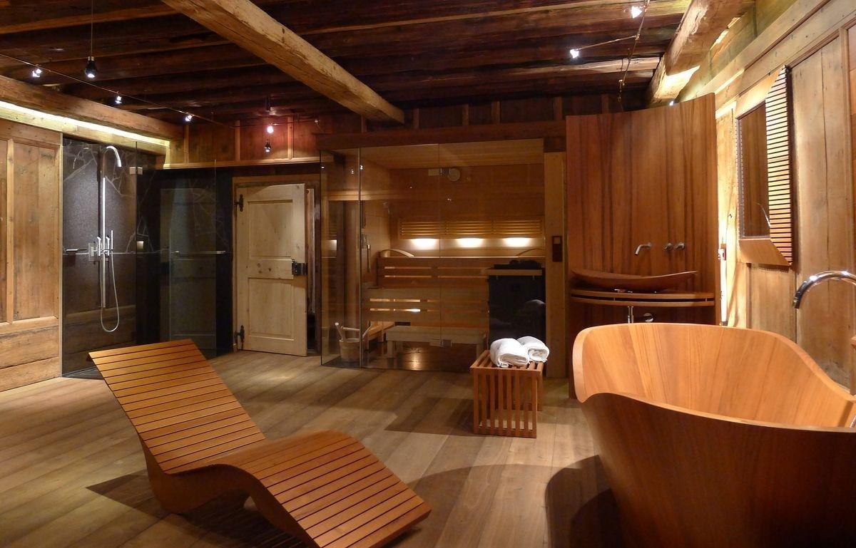 45 m² großer Wellnessbereich mit Sauna (Glasfront), Relaxliegen, Holzbadewanne, Dusche, WC & Weinkühlschrank