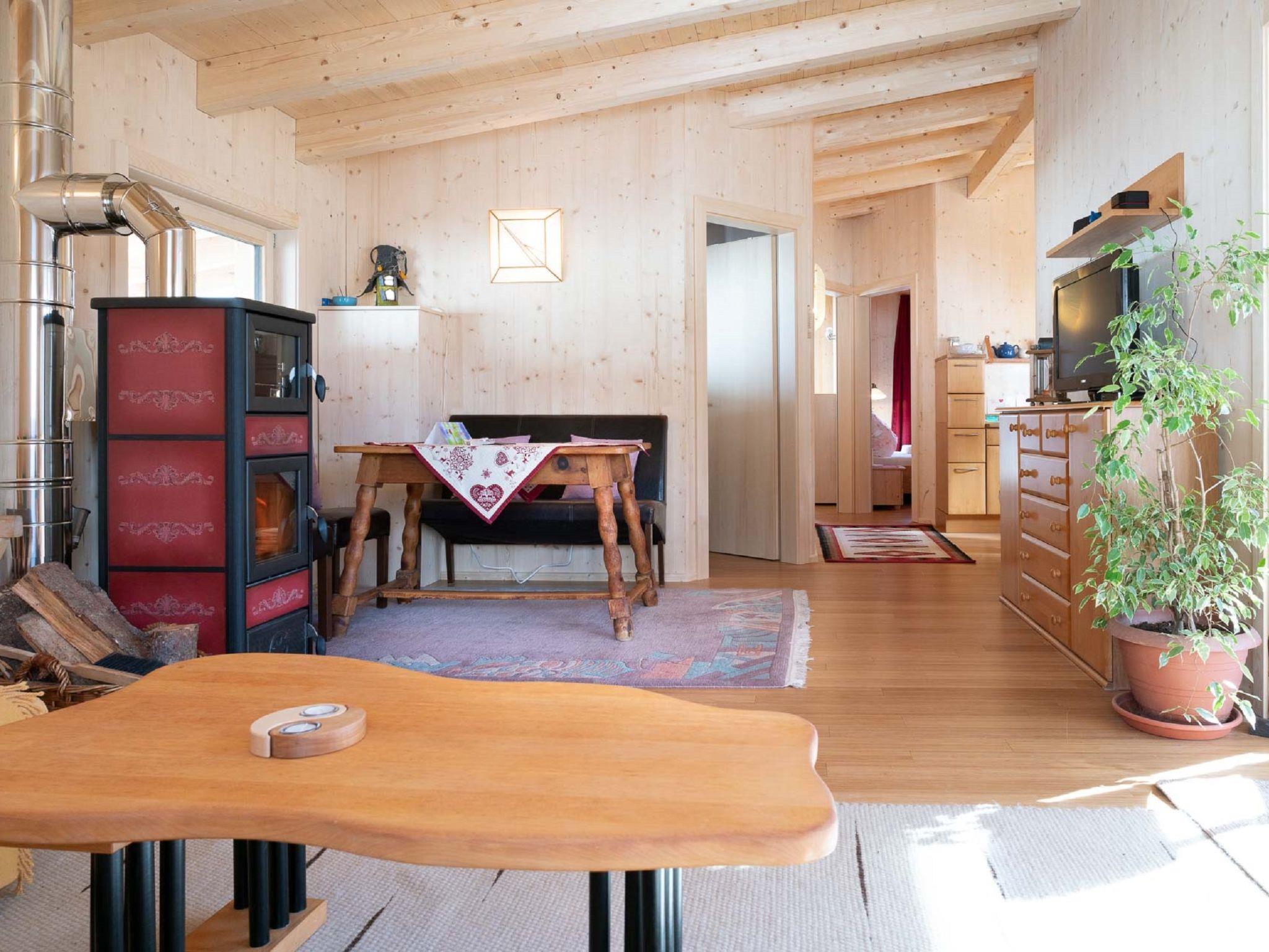 3-Zimmer-Chalet 65 m2, im erhöhten Erdgeschoss. Gemütlich und mit viel Holz eingerichtet: 1 Doppelzimmer. 1 Zimmer mit 2 Betten und 2 Ausziehbetten (Länge 190 cm). Wohnzimmer mit 1 Doppeldiwanbett, Schwedenofen, Esstisch und Flachbildschirm. Ausgang zur Terrasse. Offene Küche (4 Kochplatten, Backofen, Geschirrspüler). Dusche/WC. Grosse Terrasse 20 m2, überdacht, Südlage und Westlage. Terrassenmöbel. Herrliche Sicht auf die Landschaft. Zur Verfügung: Kinderhochstuhl, Babybett, Haartrockner. Internet (Wireless LAN). Bitte beachten: Nichtraucher-Haus. Rauchmelder. Die Infrarotheizung und der Schwedenofen sorgen für gemütliche Wärme. Gasherd in der Küche.