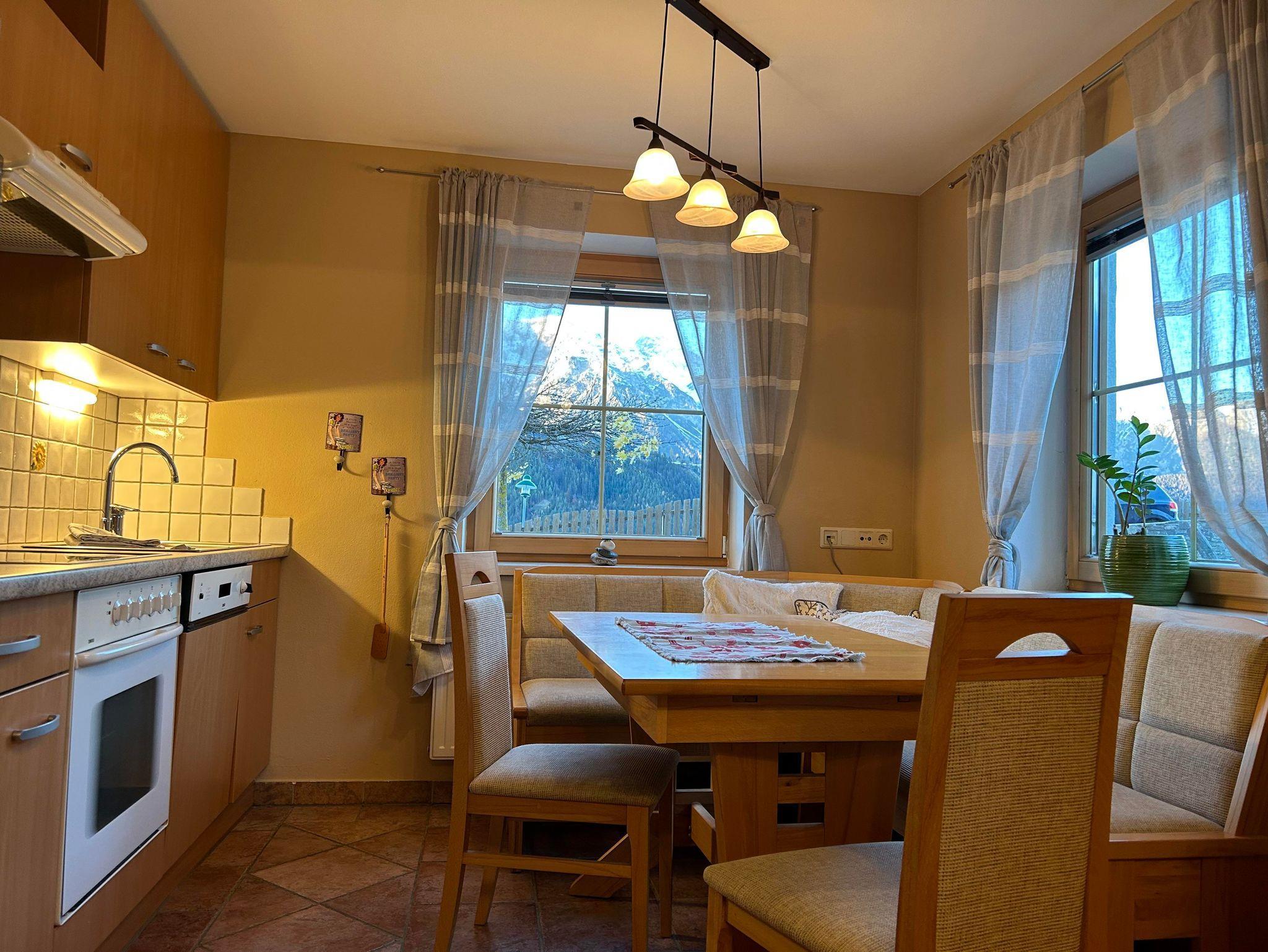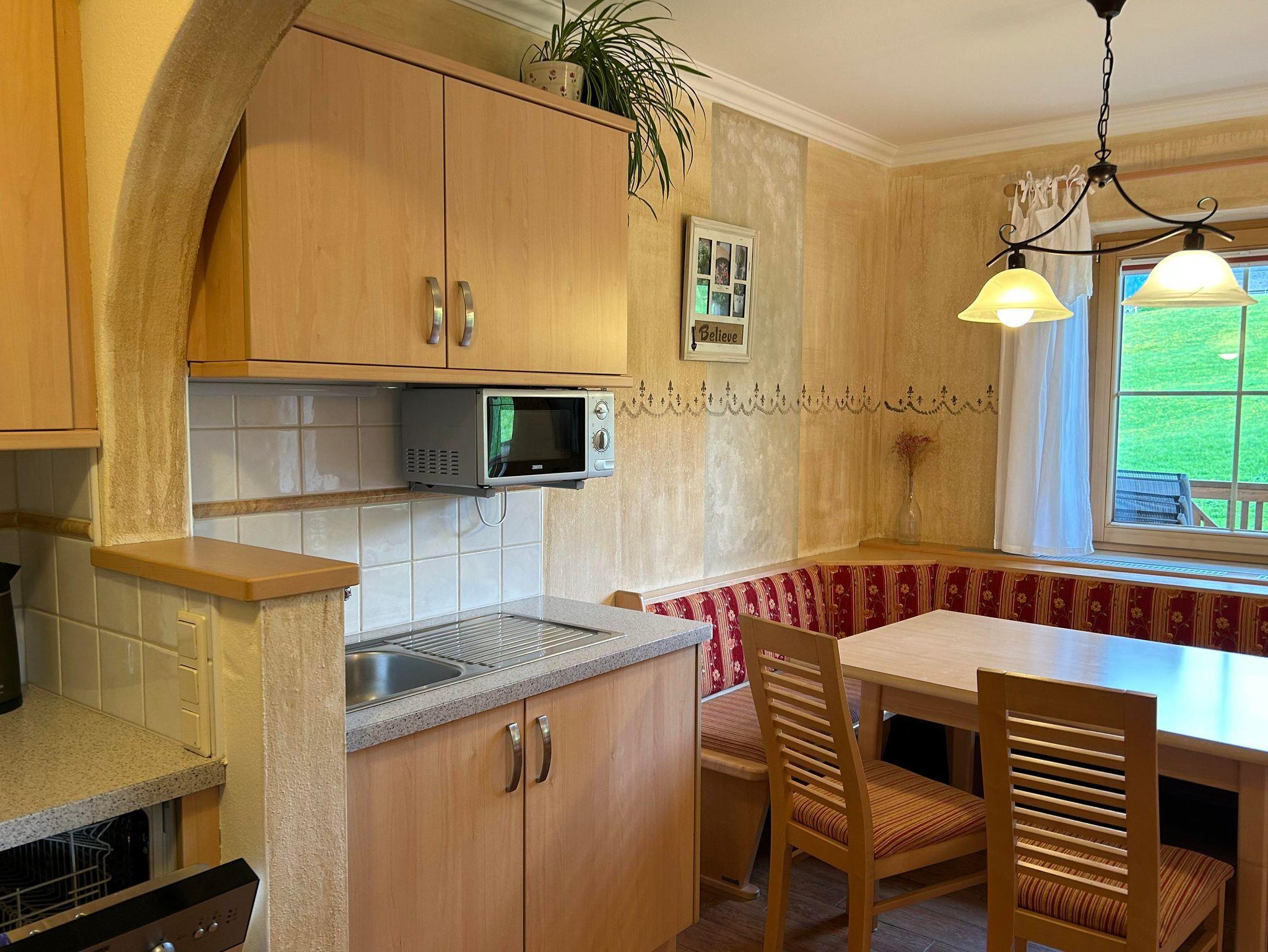 Gemütliches Appartement mit 2 Schlafräumen , voll eingerichtete Wohnküche mit Sonnenterasse , 2 Badezimmer und separate Toilette. Die voll ausgestattet Küche verfügt über Backofen, Mikrowelle, Geschirrspüler, Kühlschrank mit Eisfach, Espressomaschine, Wasserkocher und ausreichend Geschirr und Besteck. Für Bettwäsche, Handtücher ,Geschirrtücher sowie Saunatücher ist natürlich gesorgt. Diese Wohnung verfügt über Balkon und Terrasse mit Blick auf unserer wunderschöne Bergwelt. Das Appartement befindet sich auf der 1. Etage. Unser Haus befindet sich direkt an der Skipiste in sonniger ruhiger und doch zentraler Lage!