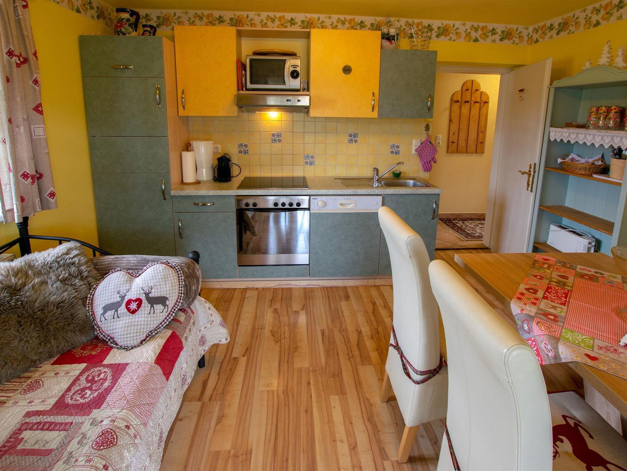 Küche komplett eingerichtet mit Kochherd, Backofen, Mikrowelle, Kühlschrank mit Gefrierfach, Spülmaschine, Kaffeemaschine (Filter + Nespresso), Wasserkocher und ausreichend Koch- und Essgeschirr.