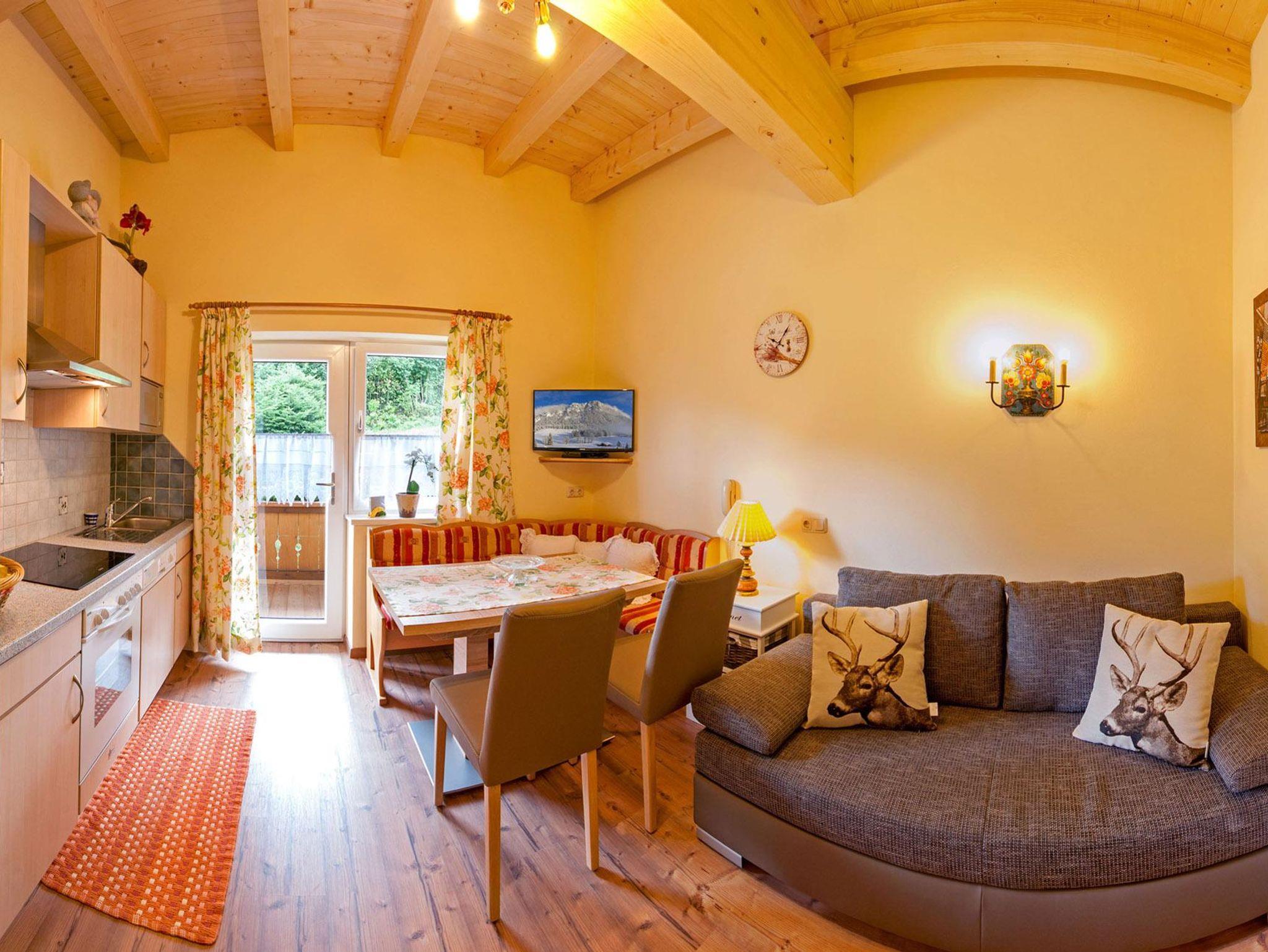 Warmes und helles Holzambiente heißt im 3-Zimmer-Appartement „Tirol“ 2 – 5 Personen willkommen. Die neu renovierte Ferienwohnung verfügt über zwei Schlafzimmer, eine gemütliche Wohnküche mit Ausziehcouch und zwei Balkonen. Ostbalkon mit Blick zum Kitzbüheler Horn und vom zweiten west Balkon ist die Aussicht zum Wilden Kaiser überragend.