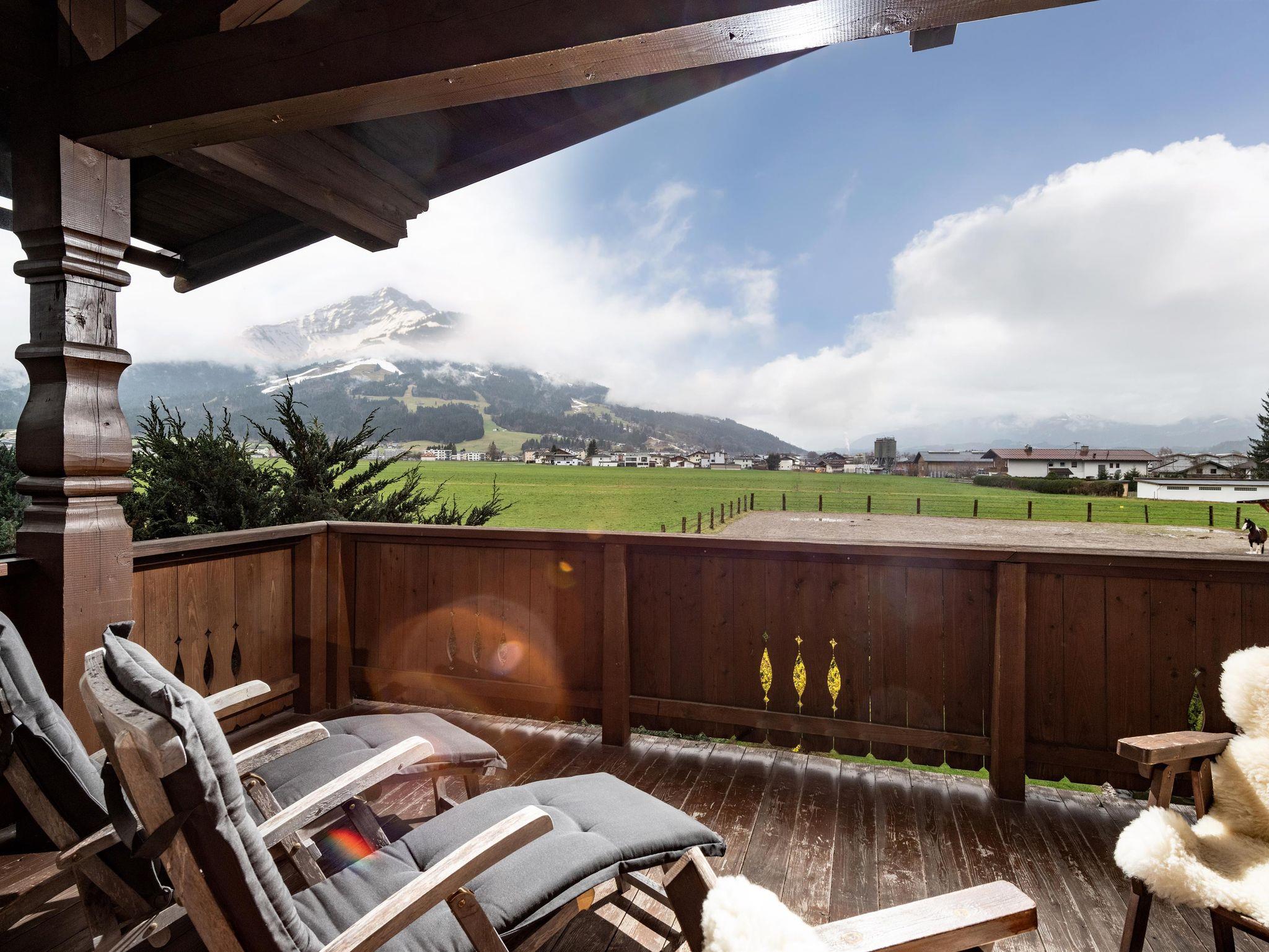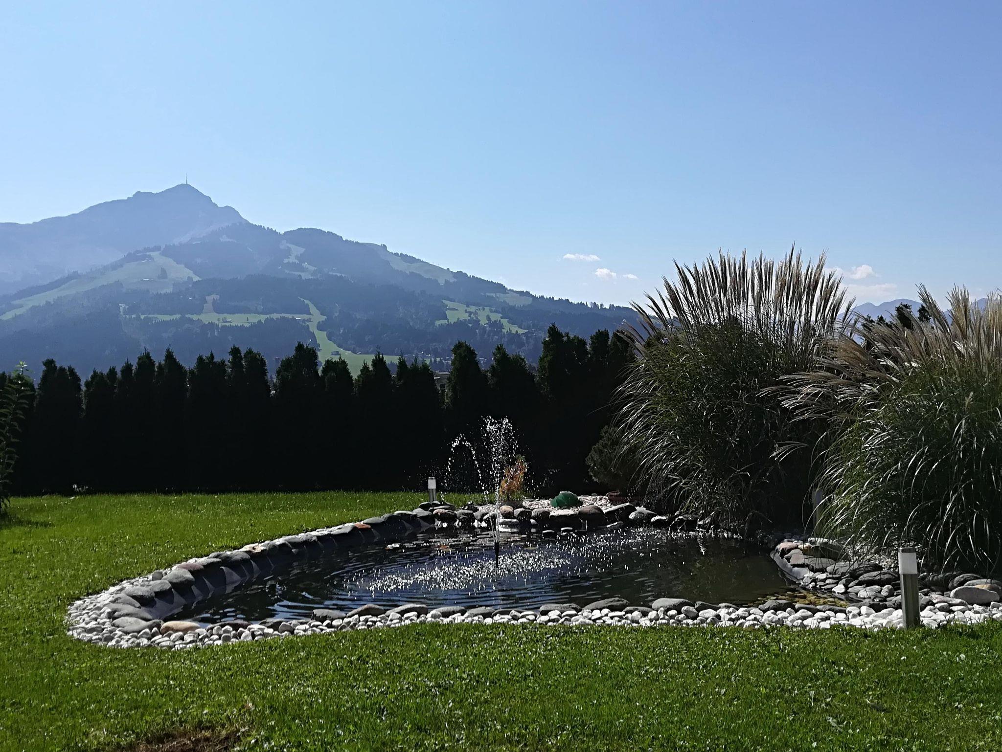 Sie erwartet ein unverbauter, herrlicher, freier Blick auf das Kitzbüheler Horn und die umliegende Bergwelt.