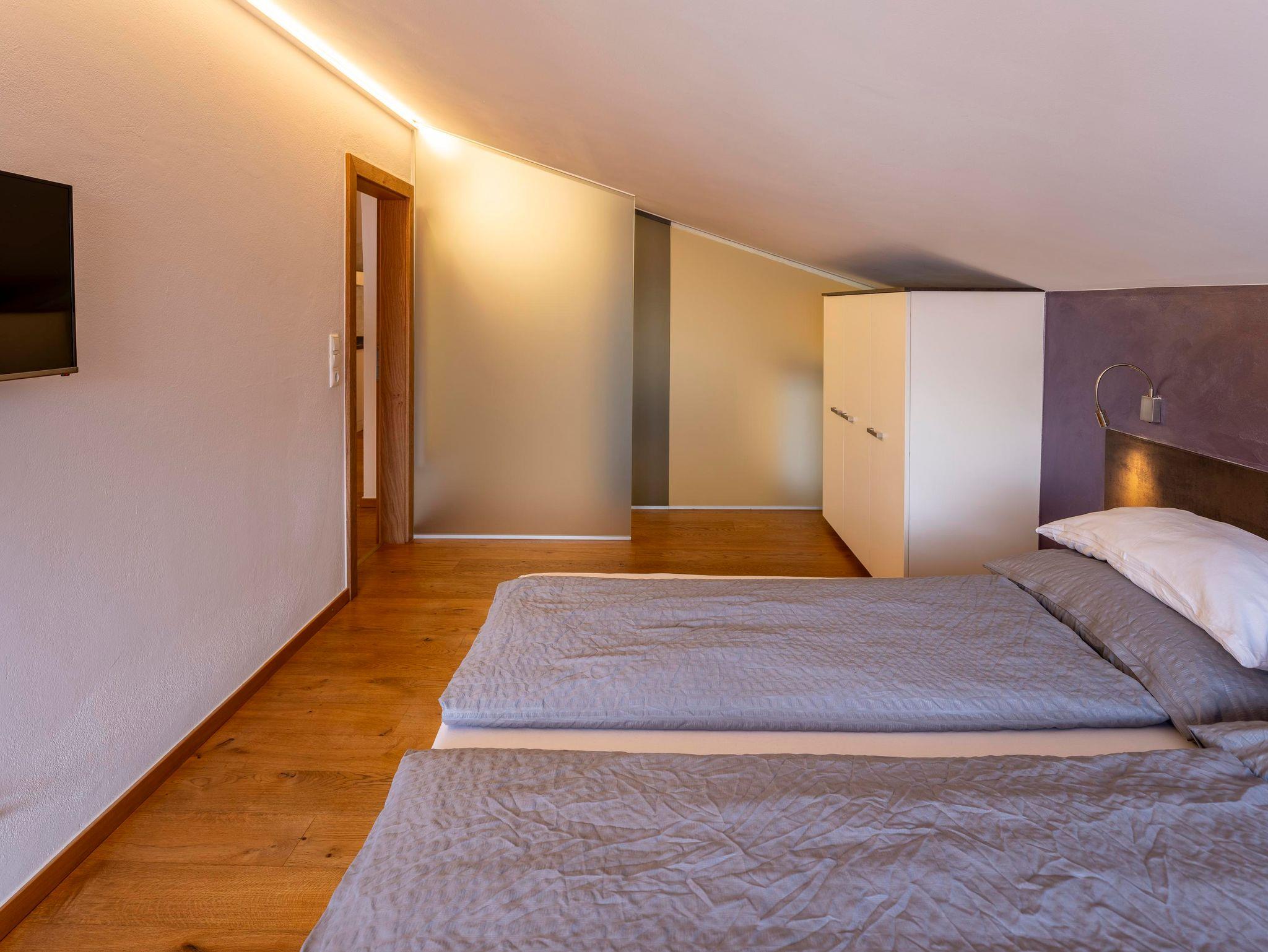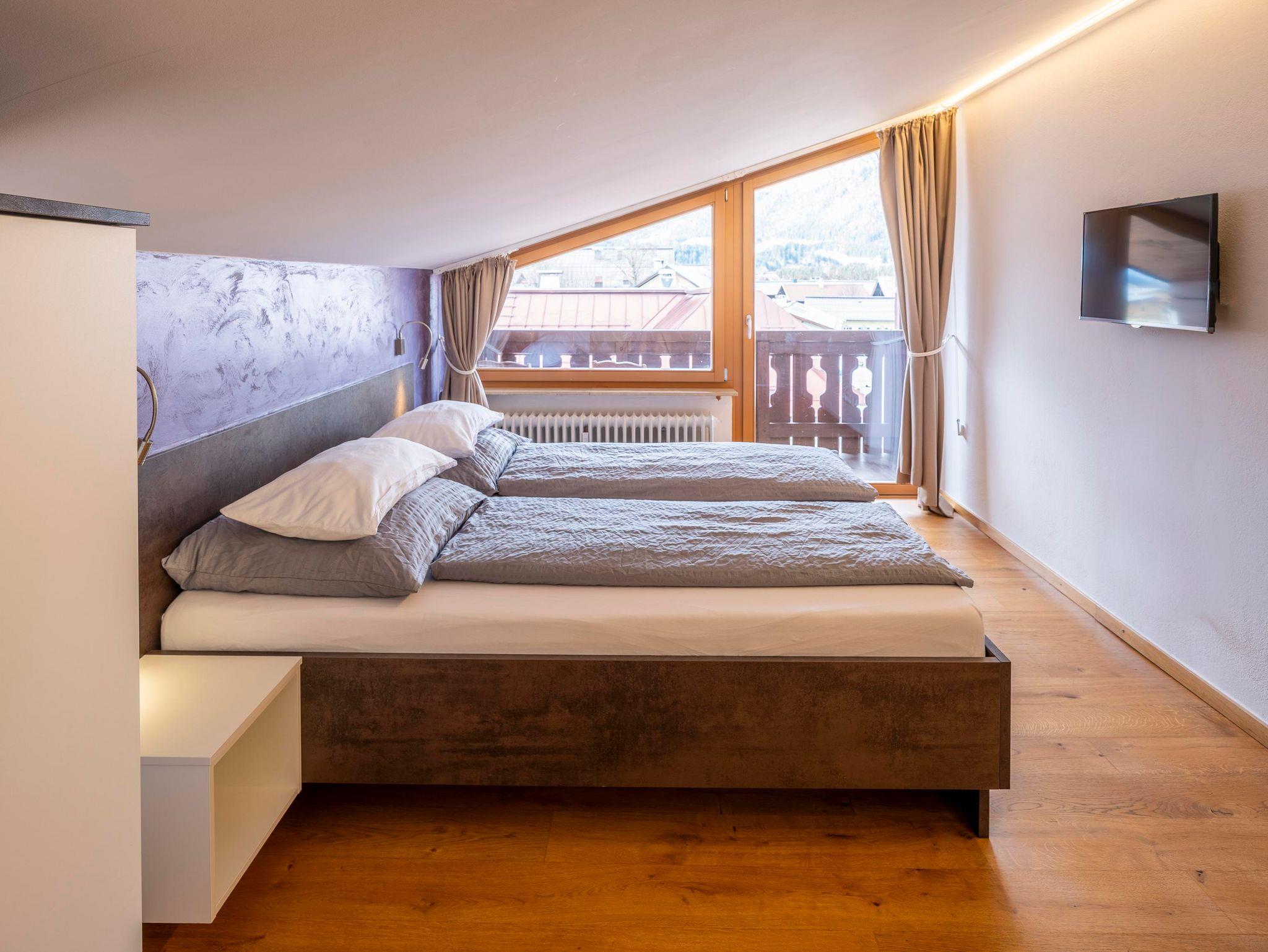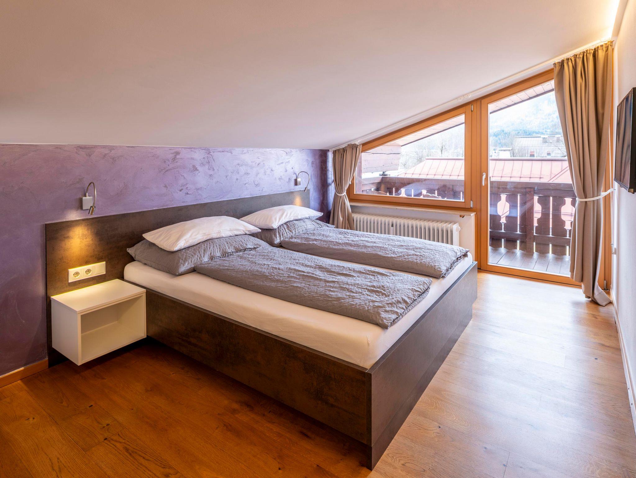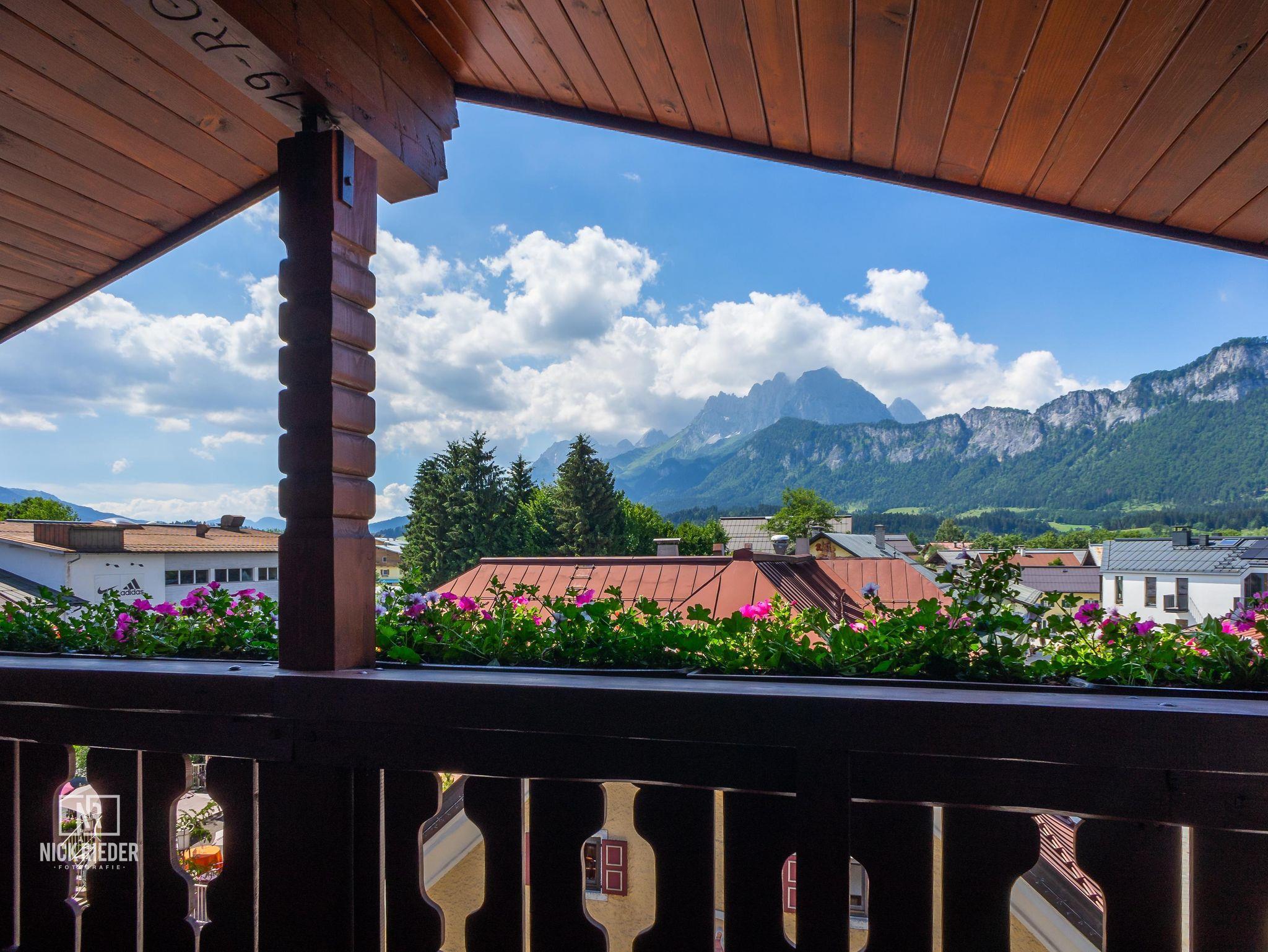 Gemütliches Appartement im Dachgeschoss (80m²) mit wunderschönem Blick auf den Wilden Kaiser. Schlafzimmer mit Doppelbett, Bad mit Dusche & WC, Sauna, WC extra, Küche, Essplatz und Wohnraum mit ausziehbarer Schlafcouch für 2 Personen, Balkon.