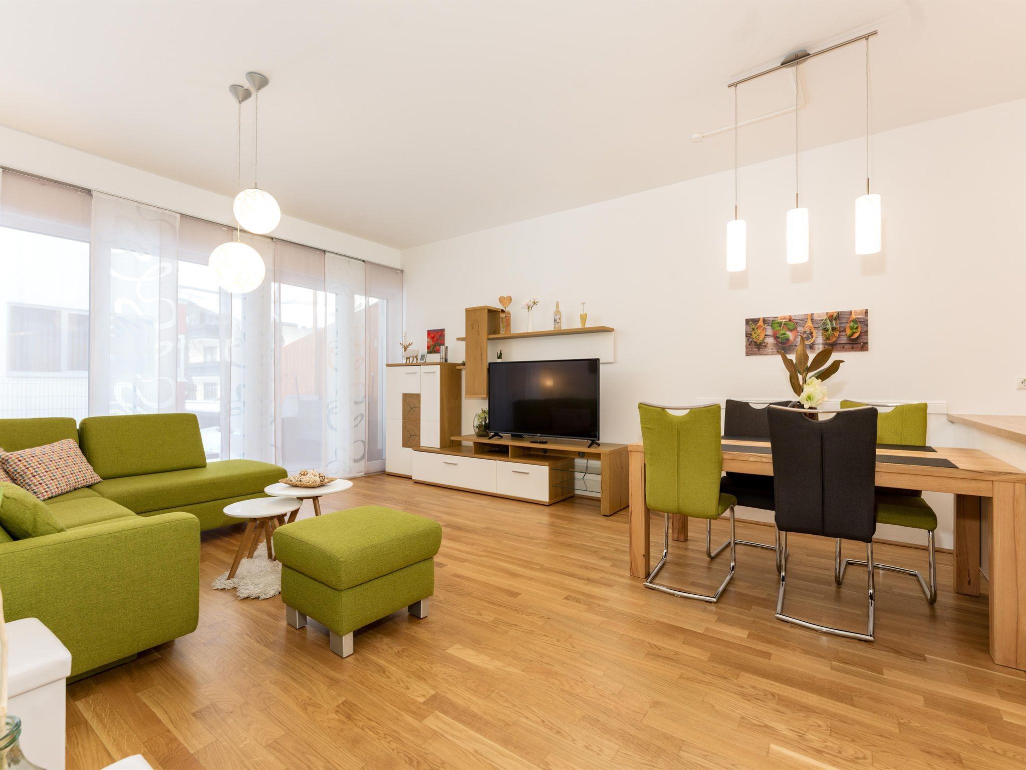 Top 2: 60 m² App. im Erdgeschoss für 2-4 Personen, voll ausgestattete Wohnküche mit Esstisch, Schlafsofa für 2 Personen und TV, 40 m² Terrasse mit Lounge- und Gartenmöbel, ein separates Schlafzimmer mit Doppelbett und TV, ein Badezimmer mit Dusche, eine separate Toilette, 1x Tiefgaragenparkplatz.