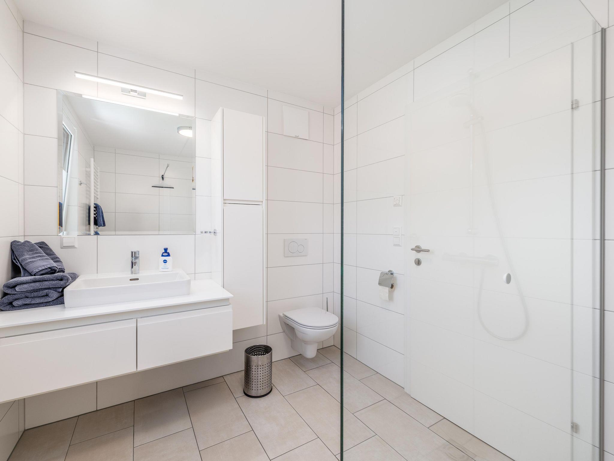 Das Bad ist ausgestattet mit einer großzügigen Dusche und einem Waschbecken. Handtücher und Bettwäsche stehen zur Verfügung.