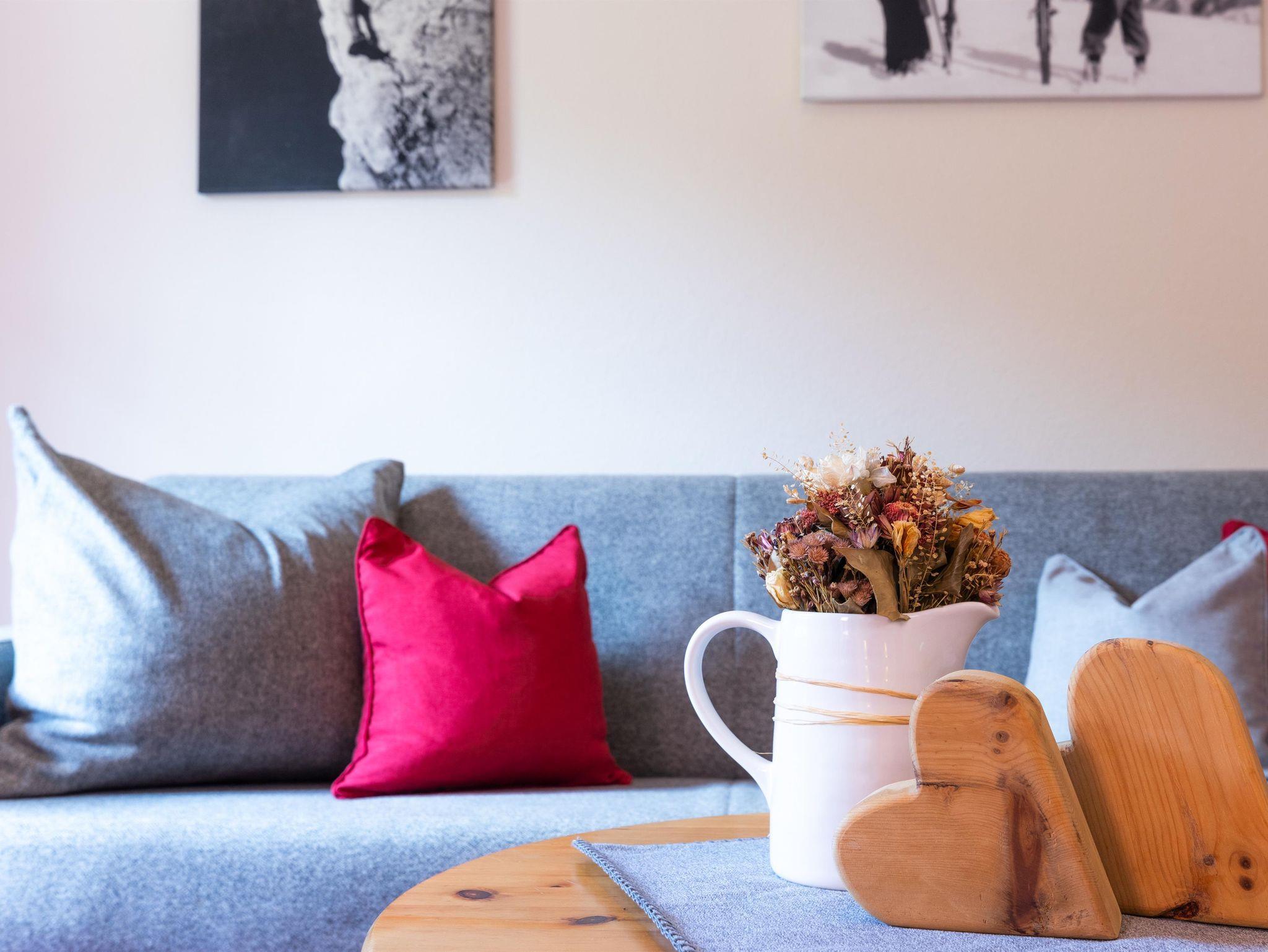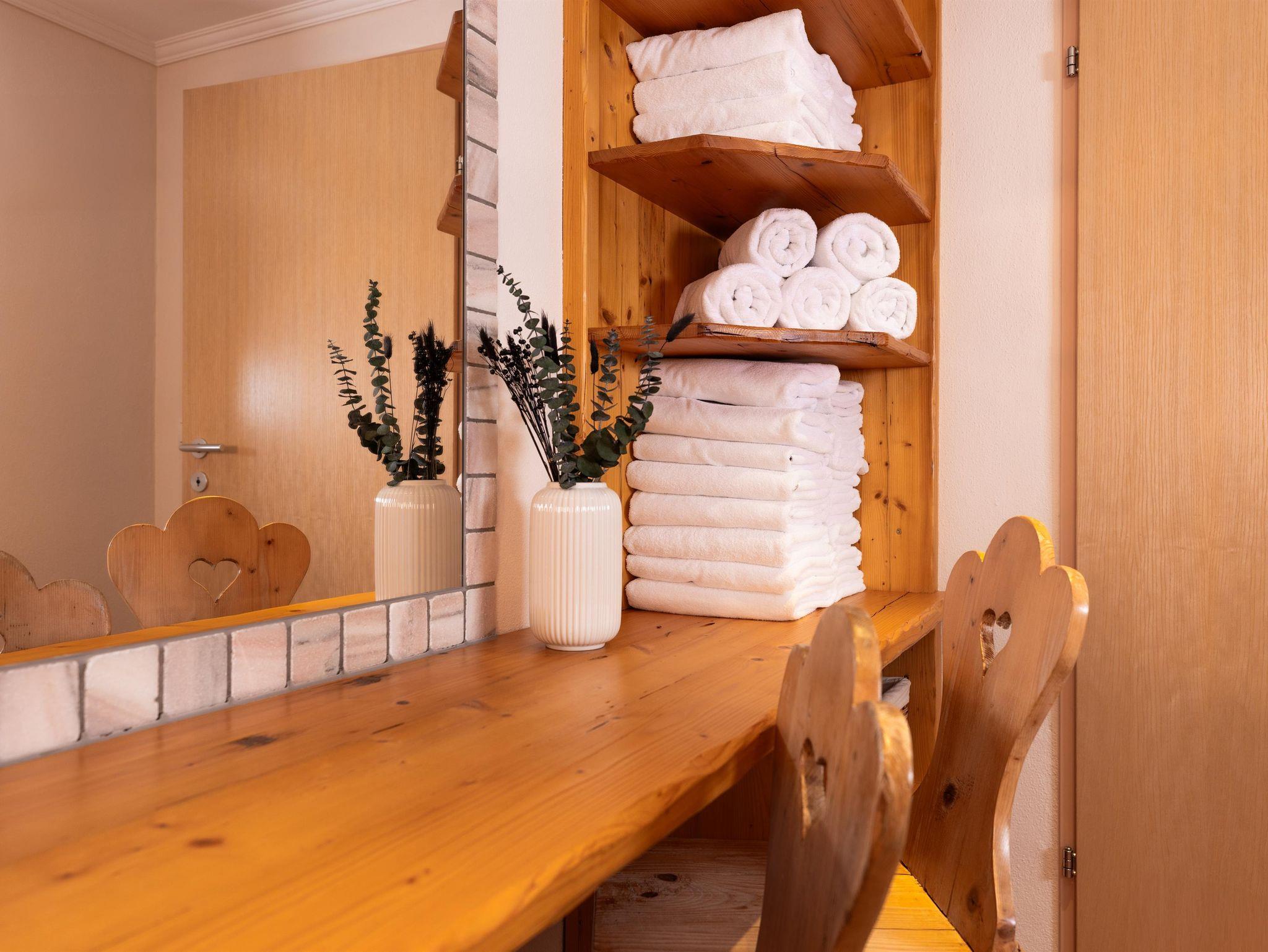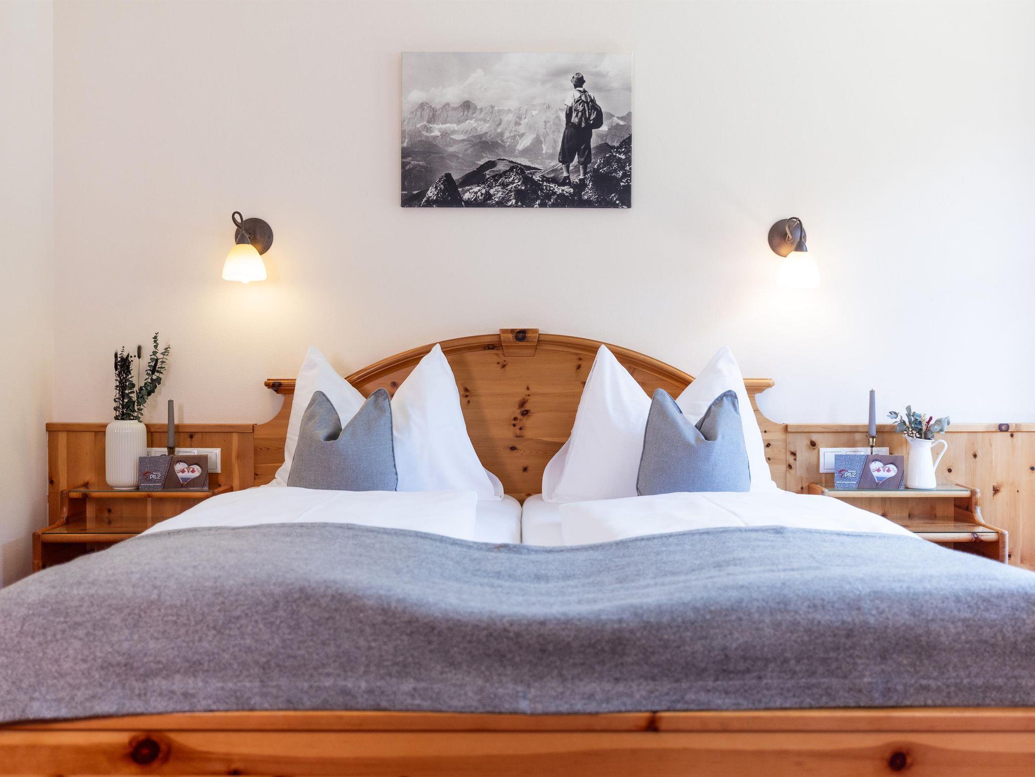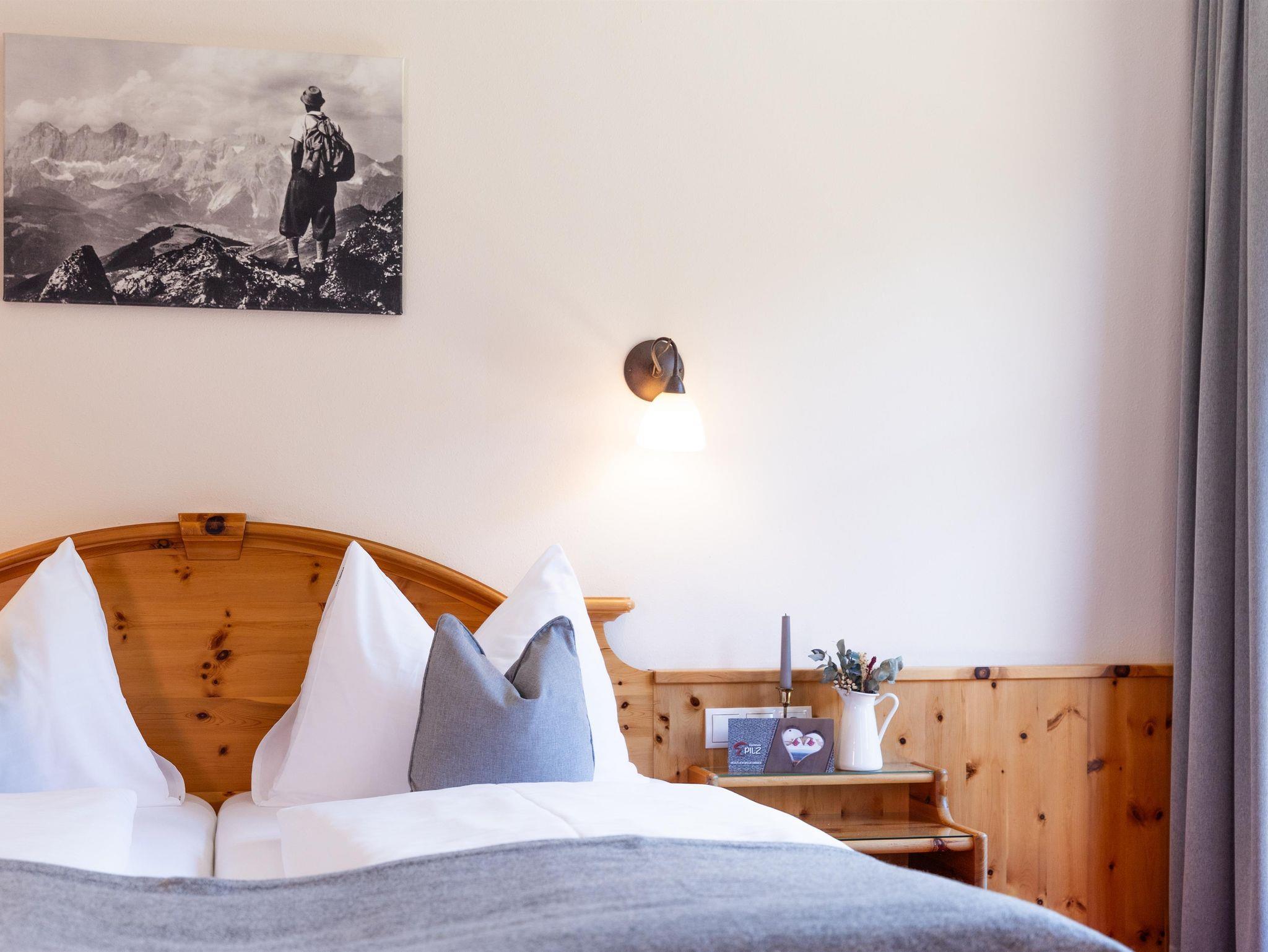 Bei der Einrichtung der Zimmer wurde bewusst darauf geachtet, Materialien aus der Region zu integrieren. Die Möbel wurden aus Zirbenholz gefertigt. Die besondere Eigenschaft der Zirbe, den Herzschlag zu verlangsamen, führt dazu, dass Dein Herz sich täglich eine Stunde Arbeit spart und Du erholt in den neuen Tag startest.