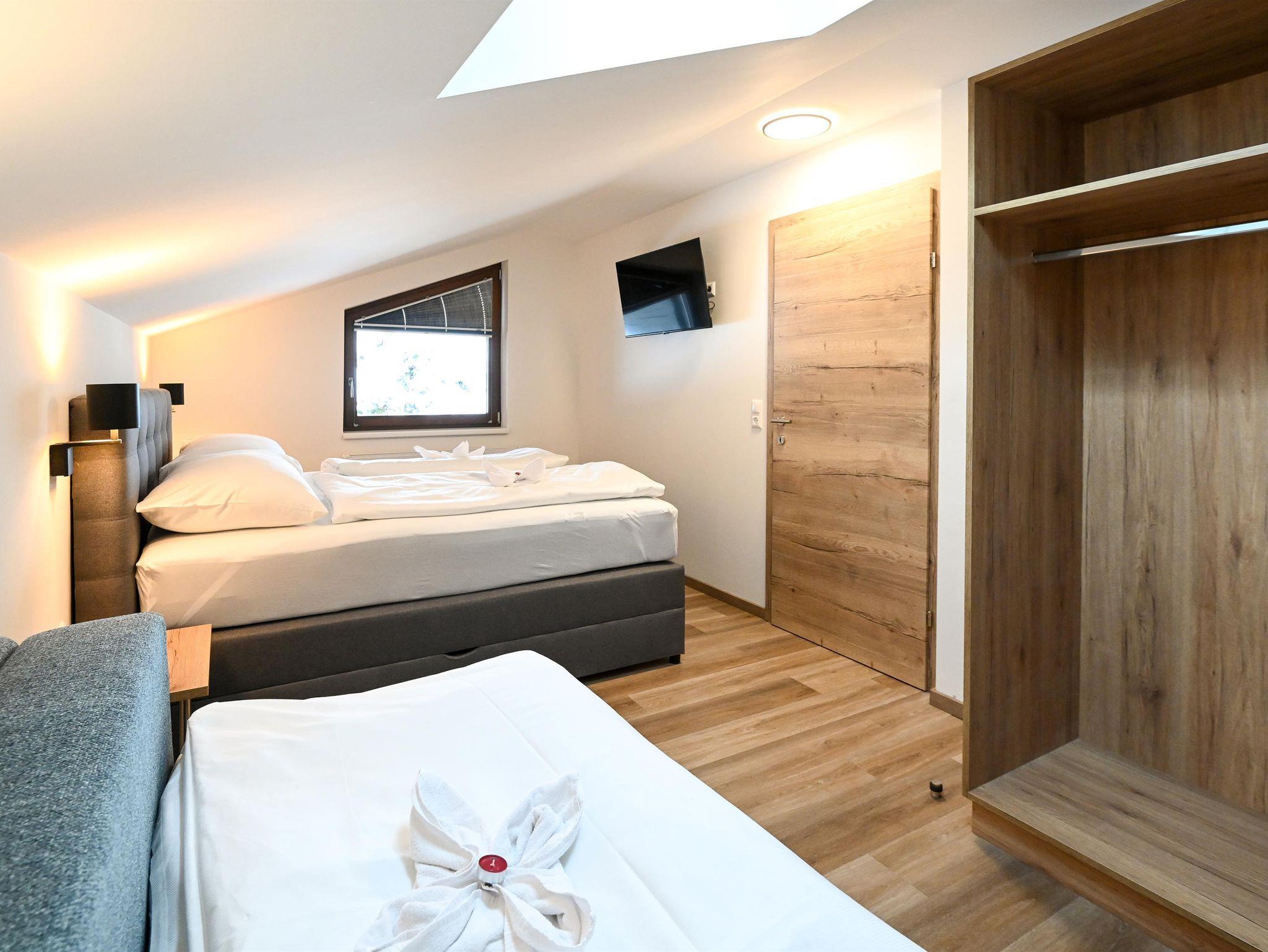 Im Schlafzimmer befindet sich ein Doppelbett und ein Doppelschlafsofa. Zusätzlich gibt es im Wohnbereich eines der Appartements ein Einzelschlafsofa.