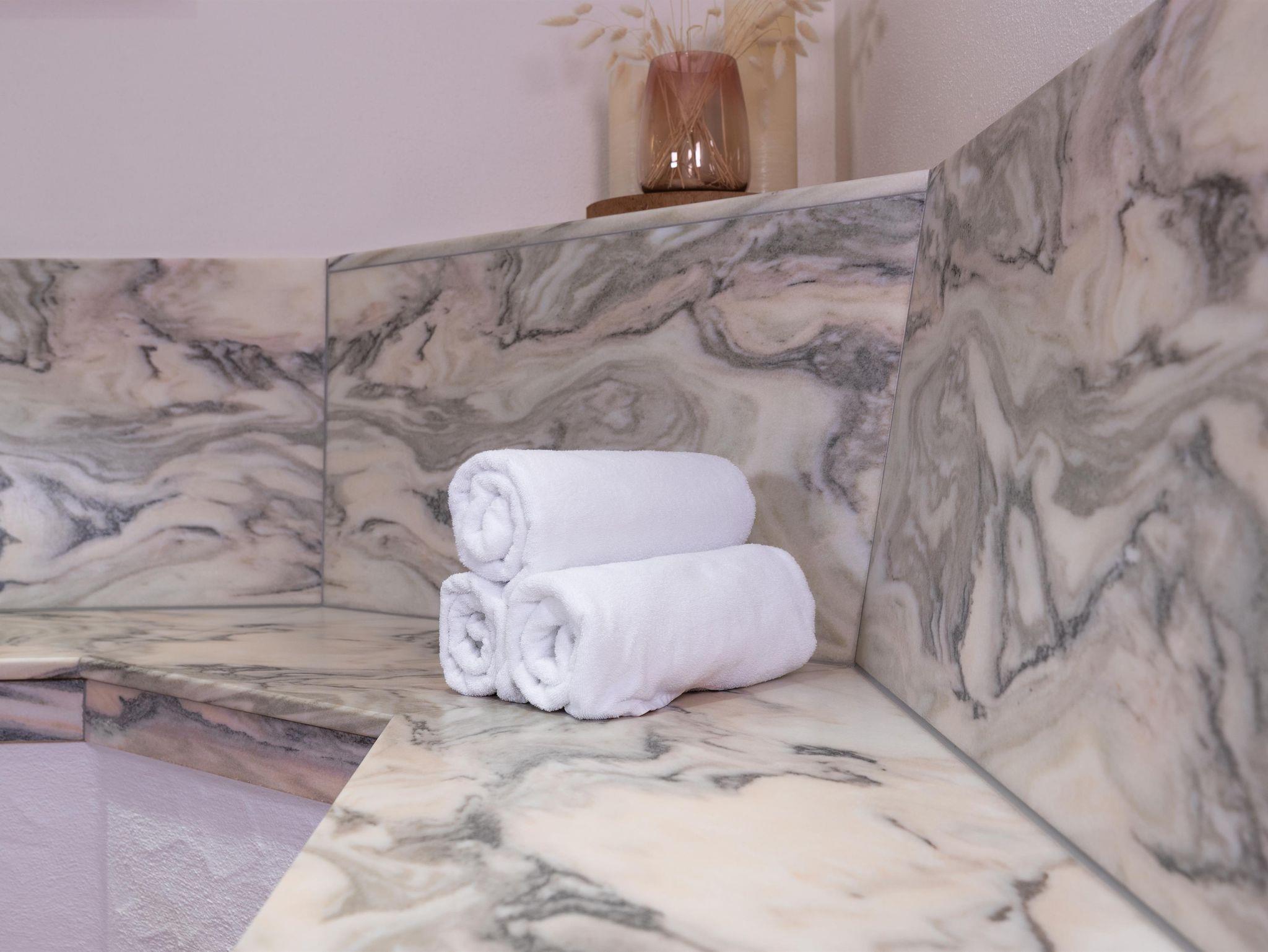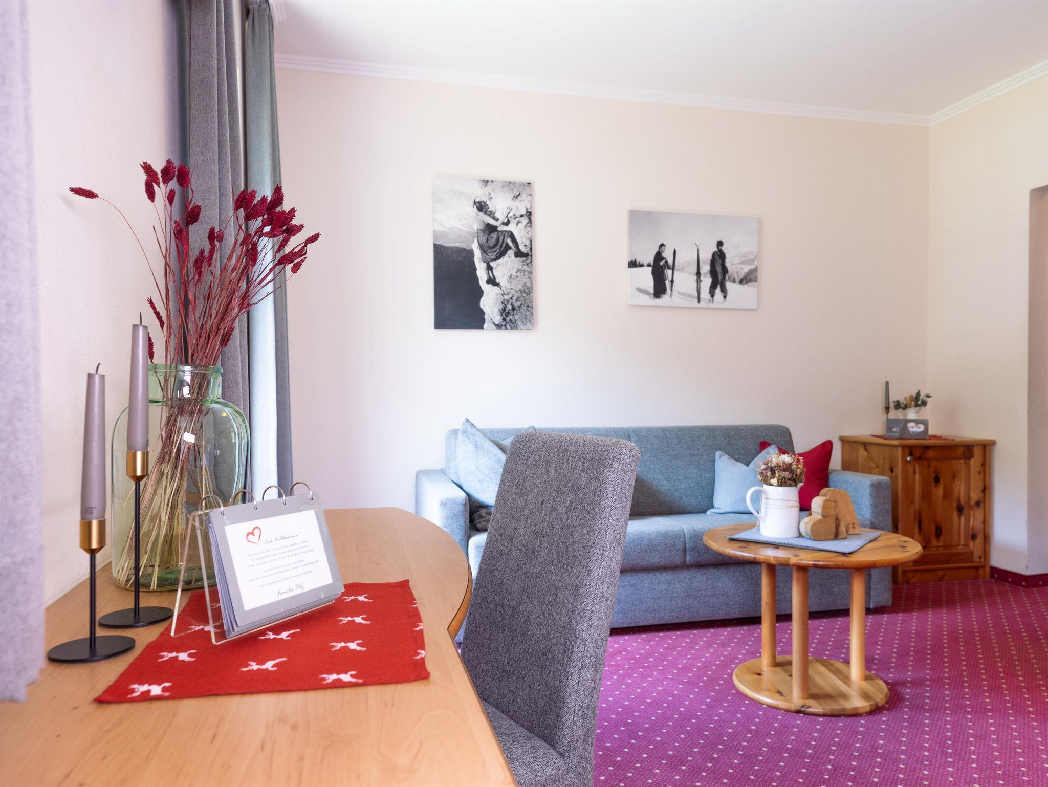 Die Bäder wurden mit Fliesen aus Sölker Marmor gestaltet und das Sofa aus dem typischen Schladminger Loden verleiht dem Zimmer eine gemütliche Atmosphäre.
