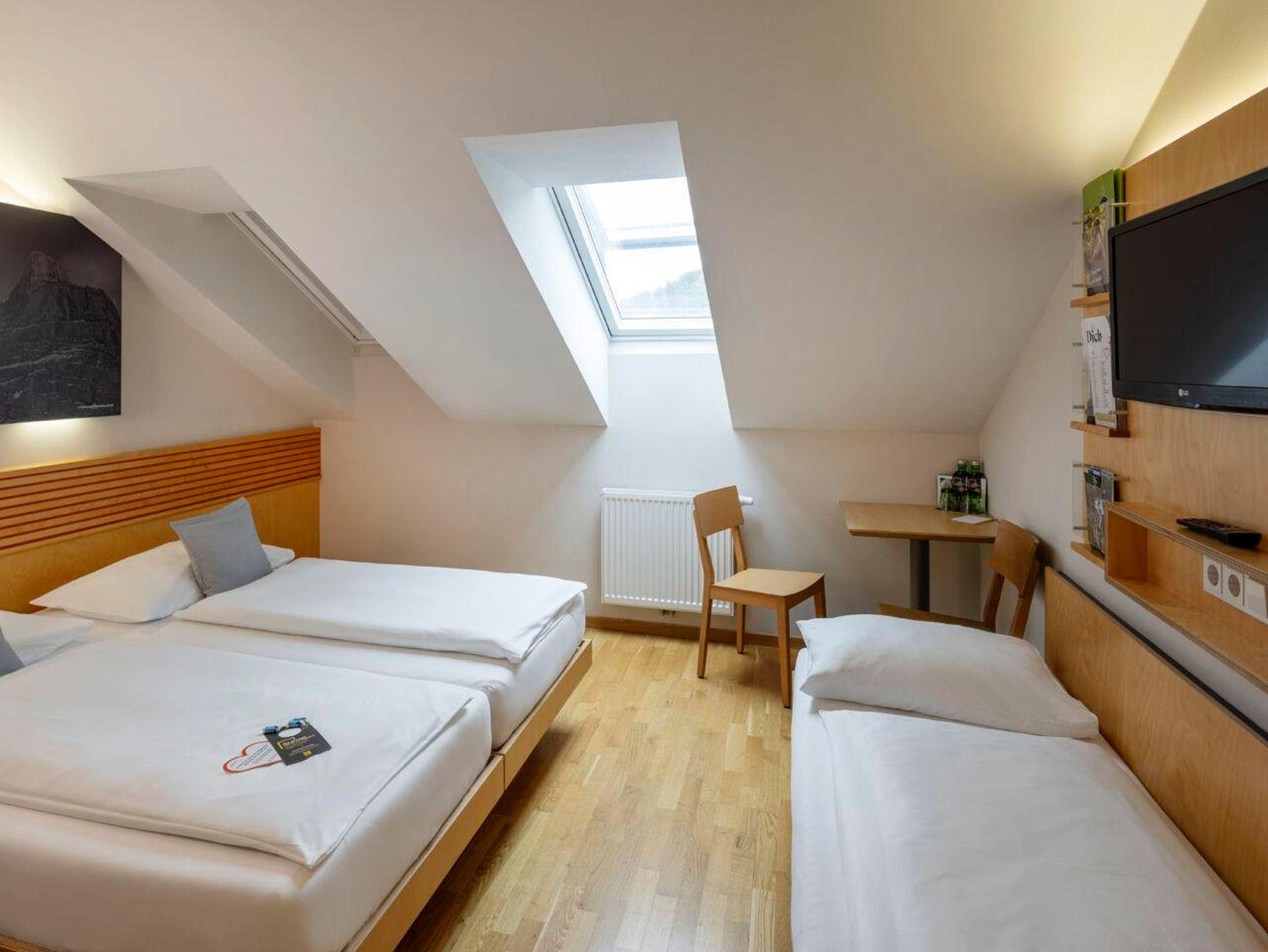 Helle und freundliche Zimmer mit flexiblen Bettensystemen (Doppel-, Einzel-, Sofa-, und Etagenbetten), funktionelle Einrichtung aus natürlichen und regionalen Rohstoffen. Badezimmer mit Dusche/WC