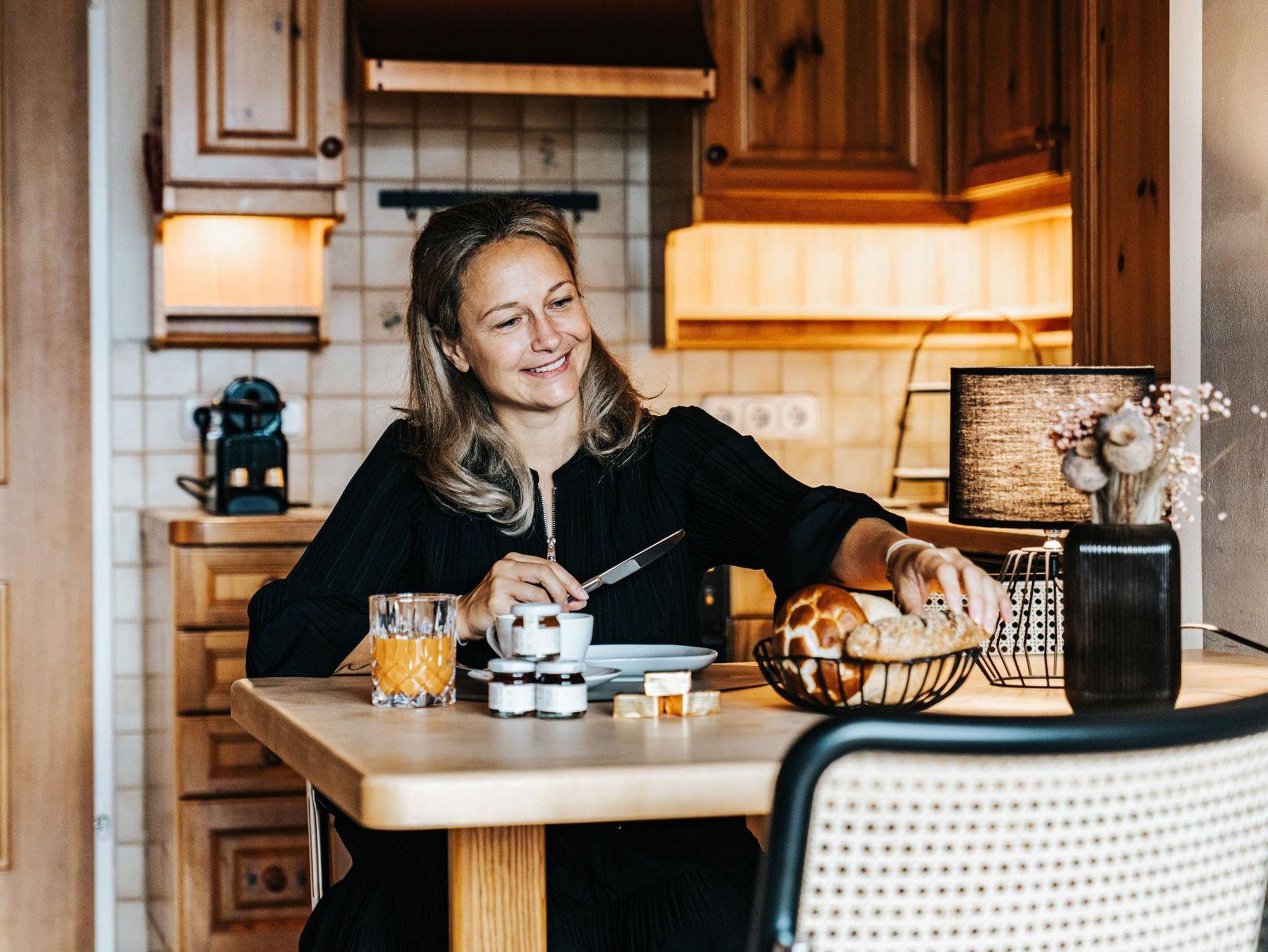 Der weitläufige Wohnbereich ist mit einer modernen, voll ausgestatteten Küche versehen, die alle Bedürfnisse erfüllt. Ganz gleich, ob Du nur ein schnelles Frühstück zubereiten oder ein ausgiebiges Abendessen kochen möchtest – sämtliche Geräte und Küchenutensilien (inklusive Backofen) stehen bereit. Der angrenzende Essbereich ist der ideale Ort, um gemeinsam mit Familie oder Freunden zu speisen.
