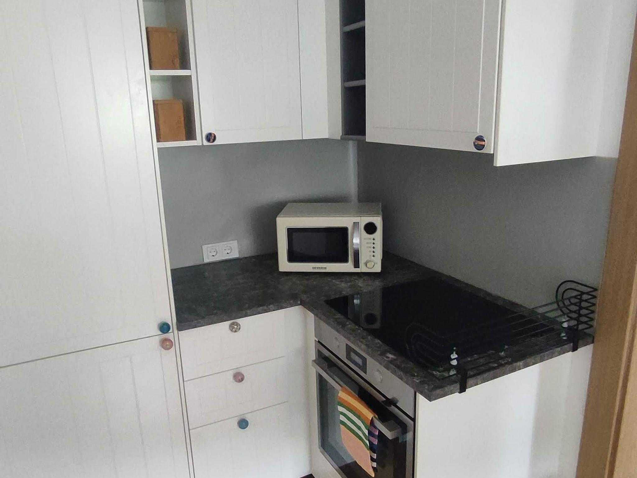 Küche mit Herd, Backofen, Geschirrspüler, Kaffeemaschine, Wasserkocher, Toaster und Mikrowelle