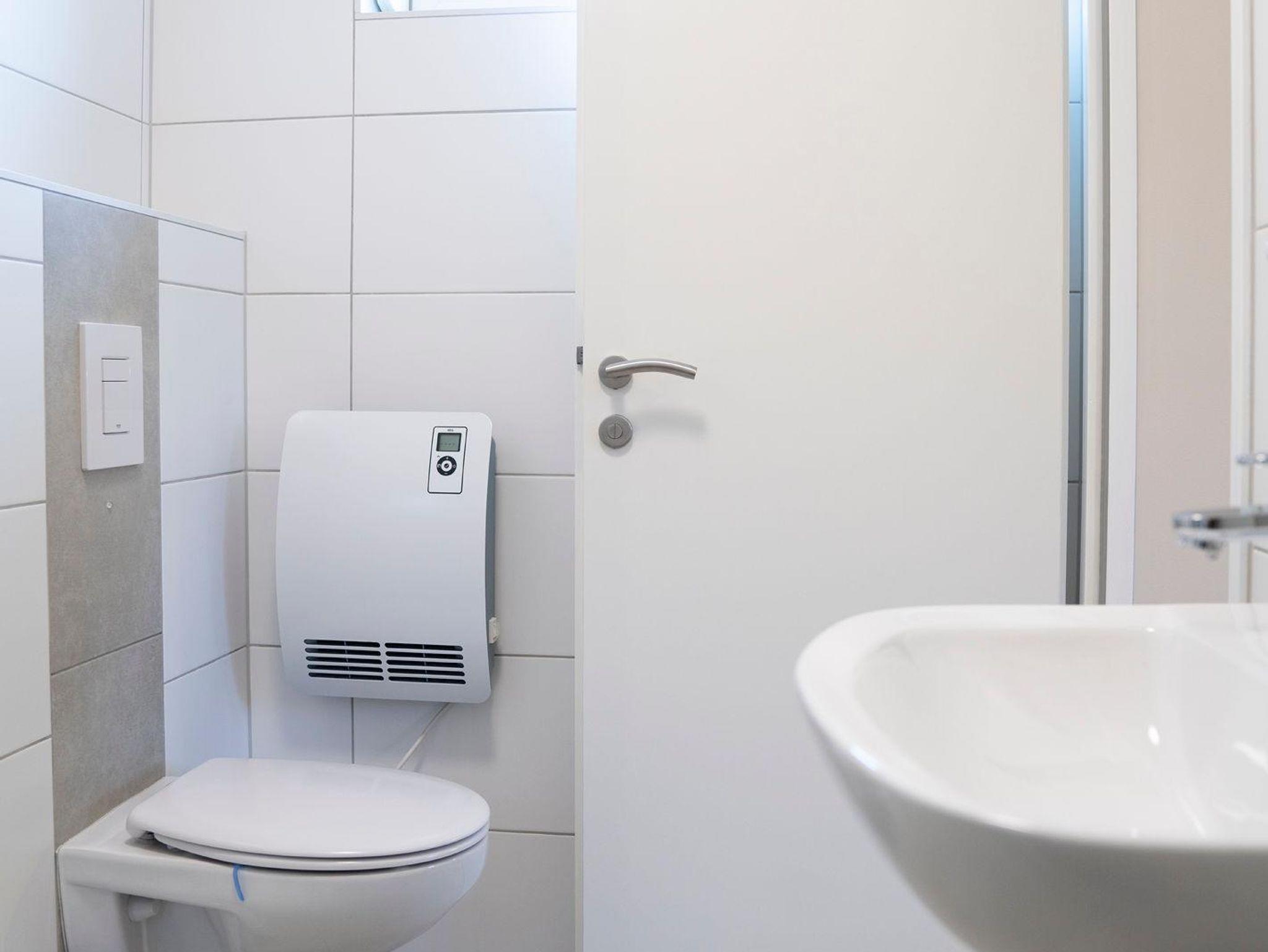 • Badezimmer mit Dusche, Toilette, Waschtisch, Spiegel, Föhn