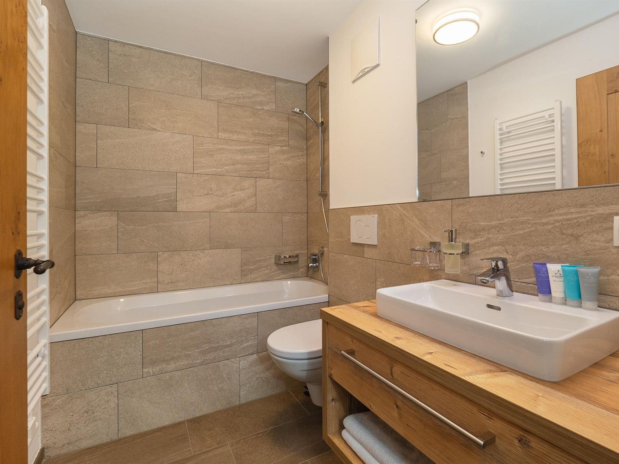 Das Chalet Viridi bietet Platz für bis zu 4 Personen auf einer Wohnfläche von 75m². Die zwei großzügigen, rustikalen Schlafzimmer sind mit einem bequemen, teilbaren Boxspring-Doppelbett, einem geräumigen Kleiderschrank und einem Nachttischchen ausgestattet. Jedes Schlafzimmer verfügt über ein eigenes modernes Badezimmer mit Waschbecken, Dusche oder Badewanne, WC, Haarföhn und einem Handtuchtrockner.