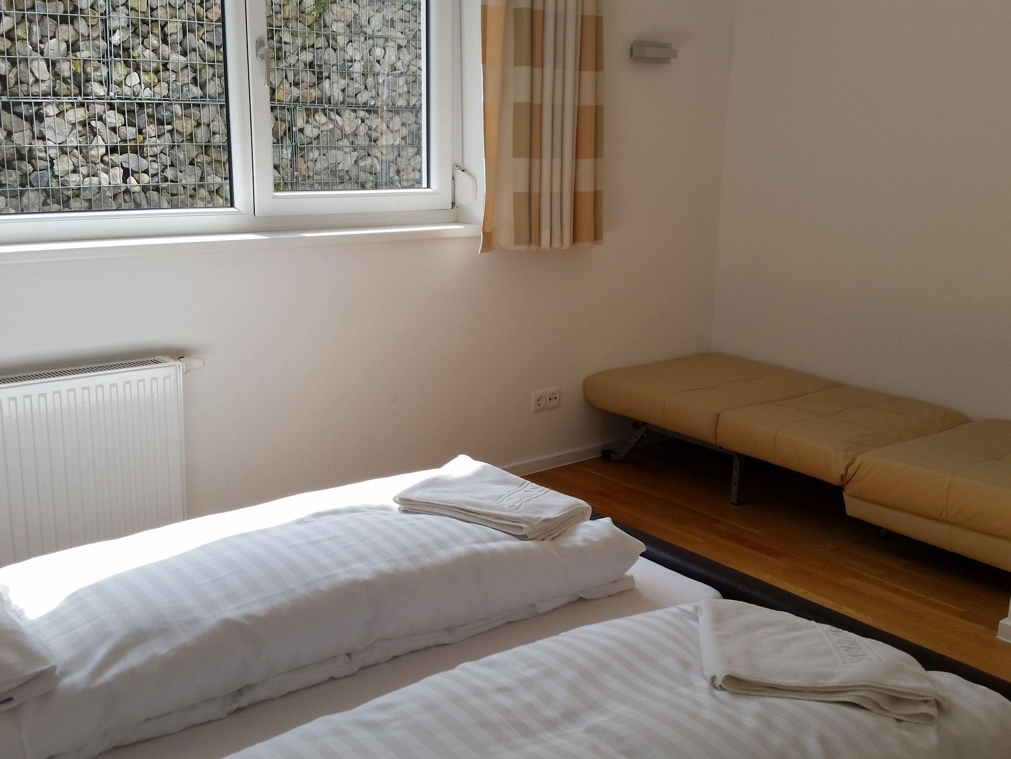 Dich erwarten 2 Schlafzimmer (einmal Doppelbett und Einzelbett [Das Einzelbett ist von 1,80 Metern Länge.], einmal Doppelbett), Wohnküche, sowie 2 Badezimmer (einmal inklusive Badewanne, WC und Waschbecken - einmal inklusive Dusche, WC und Waschbecken).