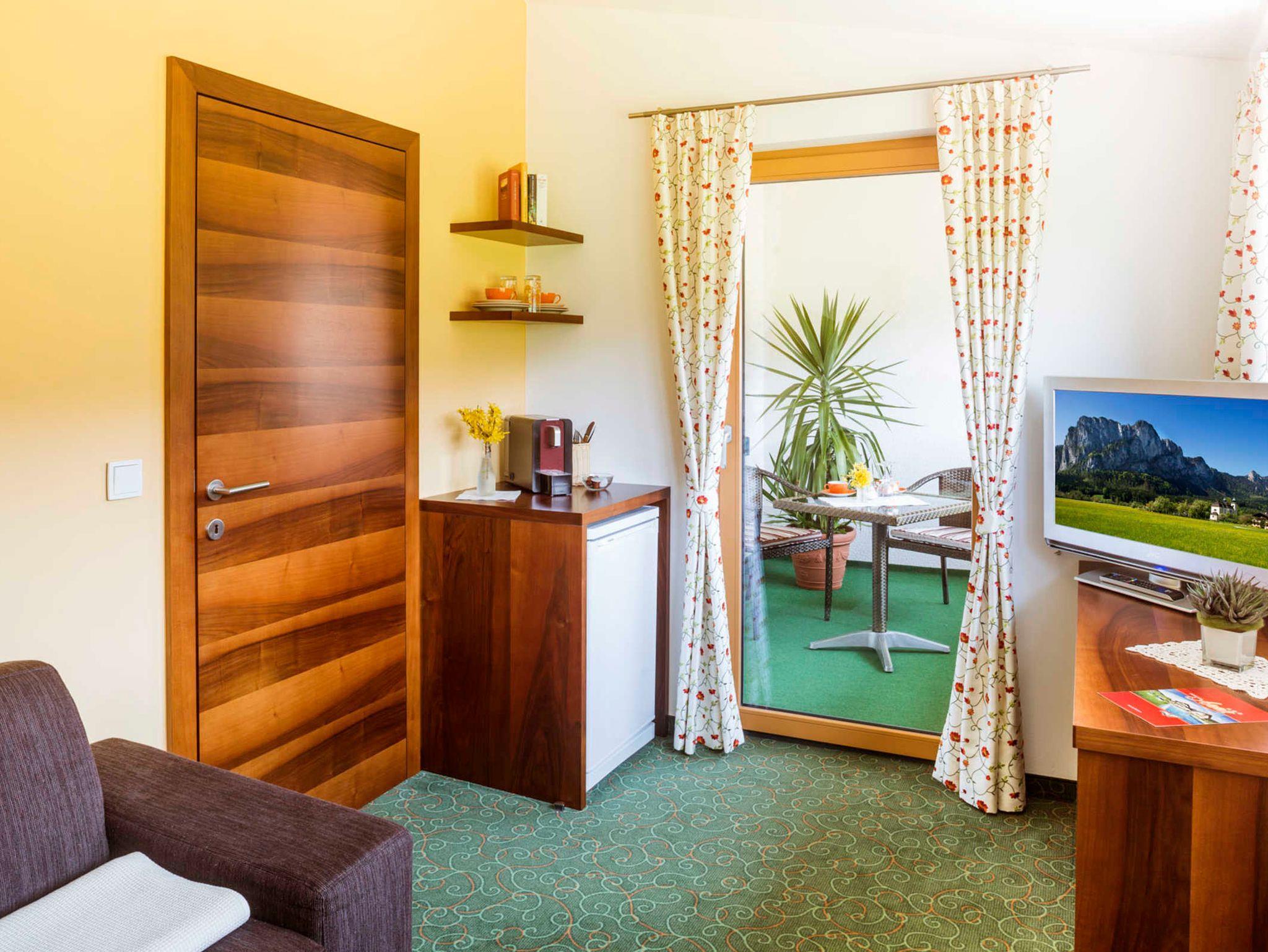 Die Sonnen Suite richtet sich mit Blick auf saftige Wiesen und Wälder, Mittag und Nachmittag Sonne. Das Besondere an dieser Suite ist die Abendsonne, welche Sie bis zum Sonnenuntergang genießen können. Die Wohneinheit ist im 2. Stock und mit dem Personenlift bequem erreichbar. Die Raumaufteilung ist wie folgt: Ein Schlafzimmer, ein Jugendzimmer, Wohnzimmer mit Kühlschrank, Kaffeemaschine, 2 TV, Dusche und WC getrennt, sowie eine überdachte Terrasse Richtung Süden.
