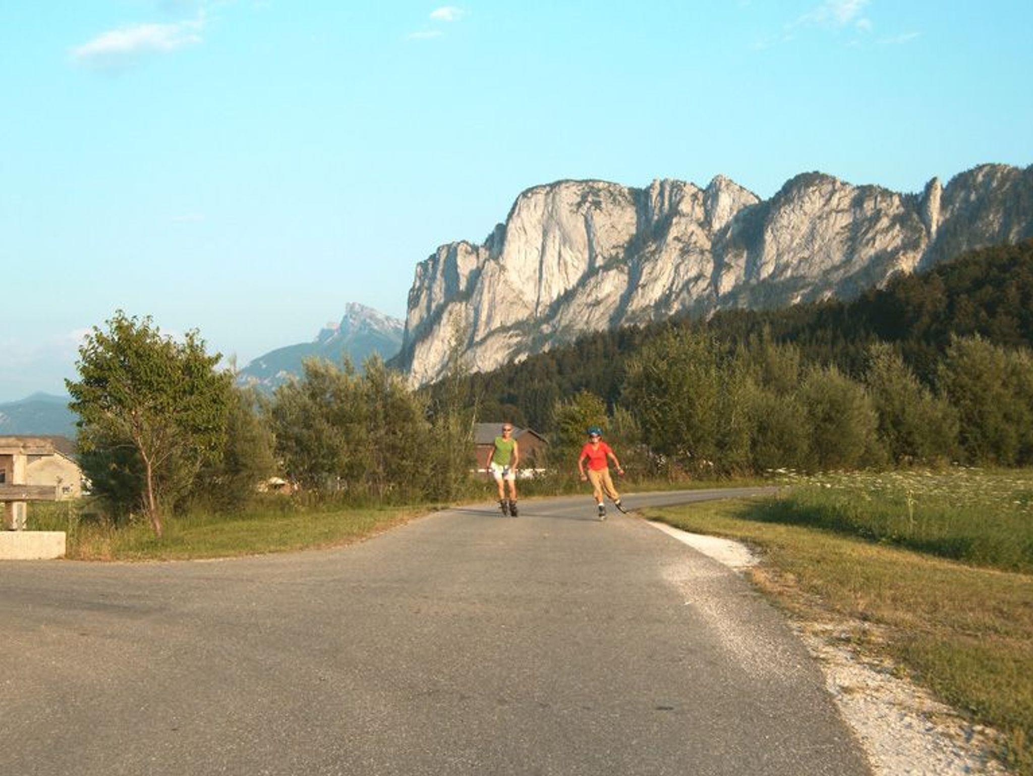 Vom Balkon aus sehen Sie über die Wiesen hinweg den Schafberg und die Drachenwand.