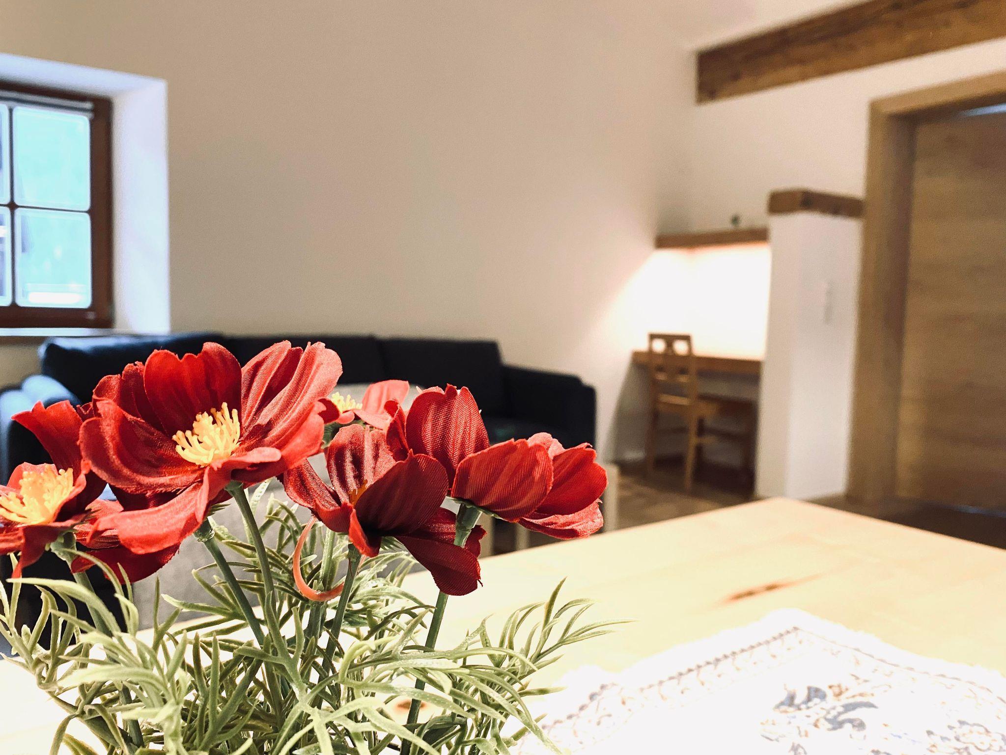 Unsere größte Ferienwohnung erinnert mit ihrer Deckenhöhe von über 5 Metern und den sichtbaren Altholz-Balken an ein gemütliches Loft.