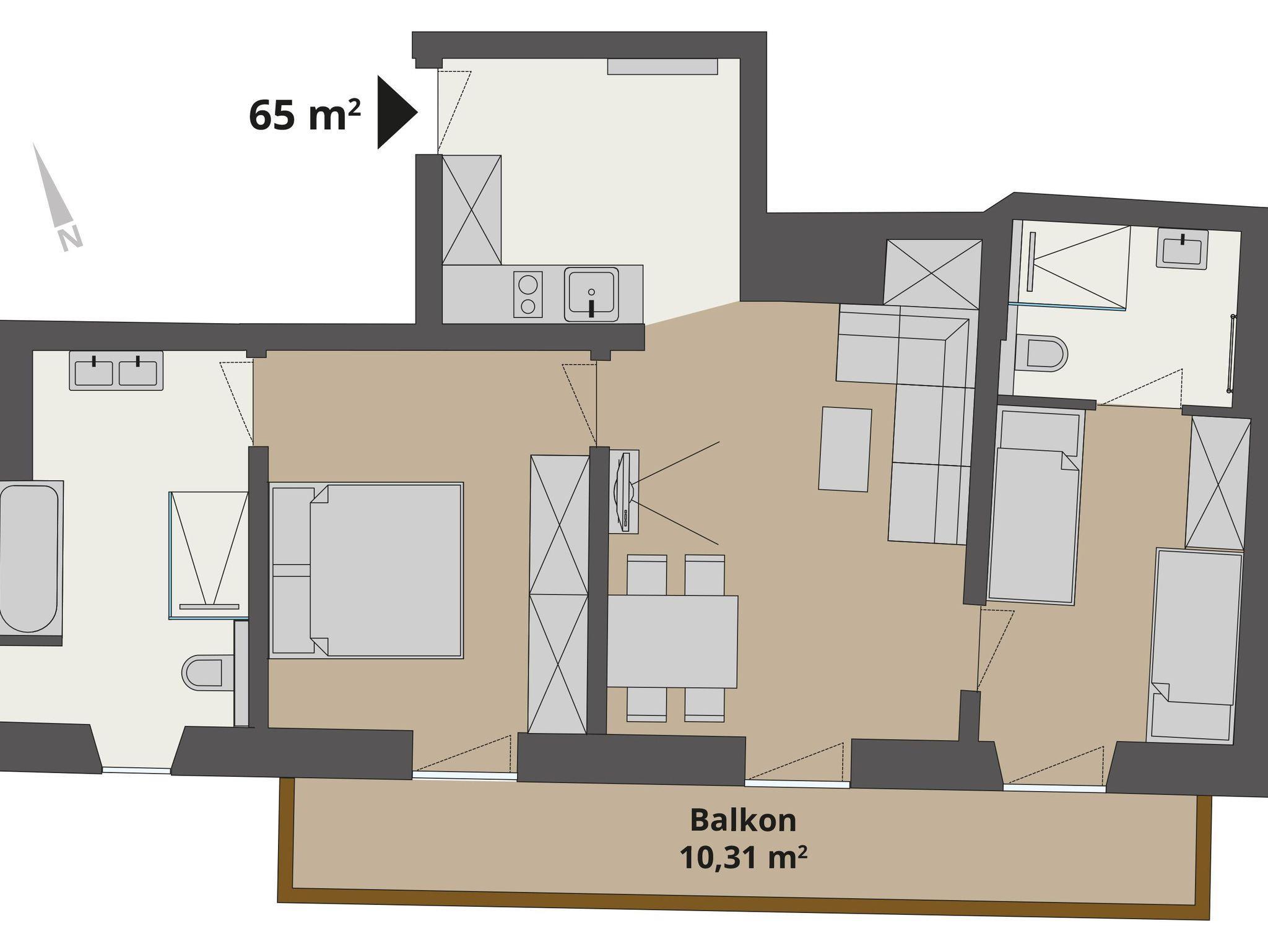 Das Appartement mit eigenem Balkon bietet auf 65m² Platz für 2-5 Personen. Es besteht aus einer geräumigen Küche, einem gemütlichen Wohnbereich mit Eck-Sofa und Essplatz, zwei Schlafzimmern mit jeweils eigenem Bad mit WC.