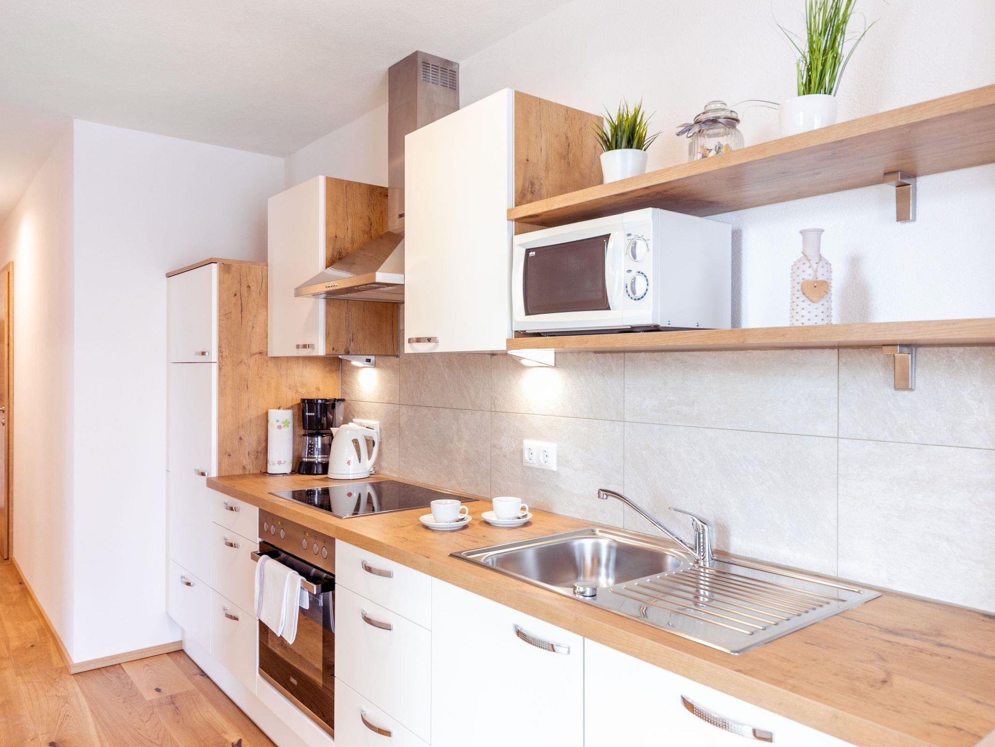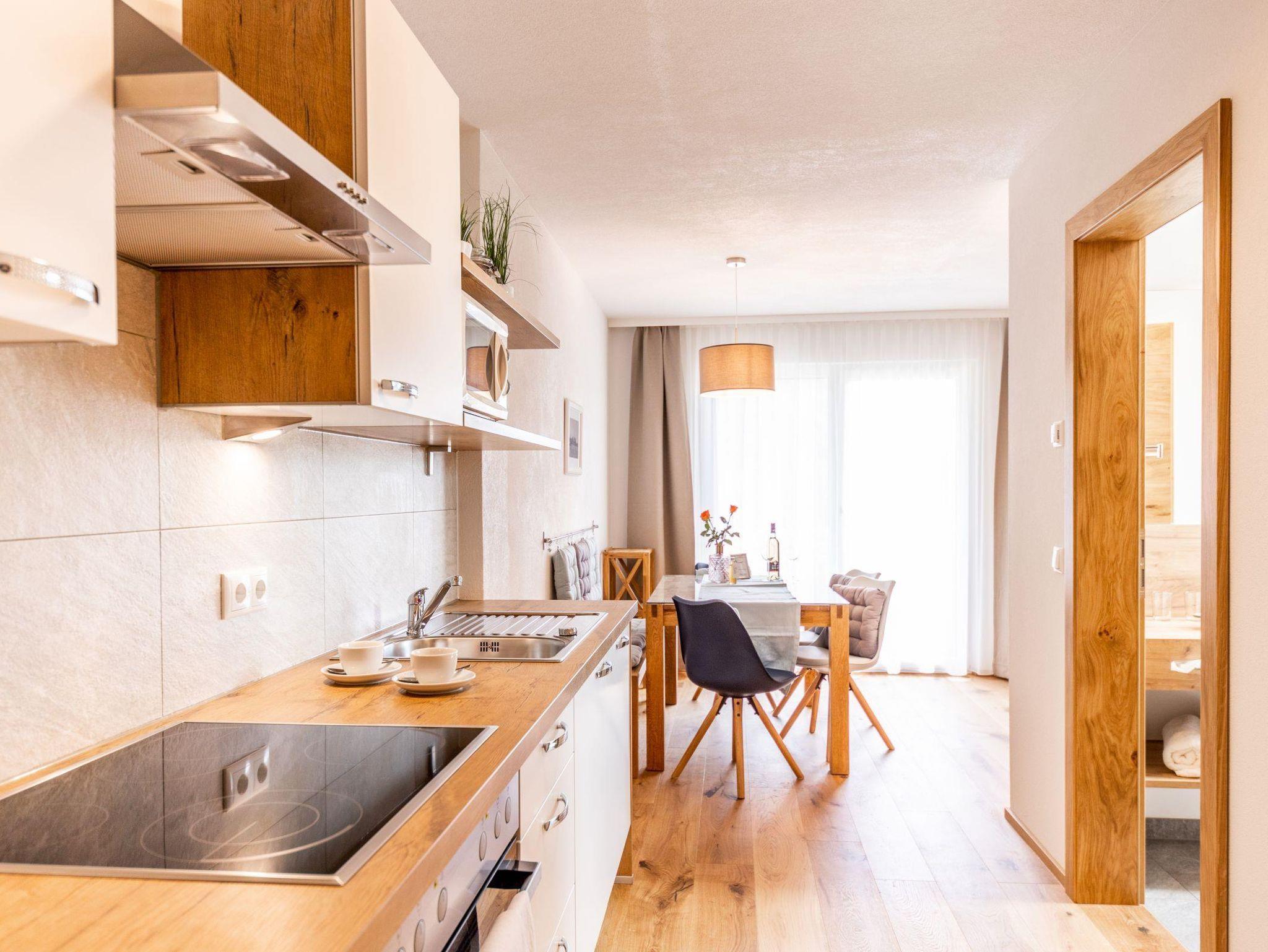 Unsere Apartment Petzen ist ideal für größere Familien mit bis zu 4 Kindern oder Freundesgruppen. Hier genießt ihr einen kleinen Ost-Balkon mit Blick auf den Pool sowie einen hellen Wohn-Essbereich mit einer großen Ausziehcouch, zwei separate Schlafzimmer mit zusätzlich Platz für ein Gitterbett. Überdies ist die Küche voll ausgestattet. In den Schlafzimmern finden sie Zirben-Vollholzmöbel.