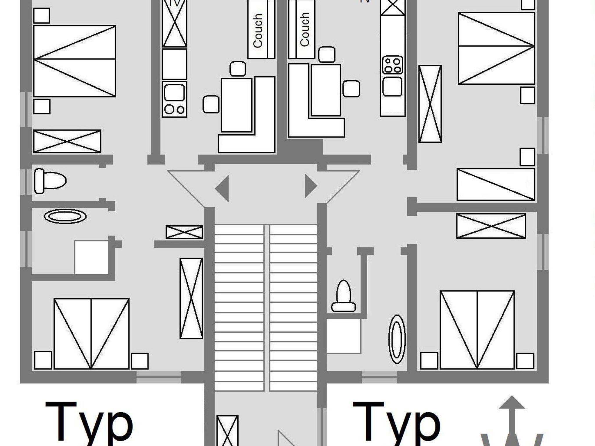 Wir haben 2 Ferienwohnungen Typ B, die etwas größer sind ca.60m2. Wohnung 2 im 1.Stock rechts und Wohnung 4 mit Dachschrägen im 2.Stock rechts. Hier besteht die Wohnküche aus einer Küchenzeile mit 4 Herdplatten, Backrohr, Spüle wie Geschirrspülmaschine, Kühlschrank und einen Essplatz mit TV. Es gibt 2 getrennte Schlafzimmer mit je einem Doppelbett. In Wohnung 4 gibt es im Großen Schlafzimmer noch ein Stockbett. In Wohnung 2 können auf Wunsch zwei Zustellbetten für eine 5. und 6. Person aufgestellt werden, ein Gitterbett wie ein Kinderhochstuhl ist in jeder Wohnung vorhanden. Das Badezimmer ist mit Waschbecken und einer Dusche ausgestattet, vom WC getrennt. Von der Wohnküche wie von einem der Schlafzimmer aus, kommen Sie auf den Balkon mit Blick auf den Garten, Liegewiese bzw. Spielplatz des Hauses. In den Wohnungen liegt ein Laminatboden.