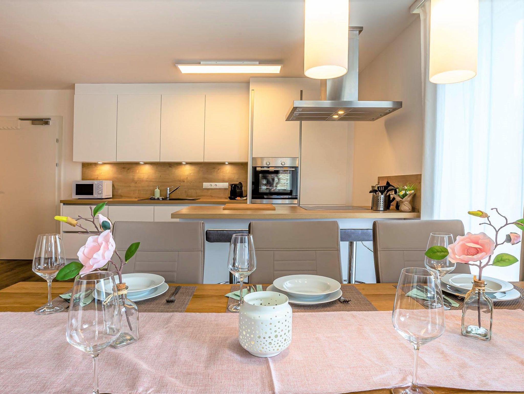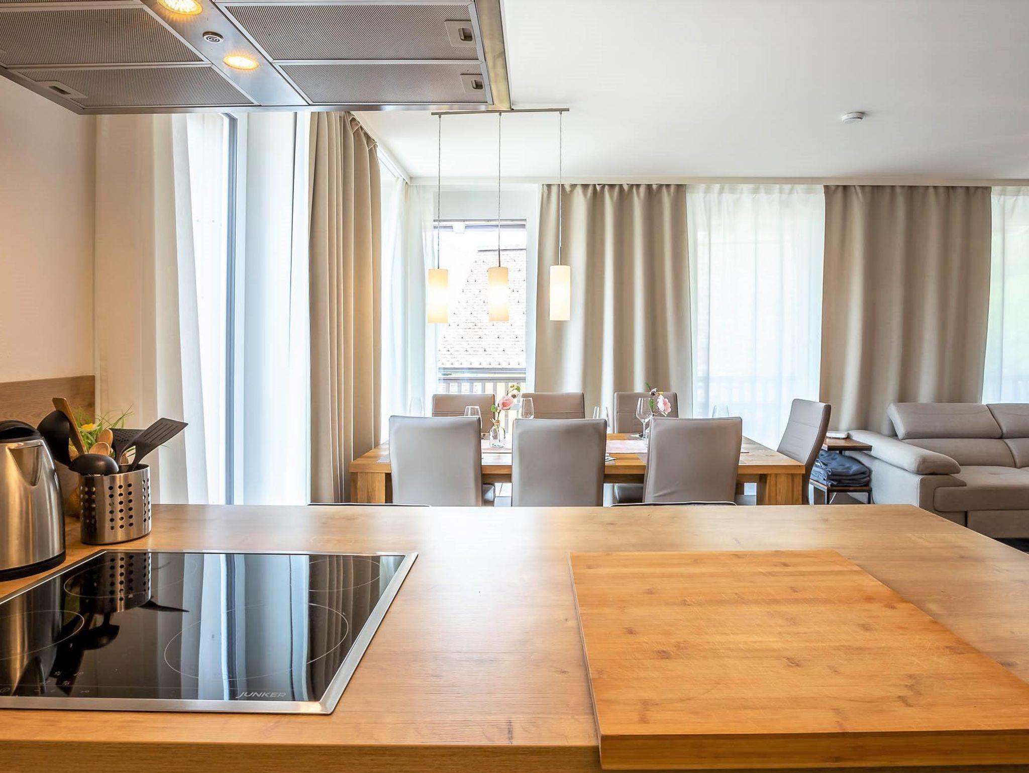Willkommen in Ihrer Ferienwohnung! Die Wohnung bietet ein Schlafzimmer mit Etagenbett und Schrank, ein Schlafzimmer mit Doppelbett und Schrank sowie ein Schlafzimmer mit eigenem Duschbad (WC im angrenzenden Raum). Der großzügige Wohnbereich verfügt über ein bequemes Sofa und einen Fernseher. Die offene Küche ist voll ausgestattet mit Herd, Kochfeld, Ofen, Toaster, Kaffeemaschine und allen nötigen Utensilien. Der Essbereich fügt sich harmonisch in den Raum ein. Alle Zimmer teilen sich einen Balkon mit herrlichem Blick auf die Berge – perfekt für Ihren Aufenthalt!