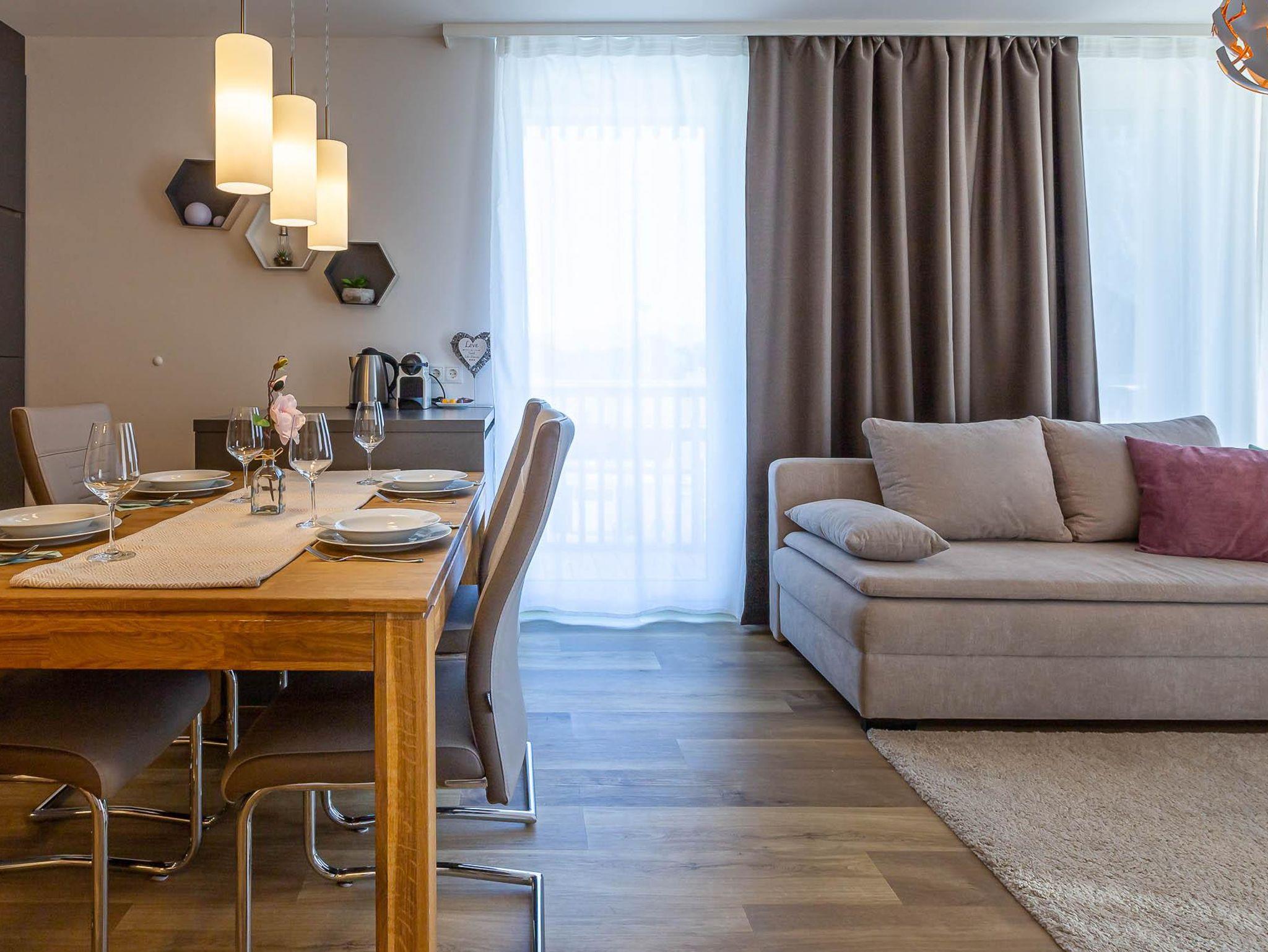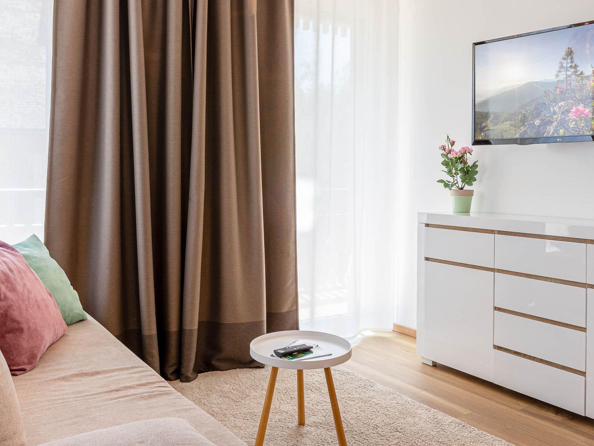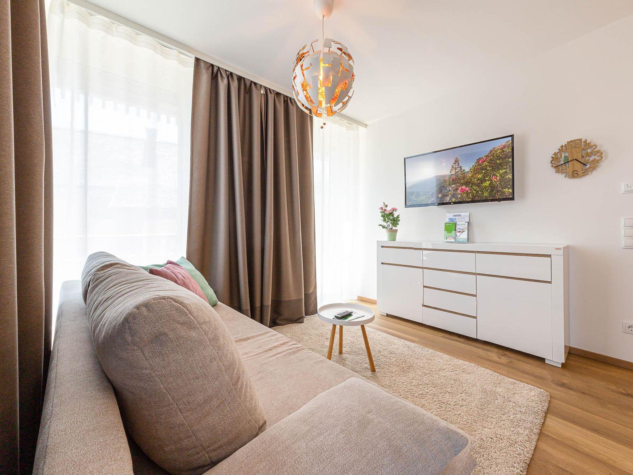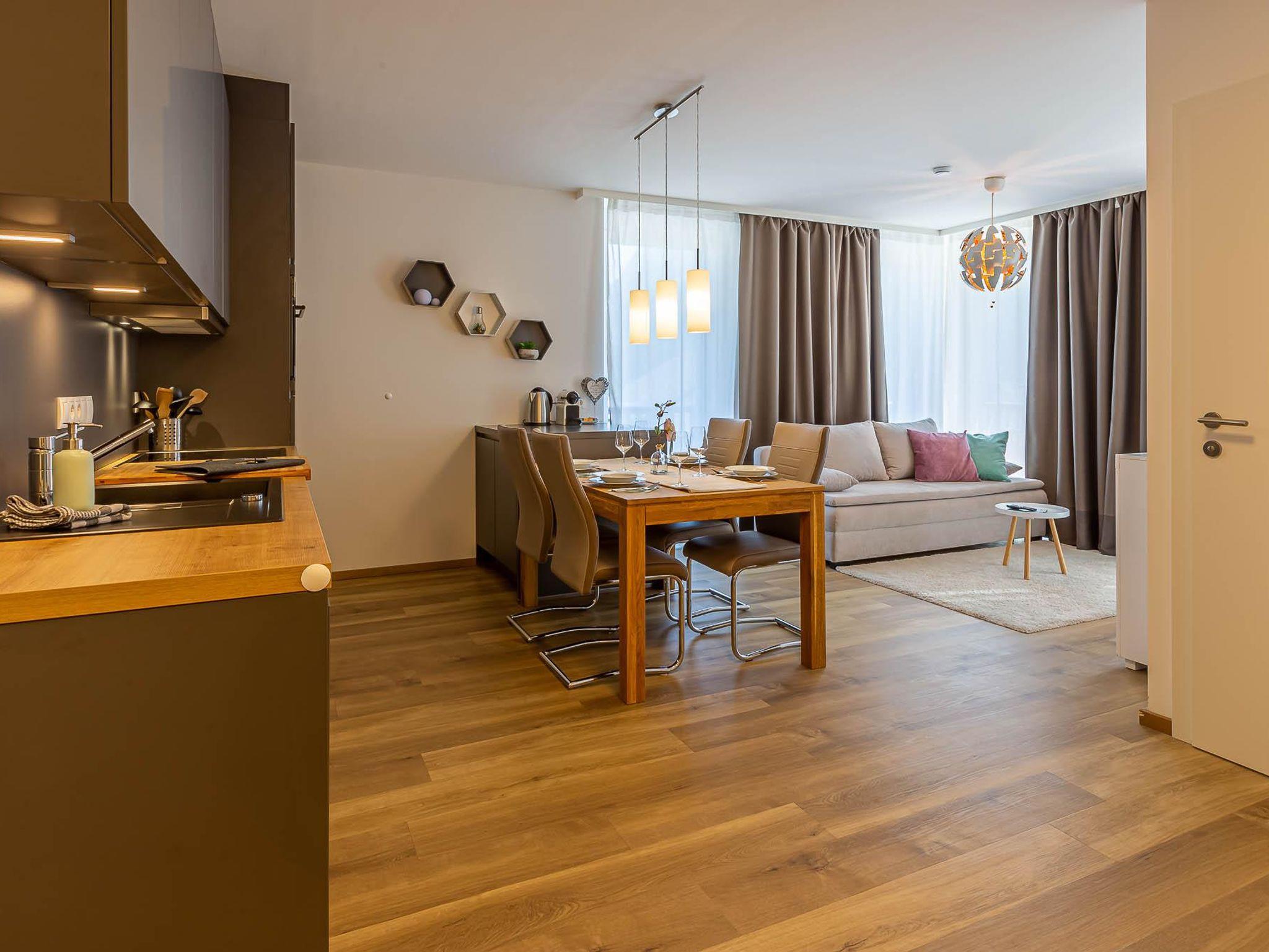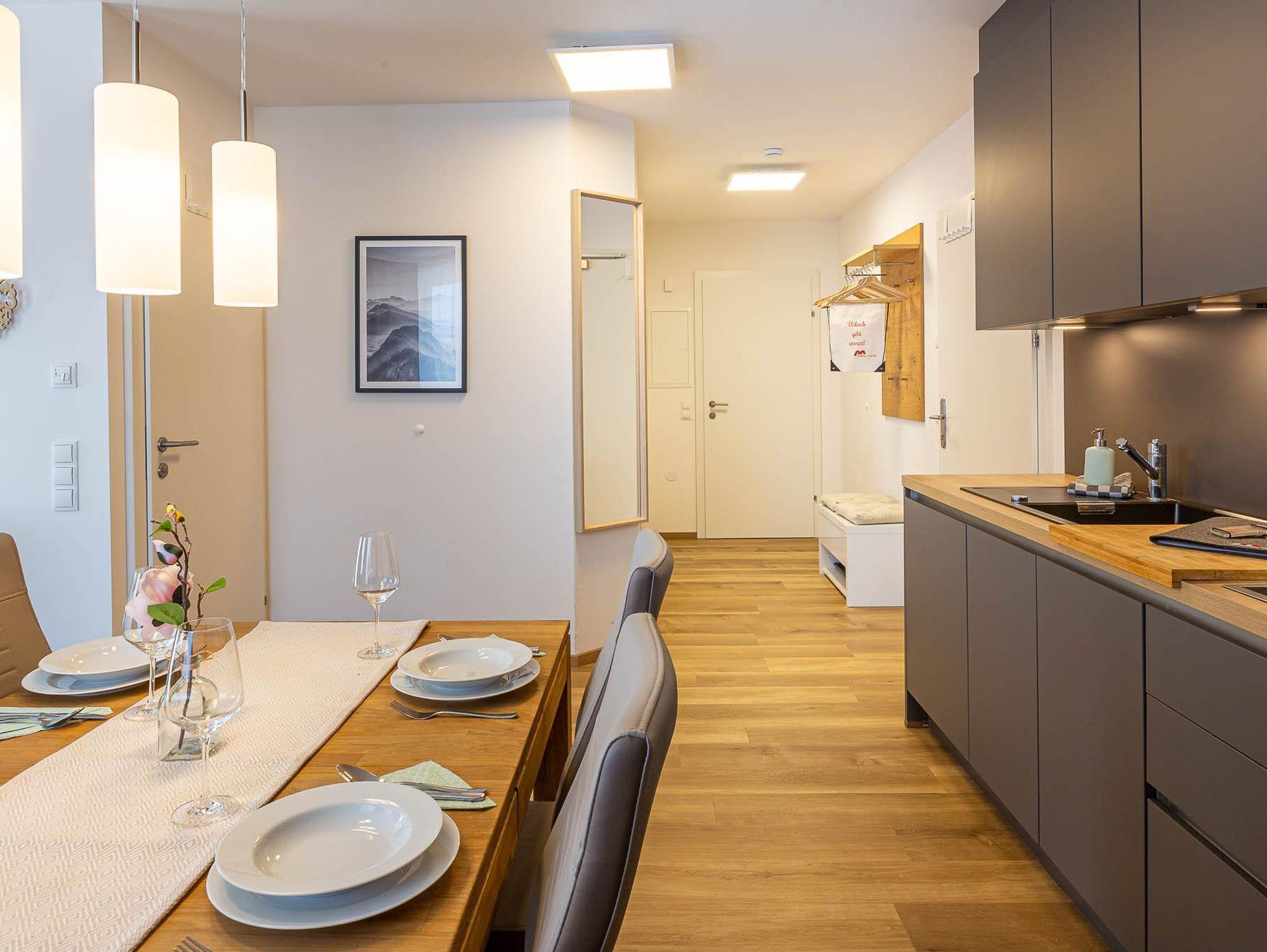 Willkommen in Ihrer neuen Ferienwohnung! Genießen Sie den Komfort eines separaten Schlafzimmers, eines separaten WCs und eines Badezimmers mit Sauna. Die moderne Küche ist mit dem Wohnbereich und einem Essplatz verbunden. Entspannen Sie auf der Terrasse mit herrlichem Blick auf die Berge. Die Wohnung im Erdgeschoss ist neu eingerichtet und bestens ausgestattet – perfekt für Ihren Aufenthalt!