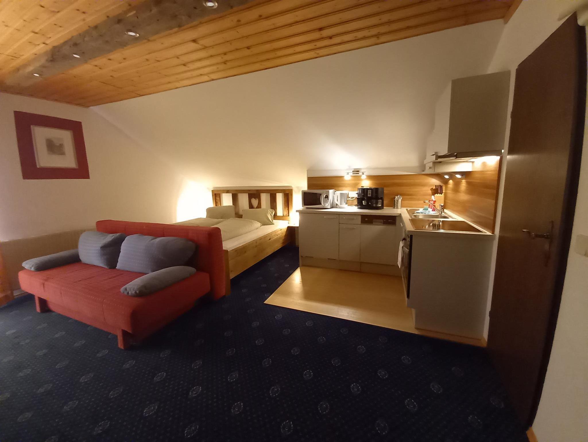 Das 35 m² große Studioappartement Saureggnock verfügt über ein gemütliches Doppelbett und eine Schlafcouch für bis zu 2 Personen. Dusche und WC sind hier getrennt. Die Küche ist voll ausgestattet mit Ceranfeld, Backrohr, Kühlschrank mit Gefrierfach, Mikrowelle, Geschirrspüler und Kaffeemaschine. Vom Balkon aus hat man einen wunderbaren Blick ins Tal.