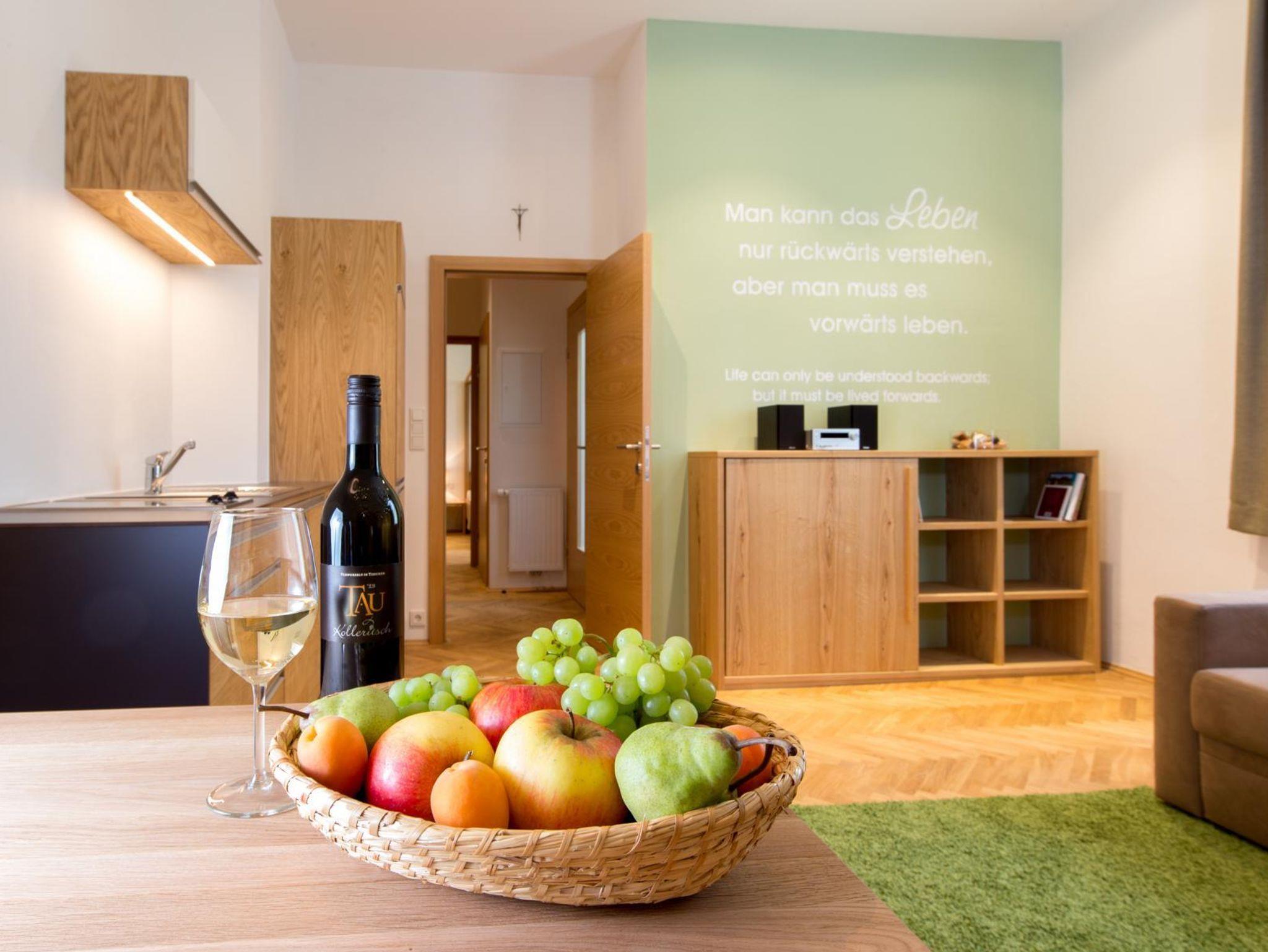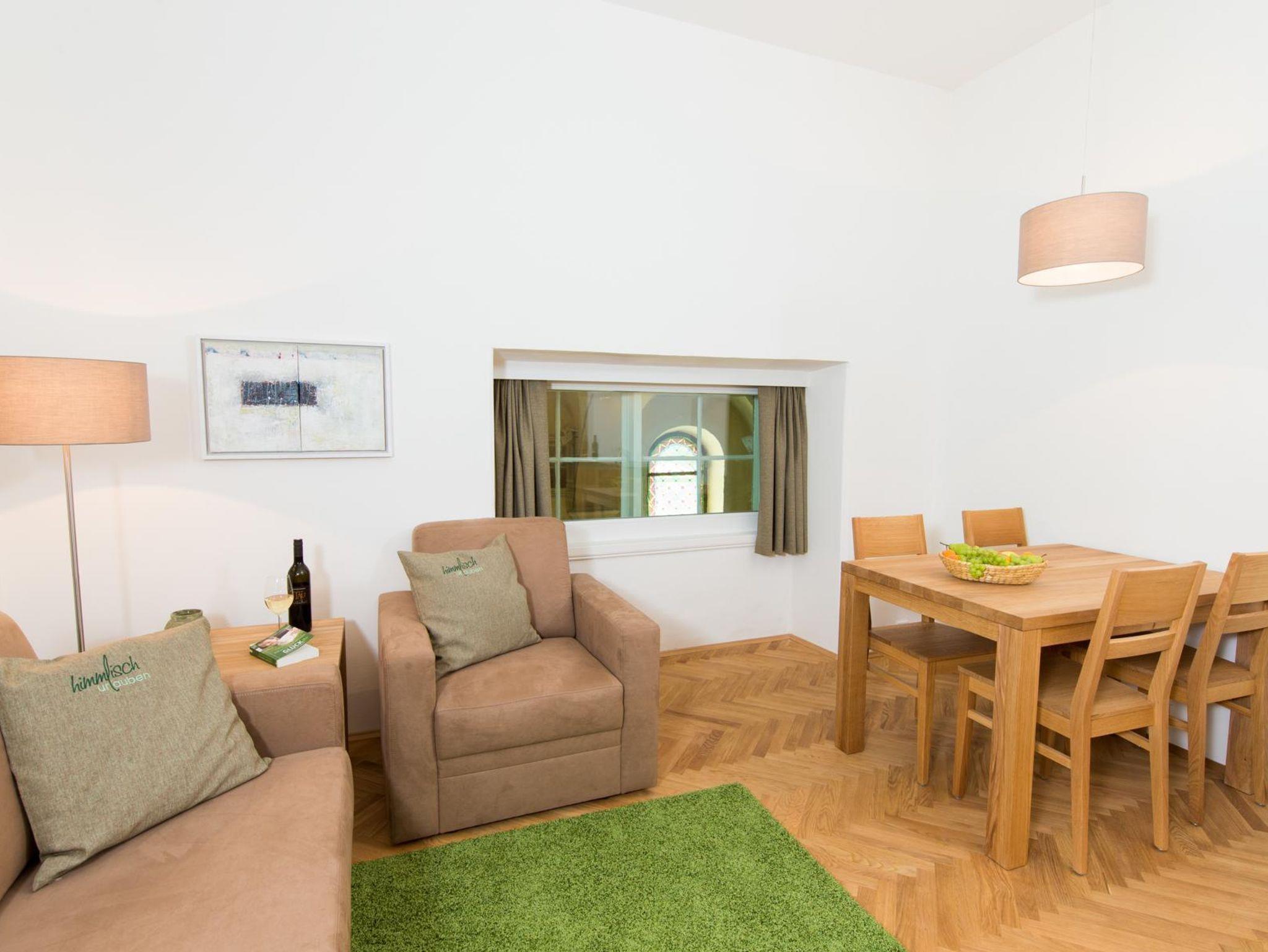 Von diesem Appartement haben Sie einen einzigartigen Ausblick: Direkt vom Wohnzimmer blicken Sie auf den Altar der angrenzenden Kirche. Viel Holz und natürliche Farben prägen das Appartement, das nach dem Pfarrpatron benannt ist. Ihre Unterkunft befindet sich im 1. Obergeschoss und bietet Ihnen eine ruhige, besinnliche Atmosphäre für zwei, maximal drei Personen.