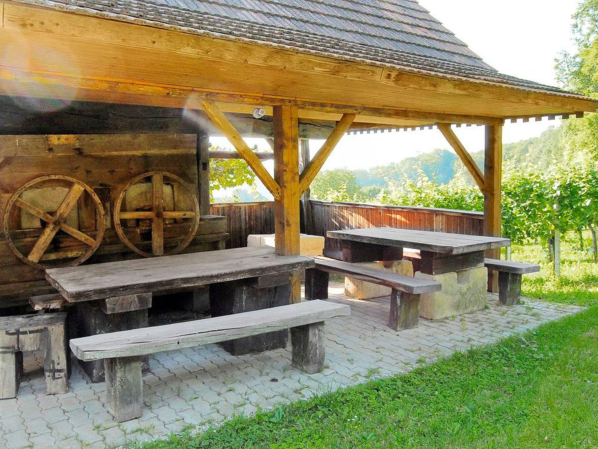 Es gibt auch eine alte Baumpresse zu bestaunen, nebenan gibt es einen Griller im Freien, wo man miteinander feiern und
