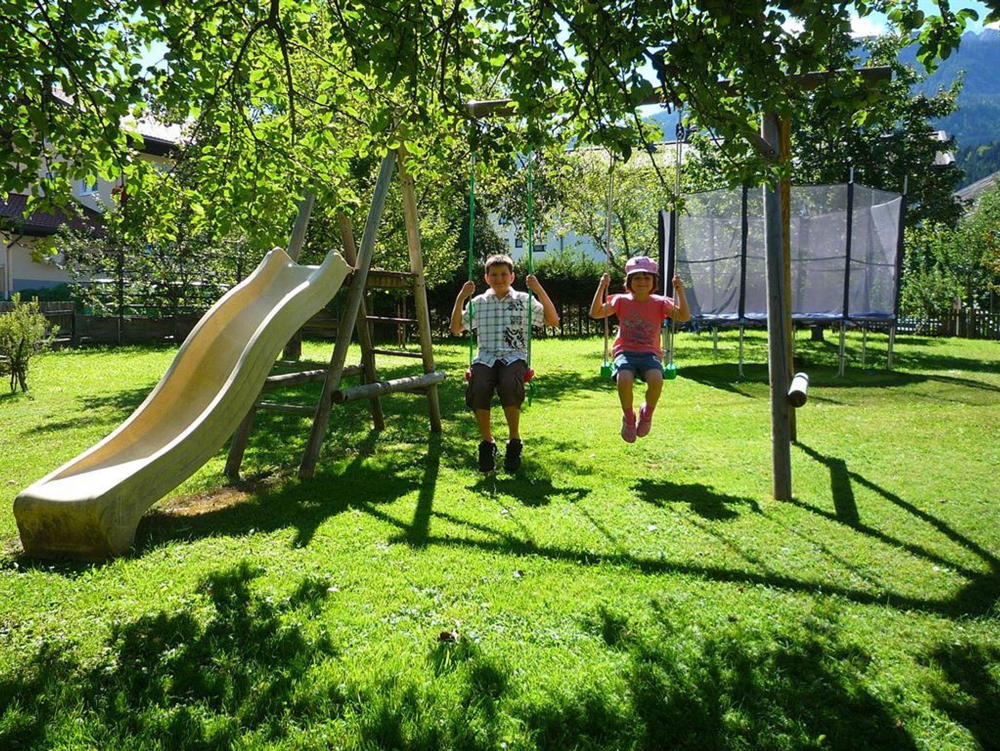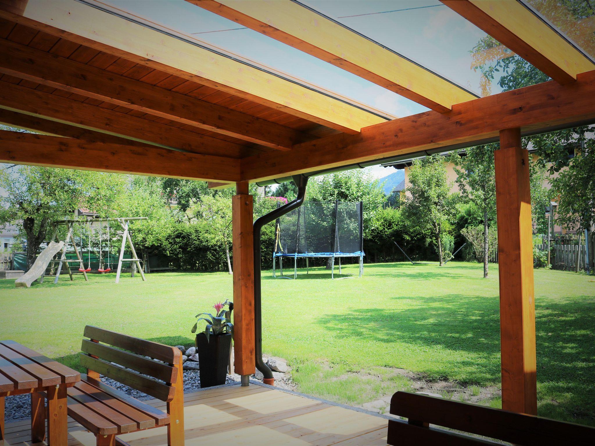 Südseitig gelegener Gästegarten mit überdachter Terrasse, gemütlichen Sitzmöglichkeiten, Liegestühlen, Griller, Tischtennis, Sonnenschirm, sowie Kinderspielplatz mit Schaukel, Trampolin und Sandkiste. Der Radweg führt direkt am Haus vorbei.