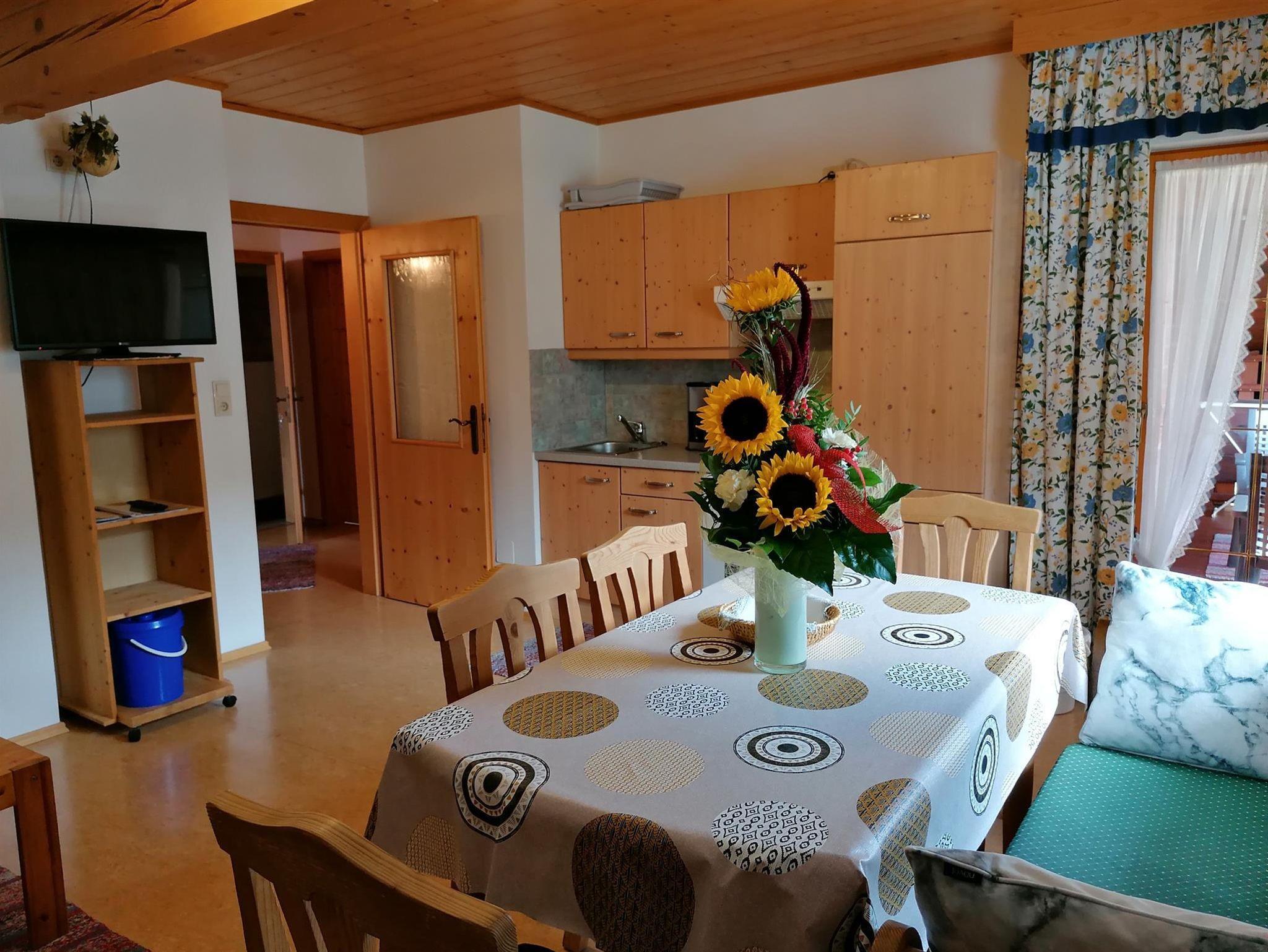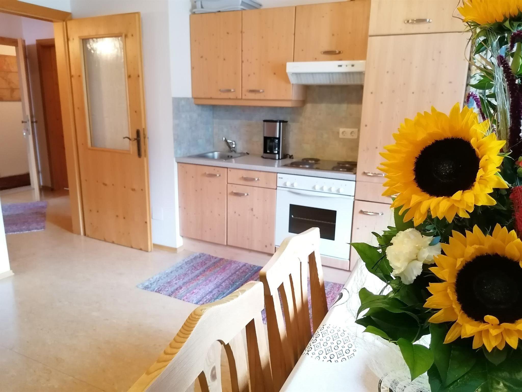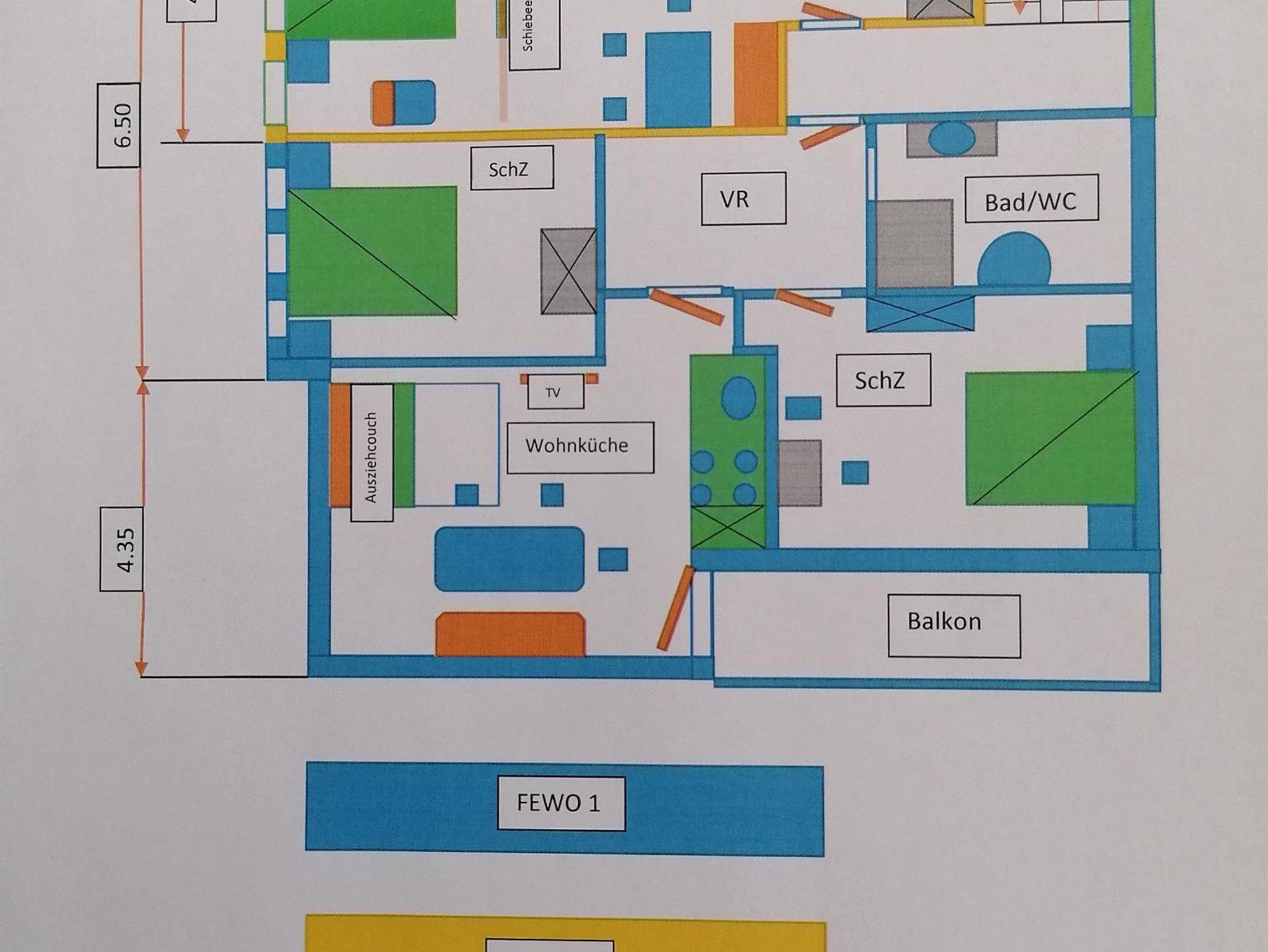 Ferienwohnung mit 70m² für 4-6 Personen und 2 getrennten Schlafzimmern, Wohnküche, Vorraum, Balkon, Dusche und WC. Sat-TV und Radio.