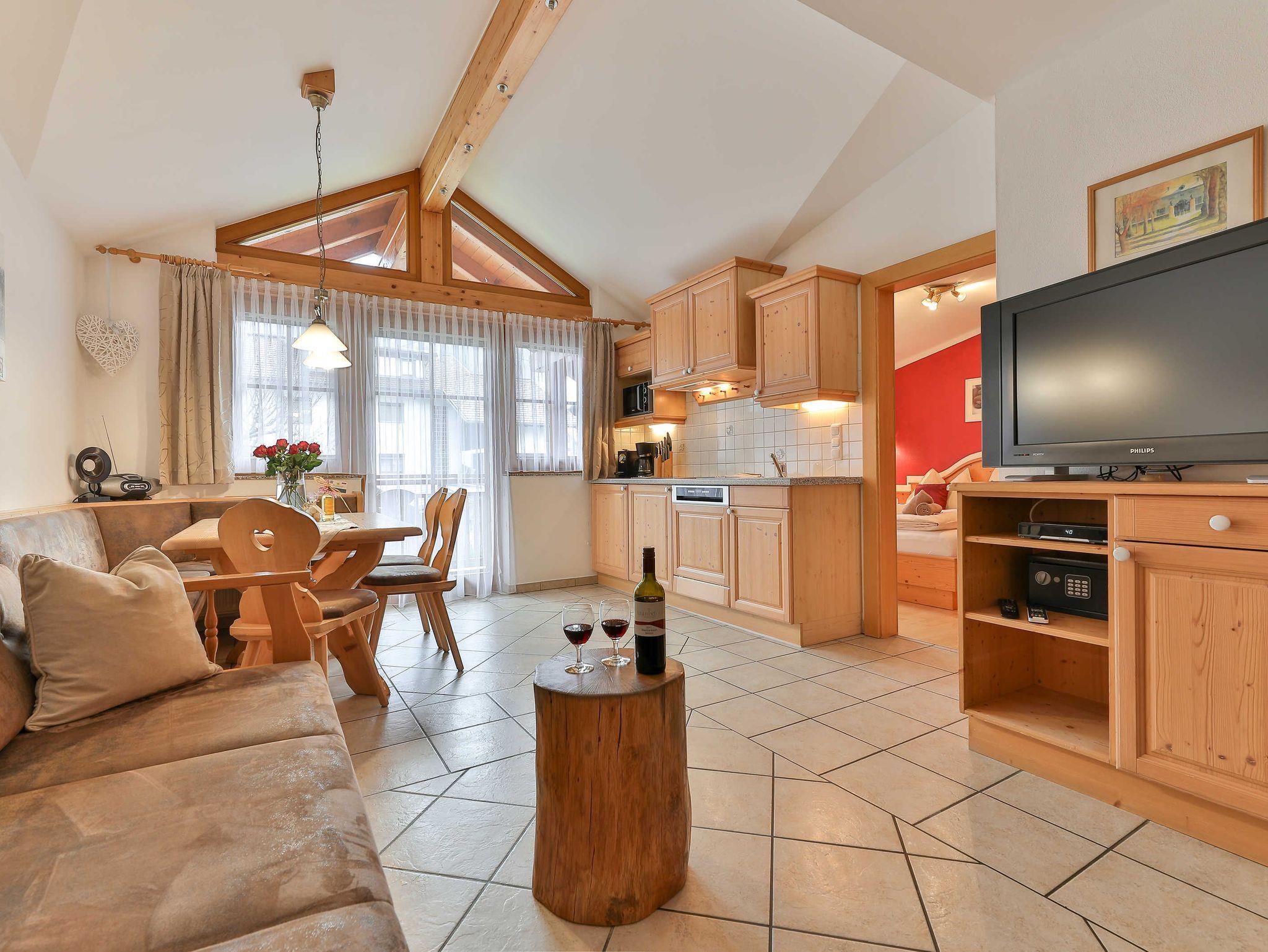 3 getrennte Schlafzimmer, Wohnküche mit ausziehbarem Sofa, Fußbodenheizung, bis 8 Personen, Bio-Vollholzmöbel, südseitiger Balkon mit Blick zur Talabfahrt, ca. 3 Gehminuten von der Talstation entfernt, ruhige Lage.