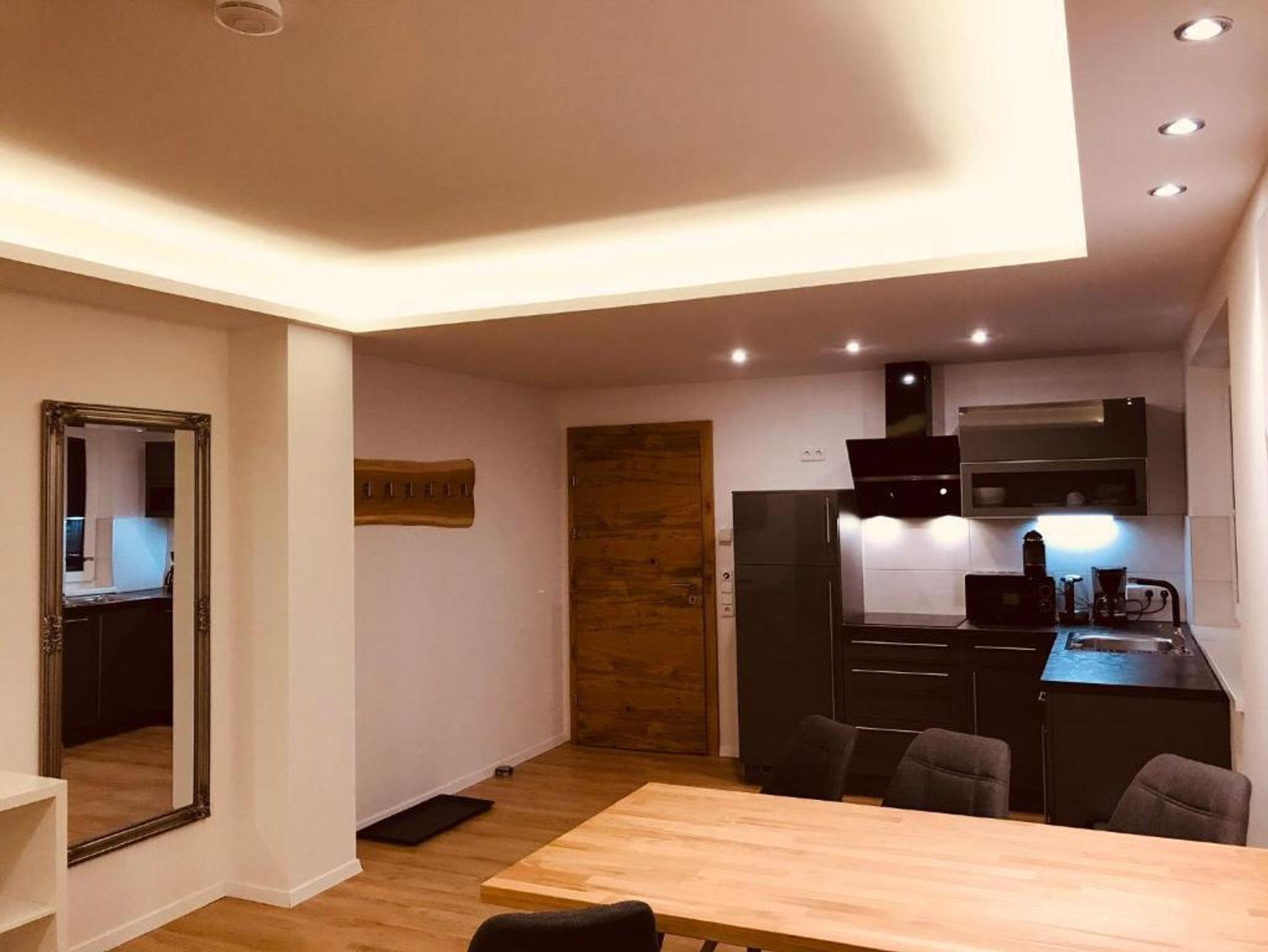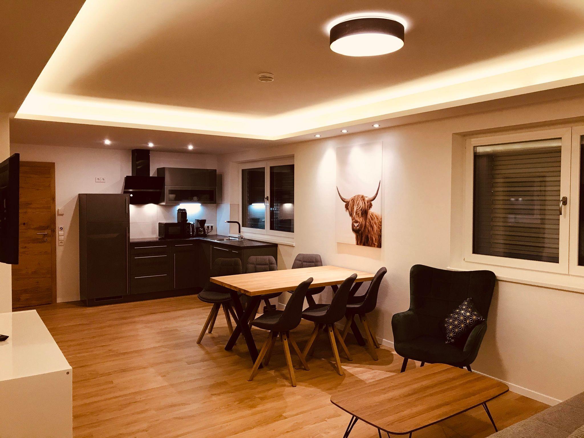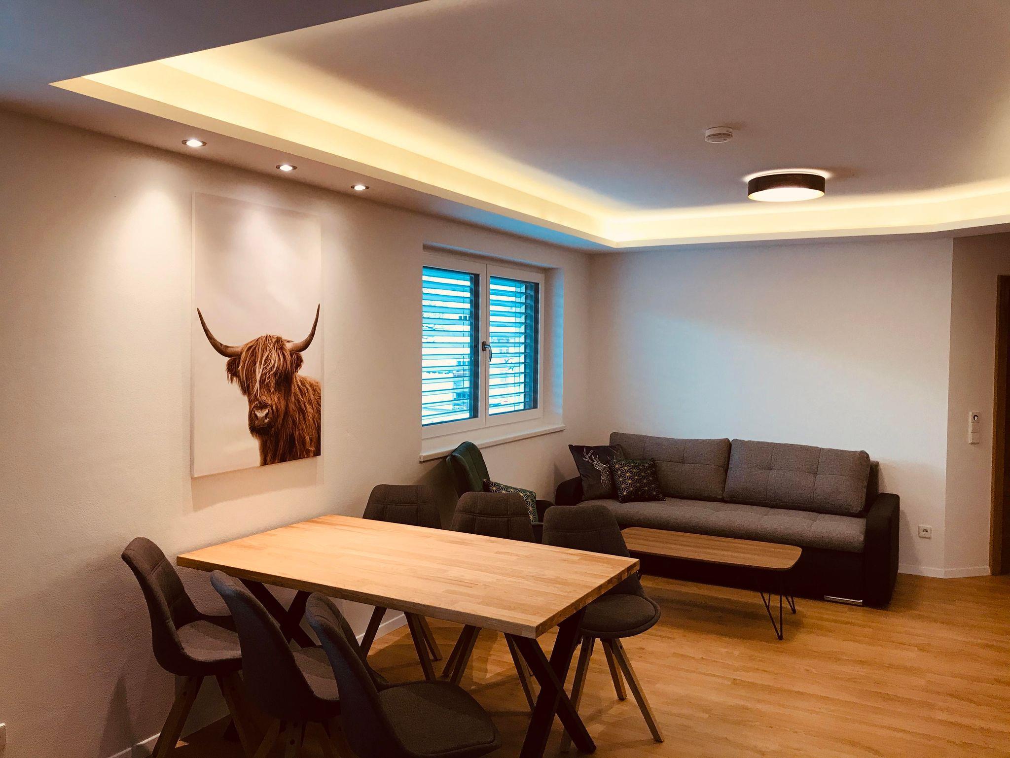 Modernes neues Apartment für 4 bis 6 Personen: 2 getr. Schlafzimmer, 1 gemütlicher Wohn-Schlafraum mit Sitzecke, 3 Smart-TV, Esstisch und komplett ausgestatteter Küche (4 Kochfelder Ceran, Kühl-/Gefrierschrank, Wasserkocher, Nespresso-Kapselmaschine,...). Bad mit Dusche, WC, Doppelwaschtisch; Infrarot- Sauna; Im 1. Stock mit Terrasse; WLAN kostenlos! Ruhig aber trotzdem zentral gelegen, nur wenige Fußminuten zum Millennium Express.