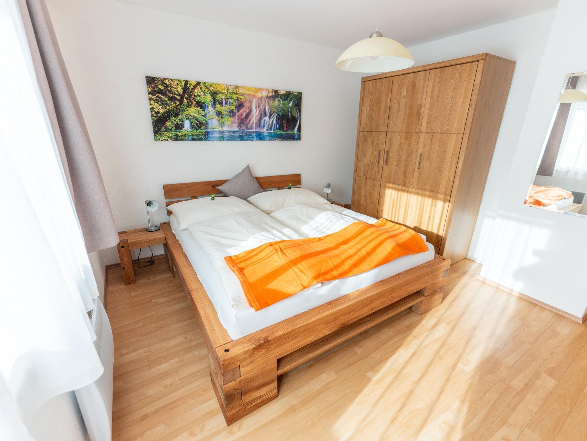 Ferienwohnung mit 70m² bestehend aus 3 getrennten Schlafzimmern, Balkon, Küche, Dusche, WC und TV. Sauna im Haus.
