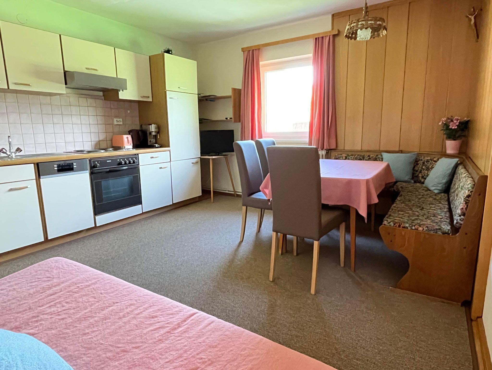 Die gemütliche Wohnküche ist mit einer Küchenzeile (Kühlschrank, 4-Platten Herd, Backrohr, Geschirrspüler, Spüle, Dunstabzug, Kaffeemaschine, Wasserkocher, Toater, Geschirr und Besteck), Sitzecke, Sofa und SAT-TV ausgestattet.