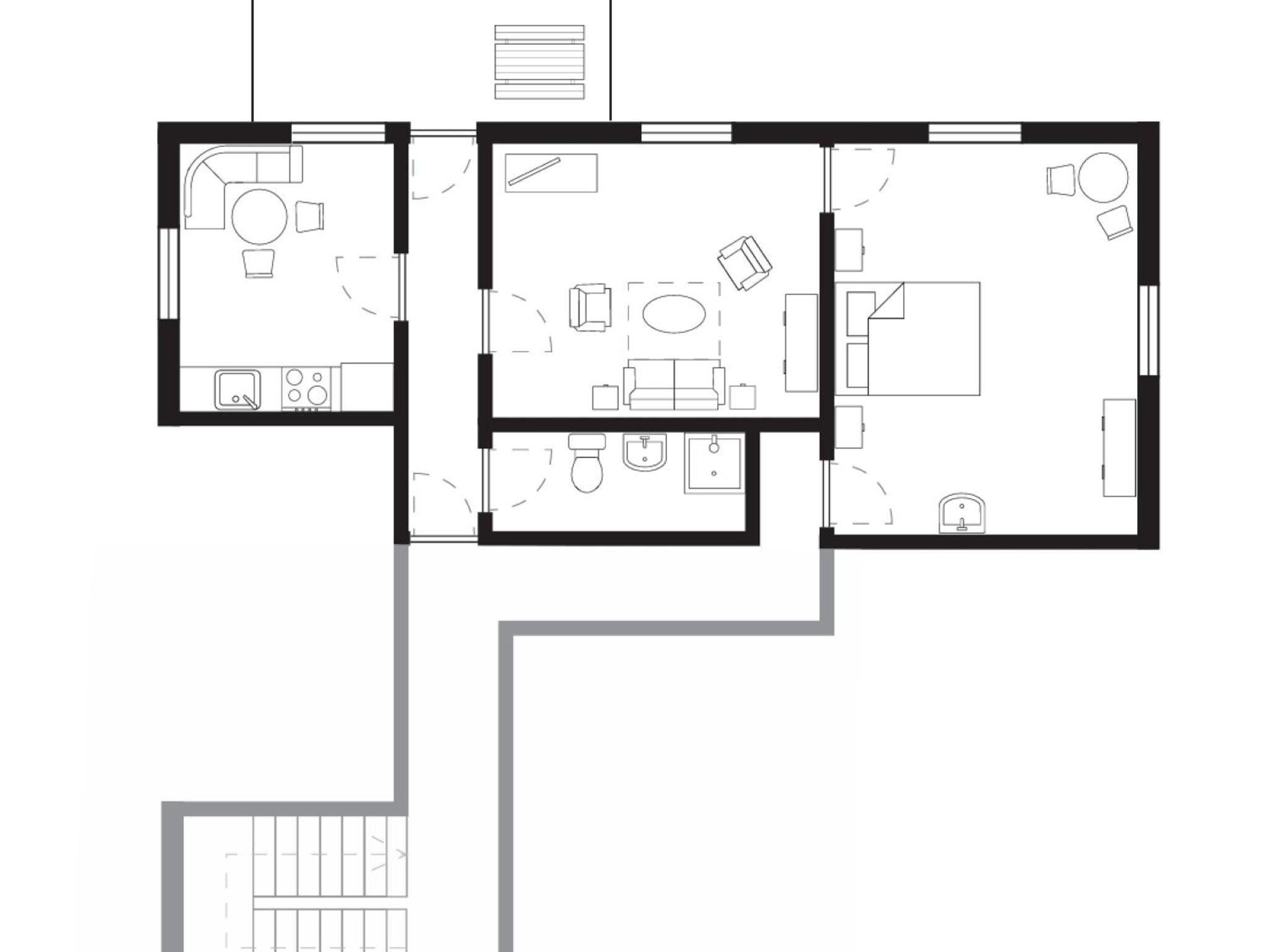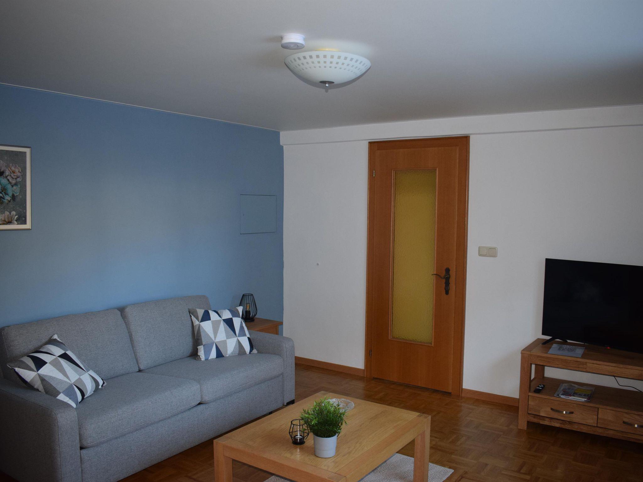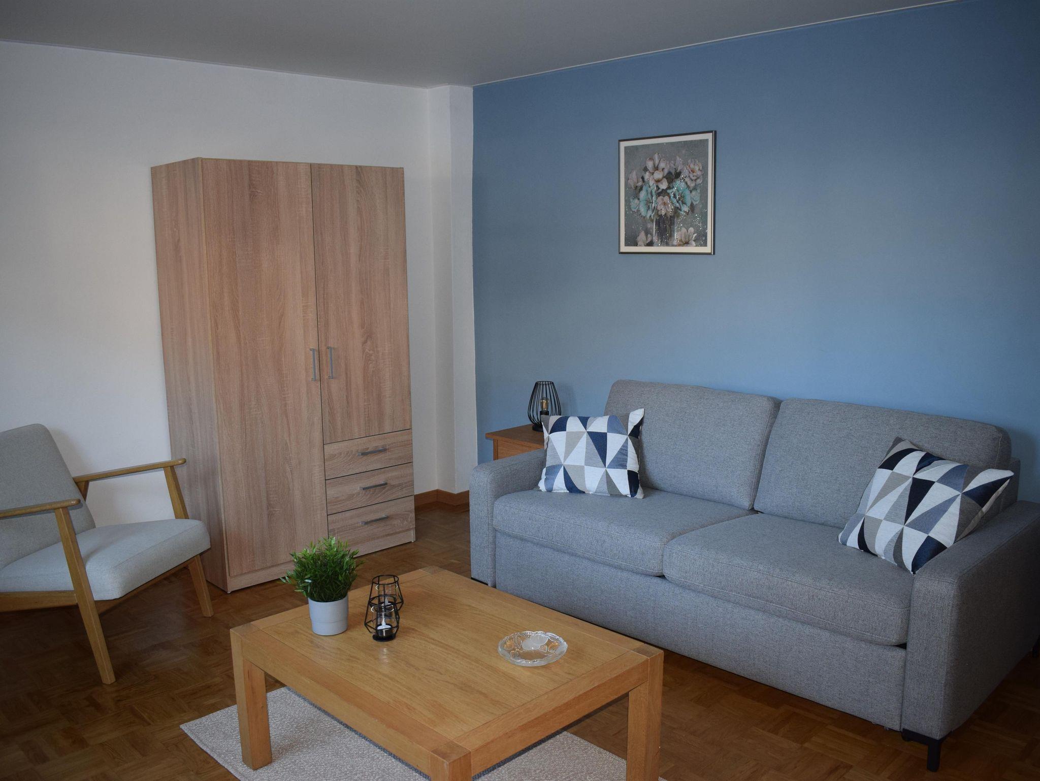 Sie verfügt über ein Wohnzimmer (optional mit Schlafsofa), ein separates Schlafzimmer und eine voll ausgestattete Küche mit Essbereich. Das Badezimmer bietet Dusche, Waschbecken und Toilette.