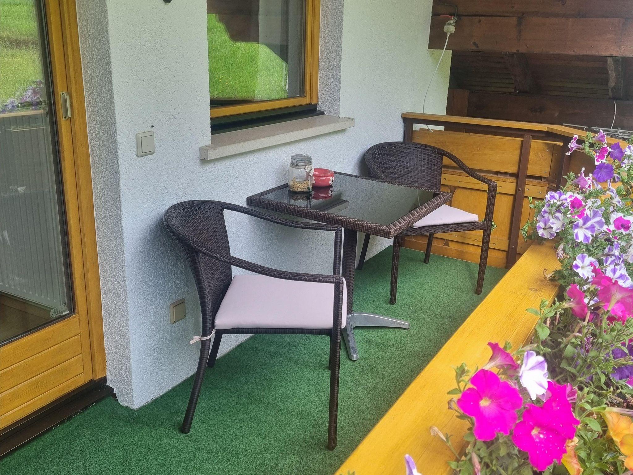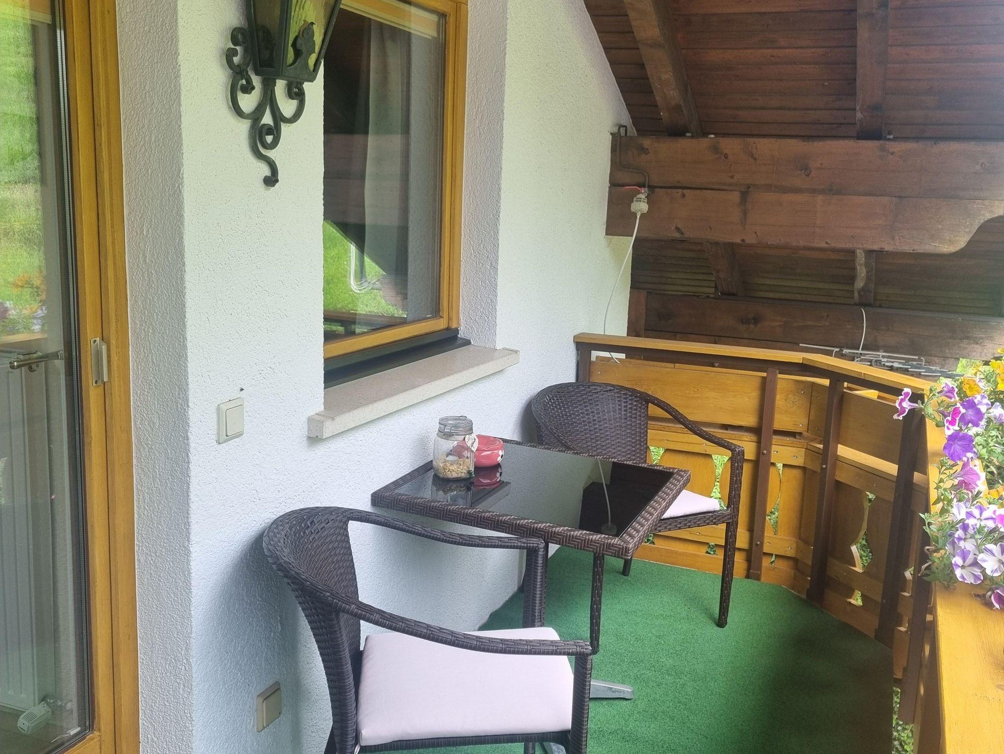 Überdachter Balkon mit Sitzgelegenheit und Bergblick
